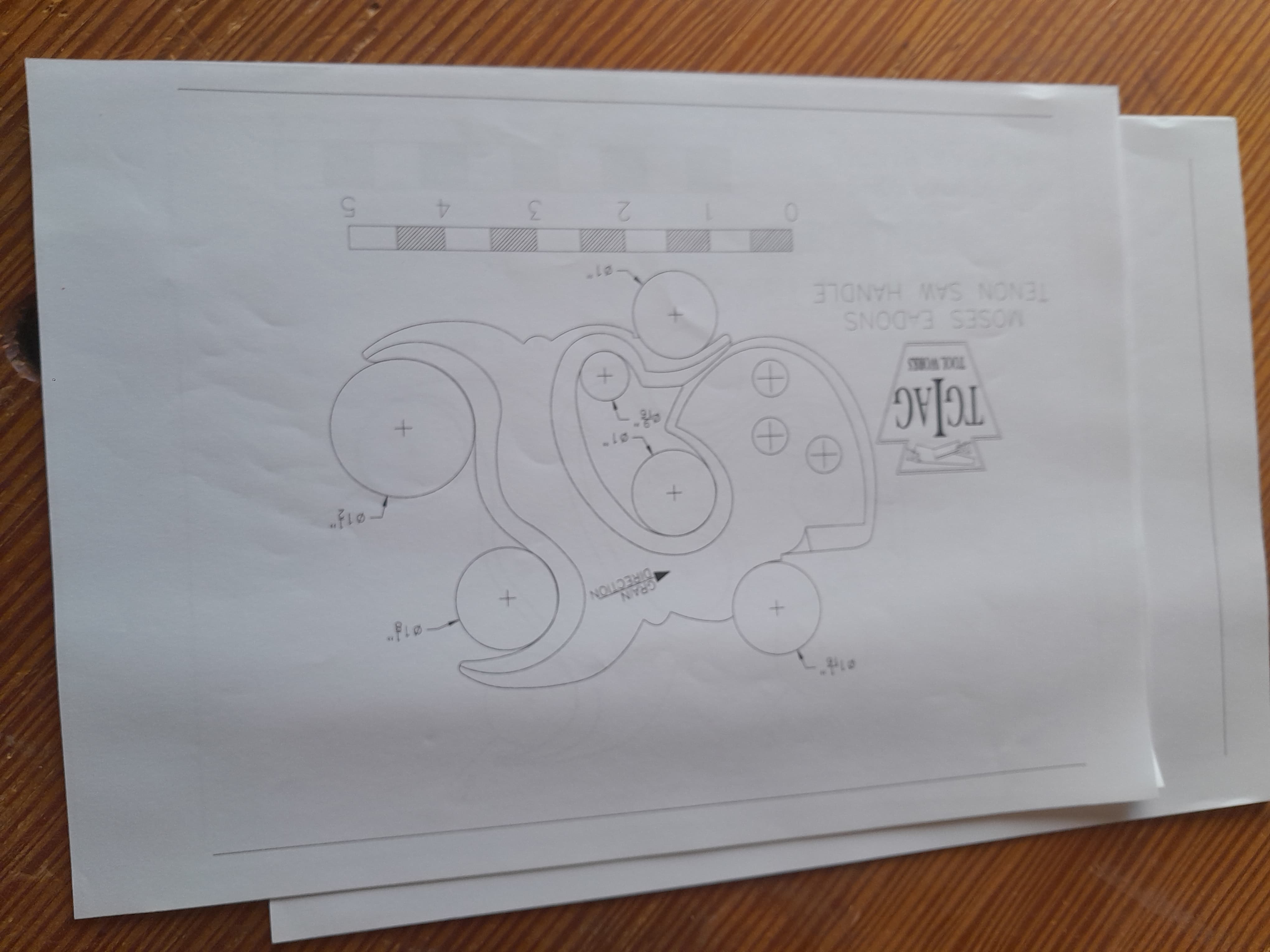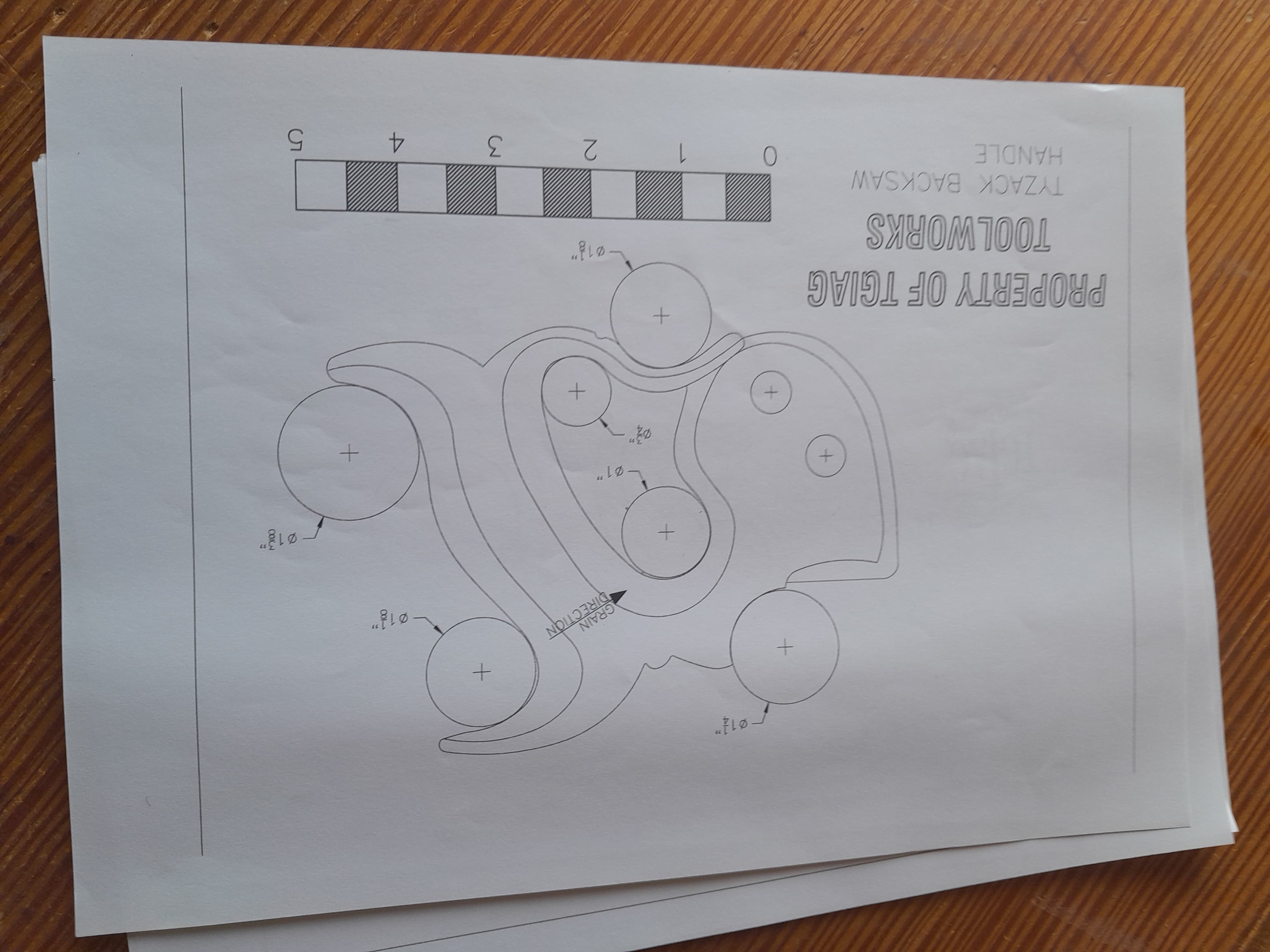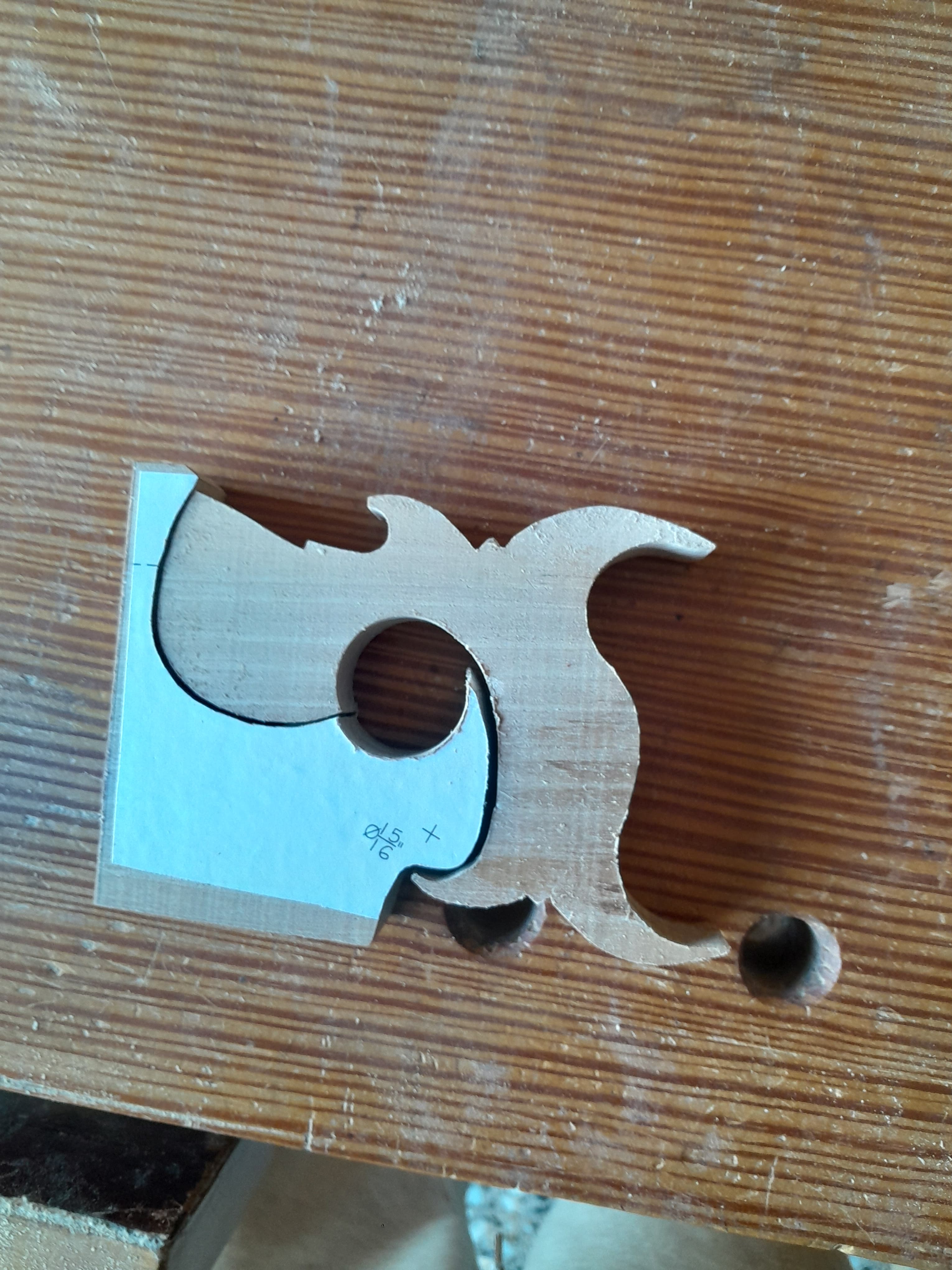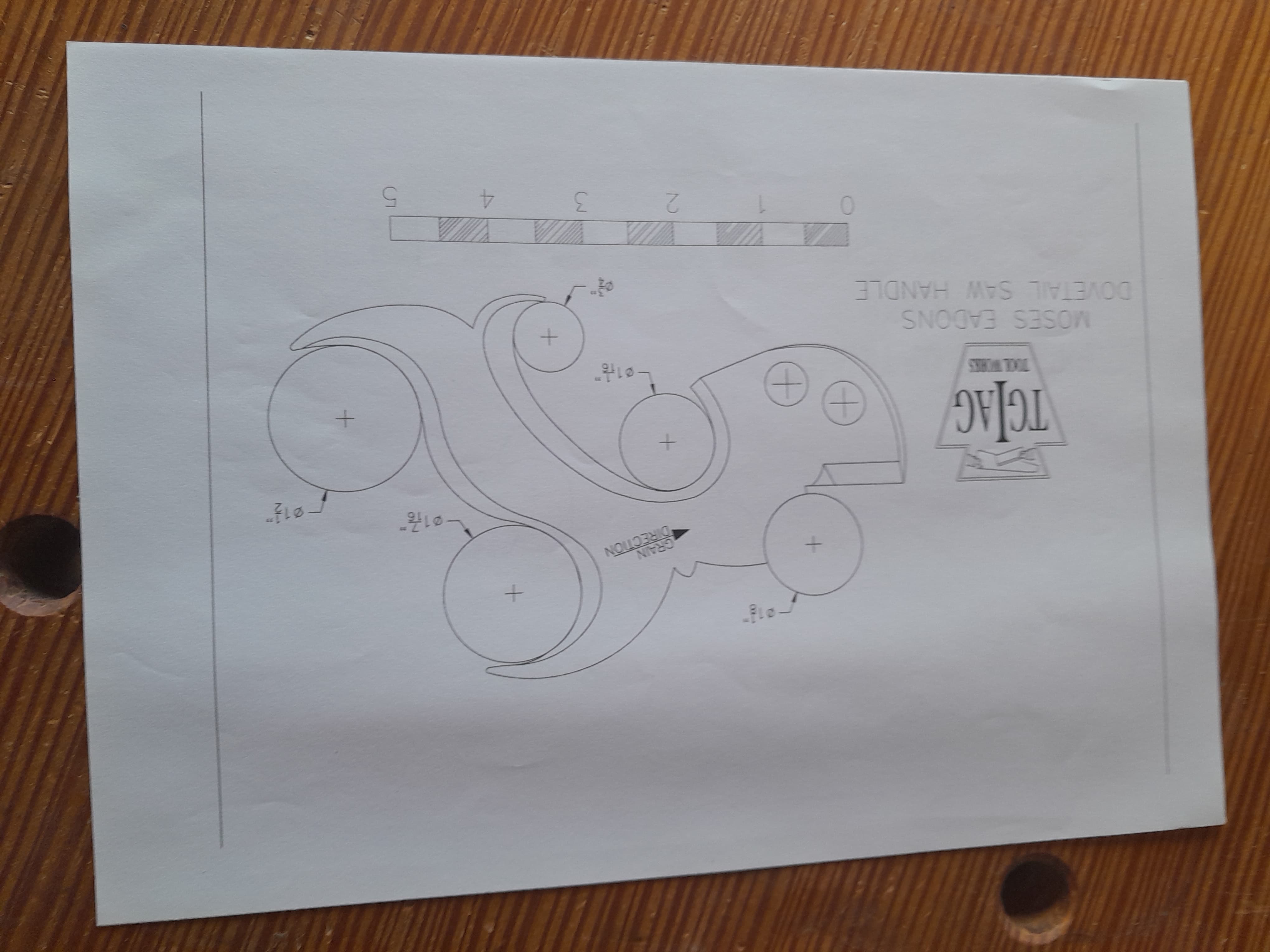 No hay nada mejor que un mango de serrucho se ajuste al tamaño de tu mano, por eso mismo me dispuse a fabricarme el mio y no es complicado hacerlo al disponer de plantillas. Lo primero es seleccionar la pieza de madera con la veta en la orientación correcta, la plantilla tiene una línea que indica en que dirección debe orientarse la veta de la madera, se recorta la plantilla y se pega a la pieza con adhesivo en aerosol. El la propia plantilla se muestra donde hay que hacer los taladros en las zonas curvas, yo los hago con broca forstner aunque también podría ser con broca de pala.