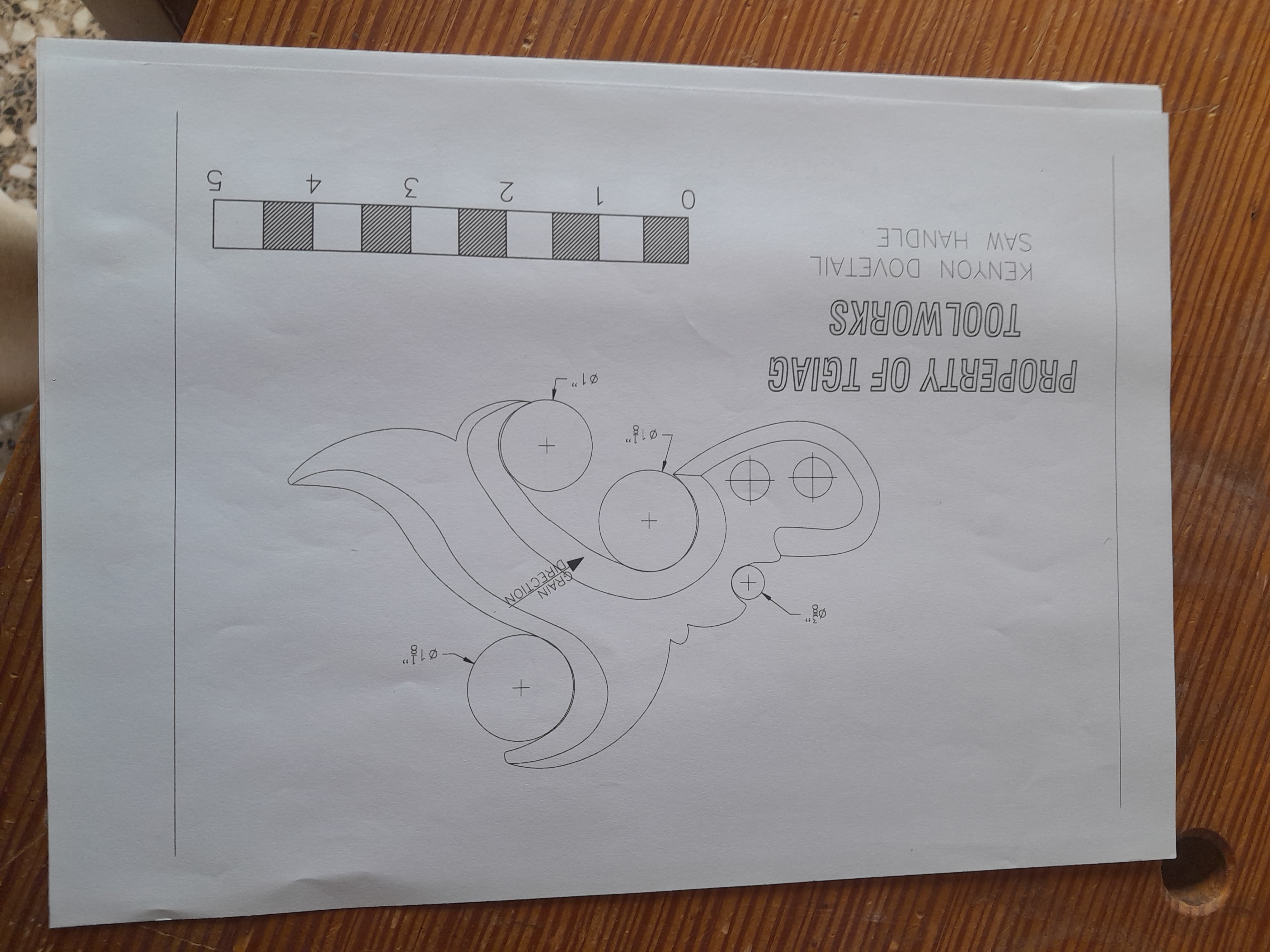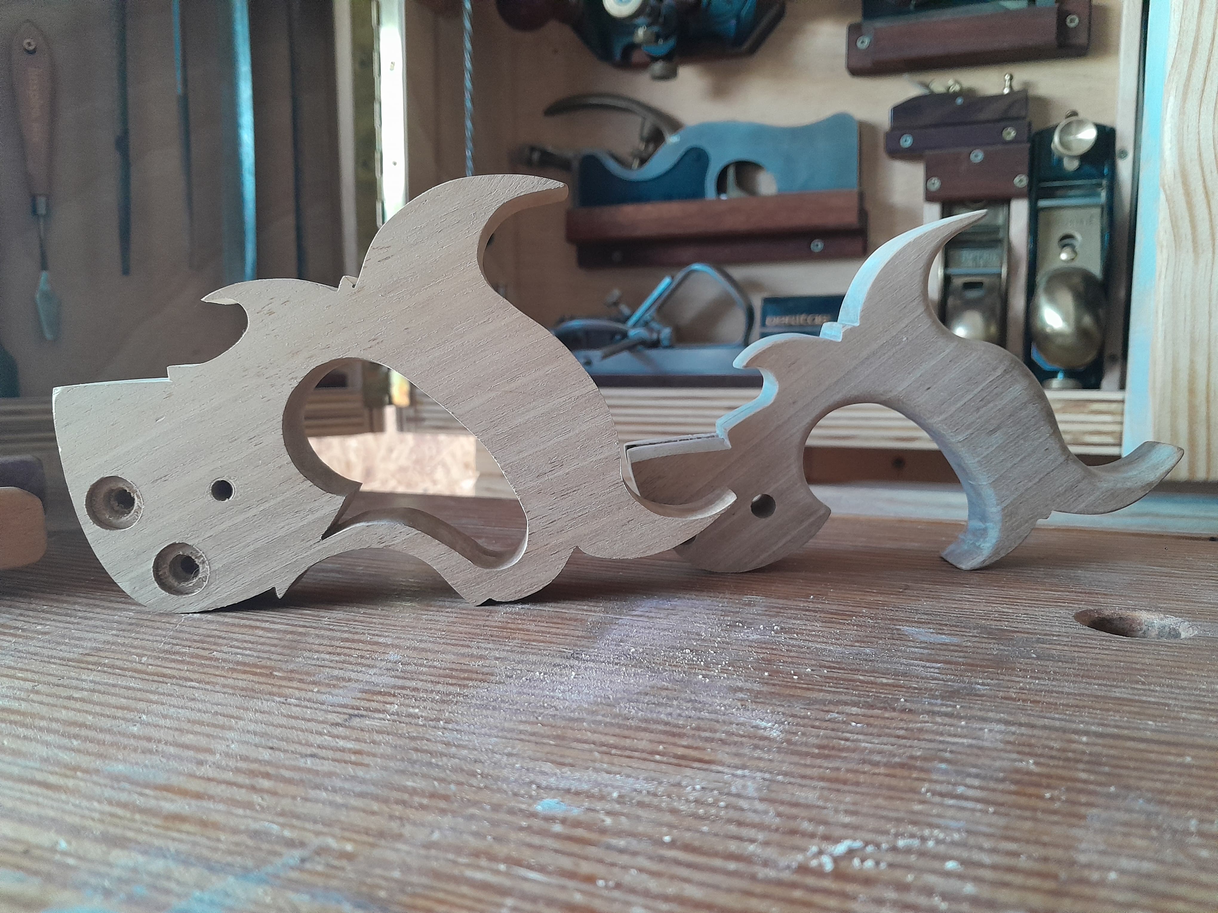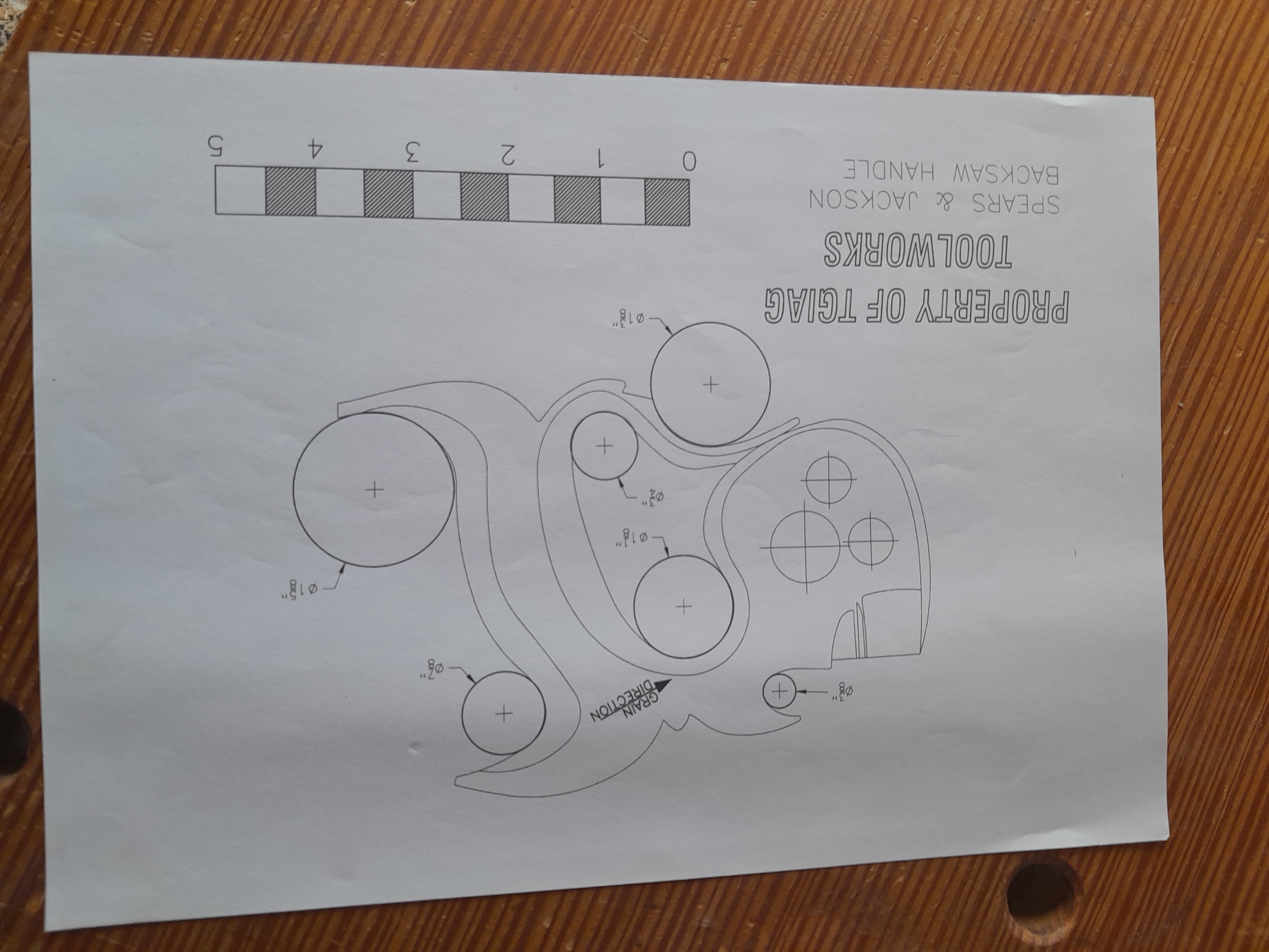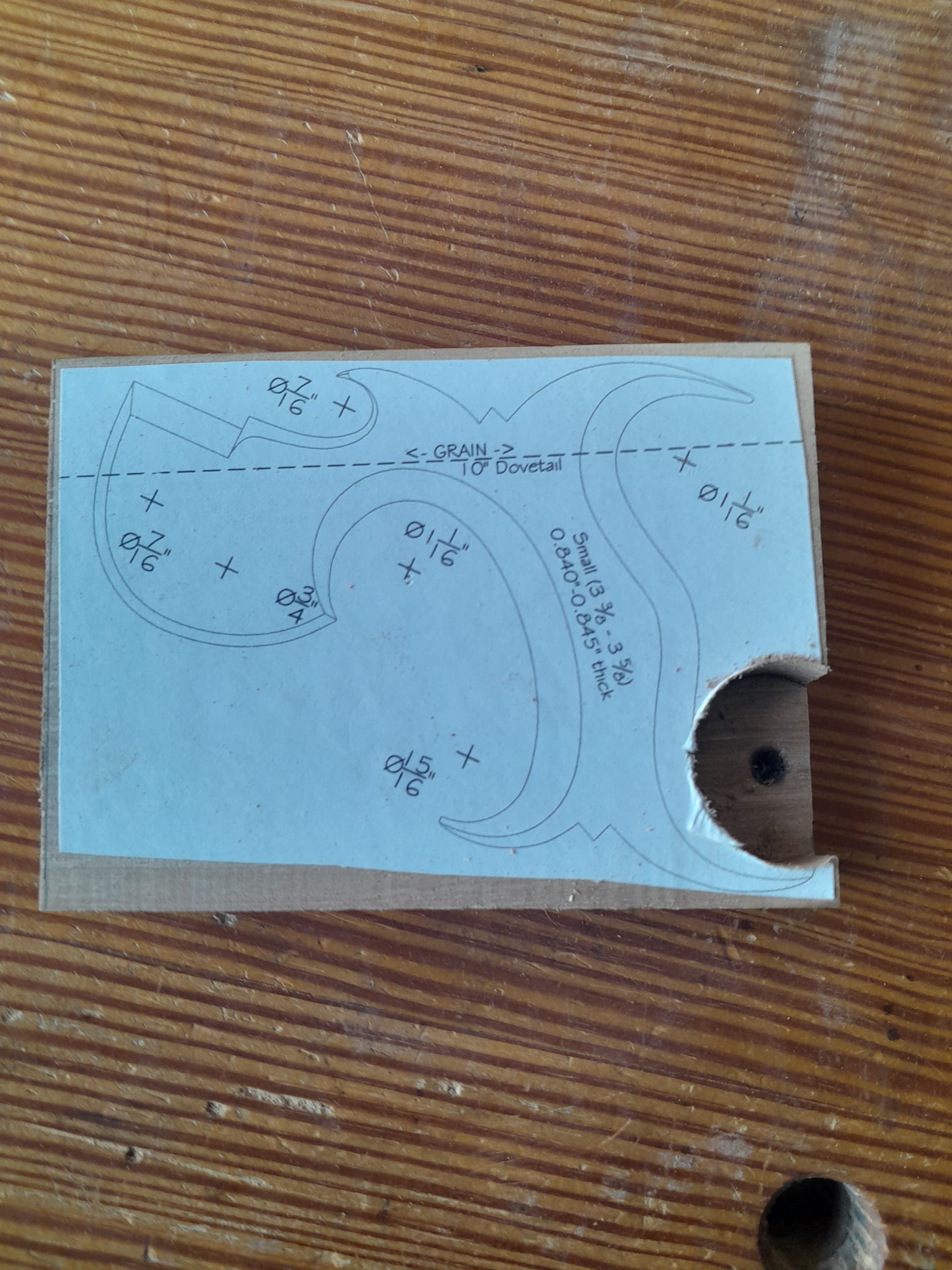 No hay nada mejor que un mango de serrucho se ajuste al tamaño de tu mano, por eso mismo me dispuse a fabricarme el mio y no es complicado hacerlo al disponer de plantillas. Lo primero es seleccionar la pieza de madera con la veta en la orientación correcta, la plantilla tiene una línea que indica en que dirección debe orientarse la veta de la madera, se recorta la plantilla y se pega a la pieza con adhesivo en aerosol. El la propia plantilla se muestra donde hay que hacer los taladros en las zonas curvas, yo los hago con broca forstner aunque también podría ser con broca de pala.