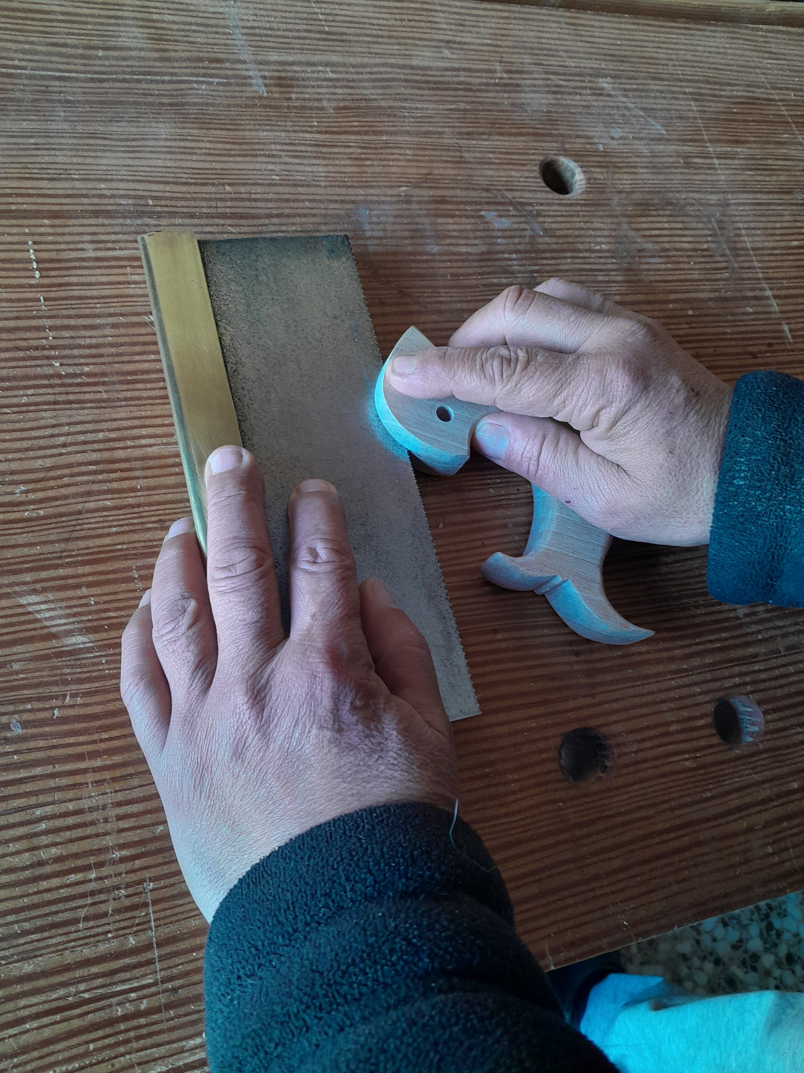 Para realizar el corte done va alojada la hoja del serrucho asiento la hoja sobre un taco de madera para que quede a la altura deseada que es justo a la mitad del grosor del mango y moviendo el mango contra los dientes de la hoja voy serrando, es ideal que el corte se realice con la misma hoja que va a tener el serrucho para que quede bien ajustada.