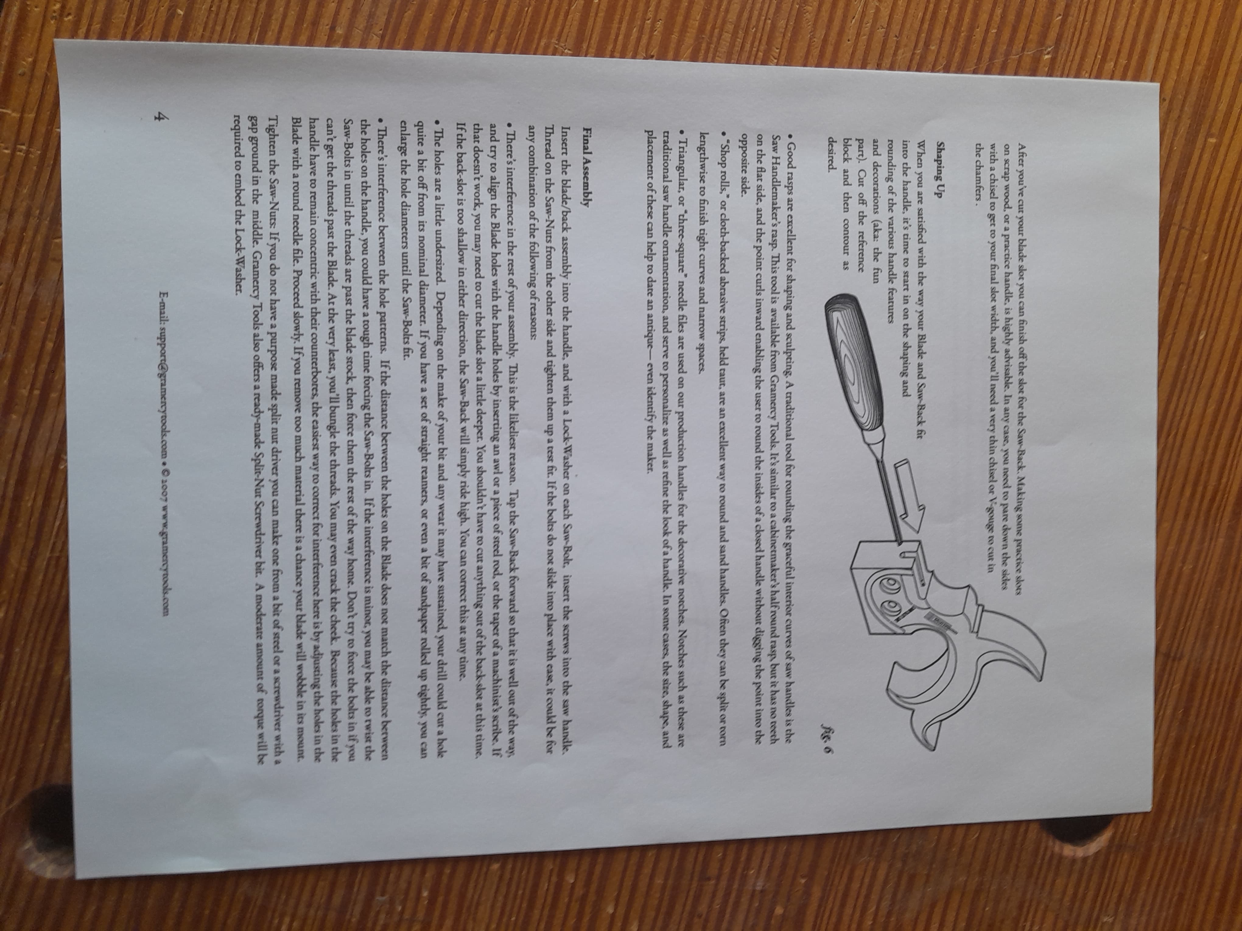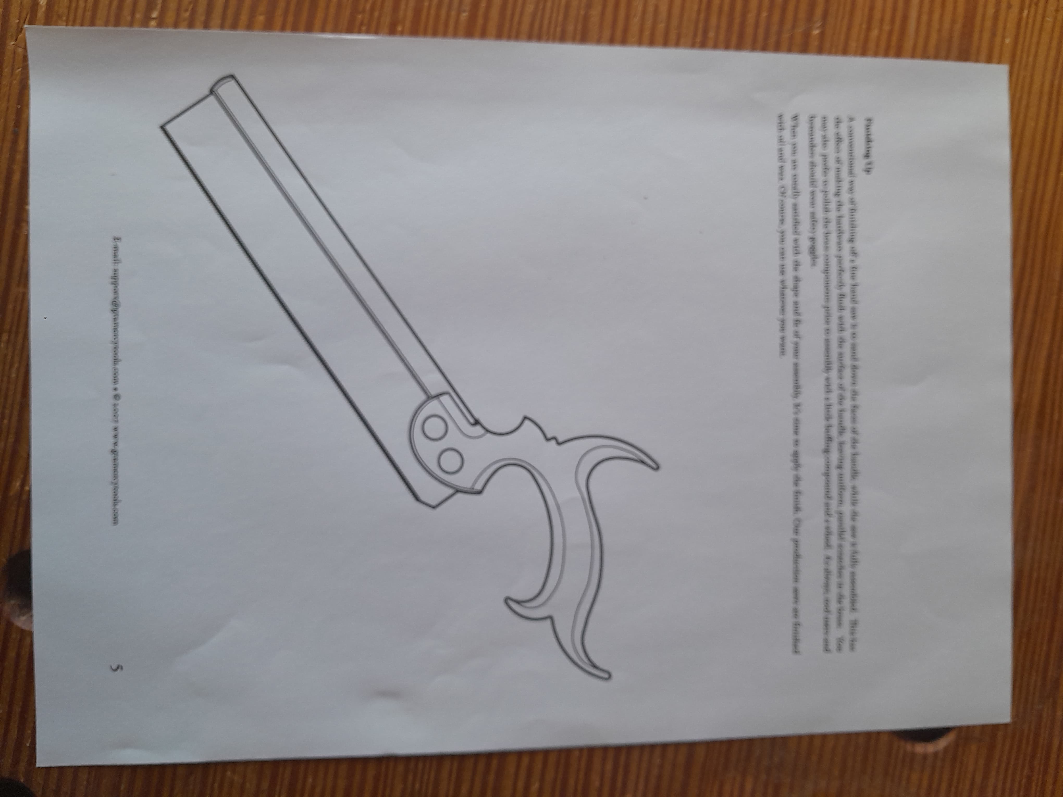 Después se sierra el contorno del mango siguiendo la línea de la plantilla, esto se puede hacer con una buena sierra de marquetería o sierra de cinta estrecha para cortes curvos. En mi caso como mi sierra de marquetería no es nada precisa lo hago con la segueta aproximándome a la línea de corte para luego afinar con la escofina y por último con lija cuidando de mantener la escuadra entre las caras y los cantos del mango.