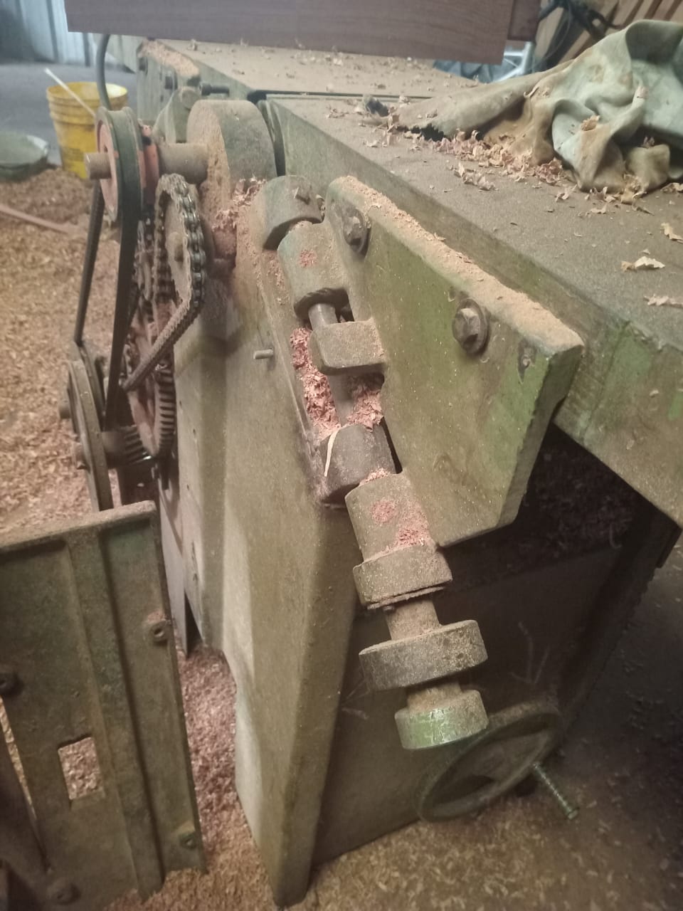 Lo primero yo diria limpieza, limpiar la mesa que quede brillante, afilado de cuchillas, puesta a punto de altura de mesas y cuchillas, engrase con un poco de aceite de las cadenas dd arrastre y arrancar a ver como suena. Es probable que si la maquina lleva tiempo parada haya que poner rodamientos nuevos. Se nota bien por el sonido