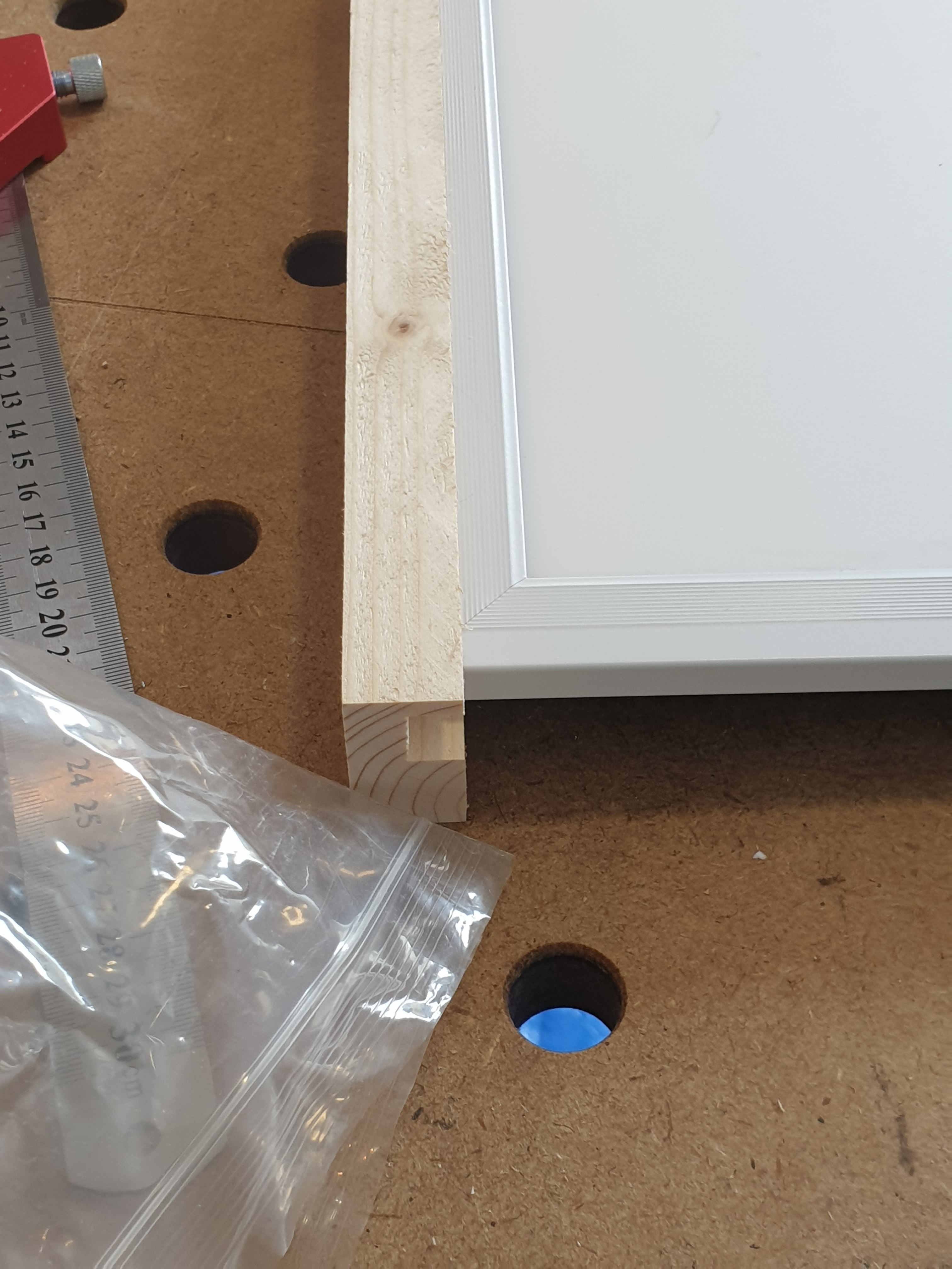 El primer listonin de 12 esta pegado a la tabla, asi cuelga del refuerzo (de 12 también) y lo clave posandolo en el marco/cubre cantos, para asegurar el ajuste.