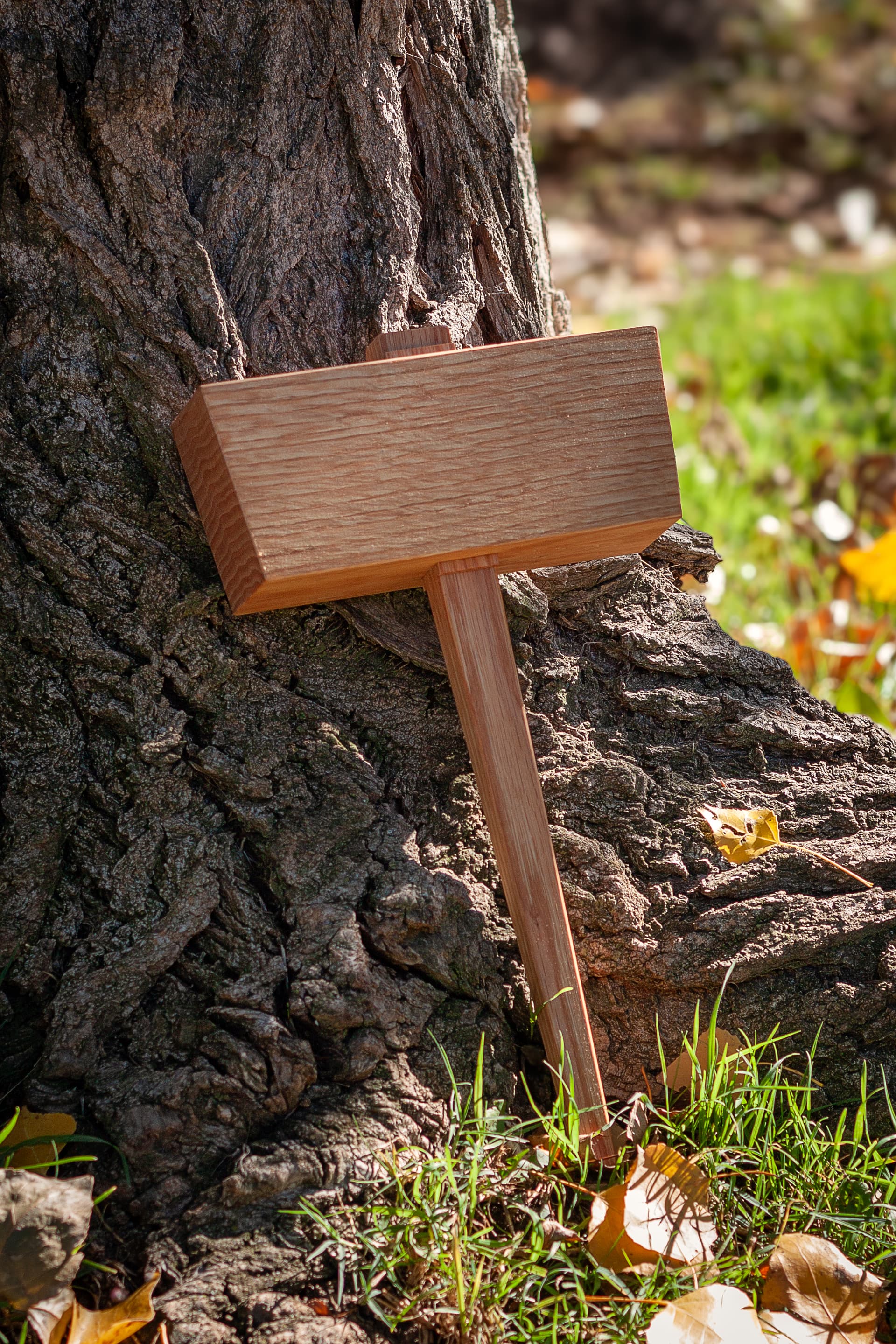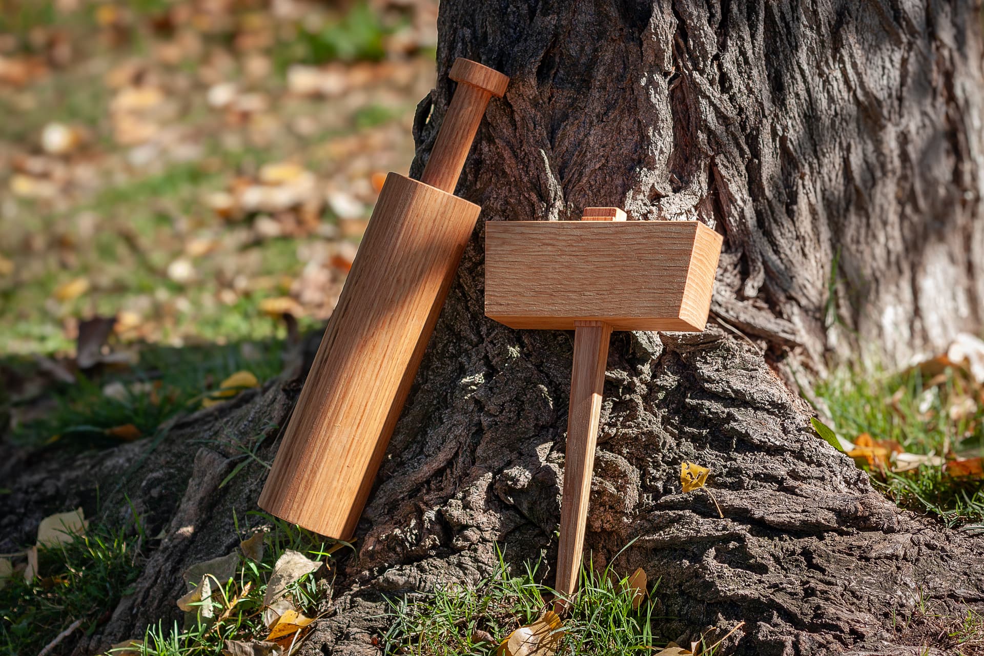 Mi martillo presenta algunas diferencias respecto al original, comenzando por la madera, que es roble rojo (frente a fresno) y que los angulos de las testas de la cabeza originalmente estaban invertidas. La cabeza tiene un agujero cónico con cuatro paredes lisas; el mango, también cónico, encaja con pequeñas cuñas. Salvando el ingletado de las testas todo el trabajo fue hecho a mano. Ajustar estas piezas requiere calma y precisión, el ajuste del agujero central fue especialmente costoso y desafiante a fin de dejarlo perfectamente plano.