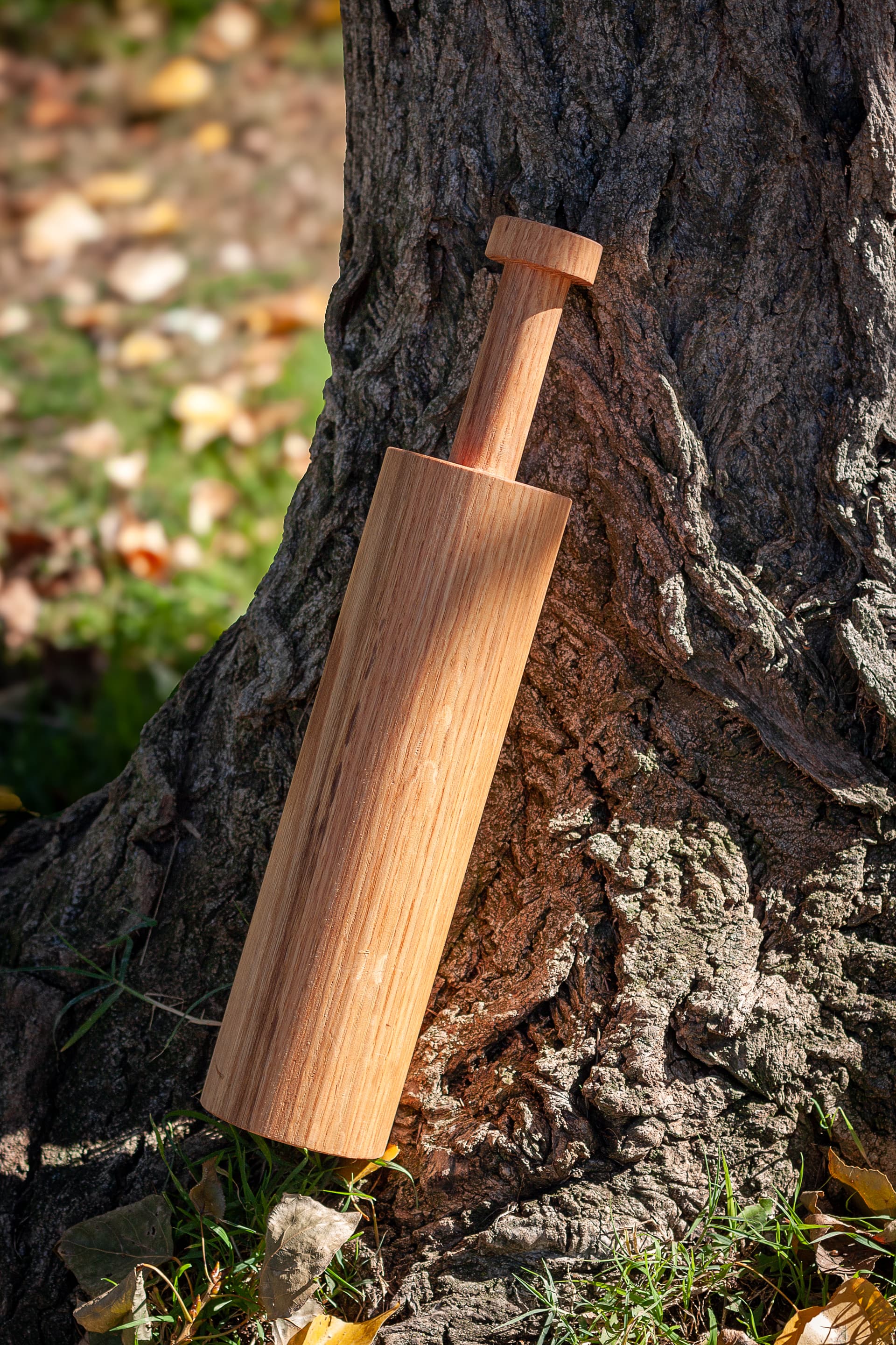 El mazo fue bastante más sencillo. Hecho a partir de un taco macizo, el mango y la cabeza son la misma pieza. Tuve que redondearlo a mano con cuidado, acabando con finas pasadas del cepillo. El mango fue tallado en el carro de la sierra de mesa, rotándolo a fin de ir cortando el sobrante pero dejando un núcleo.