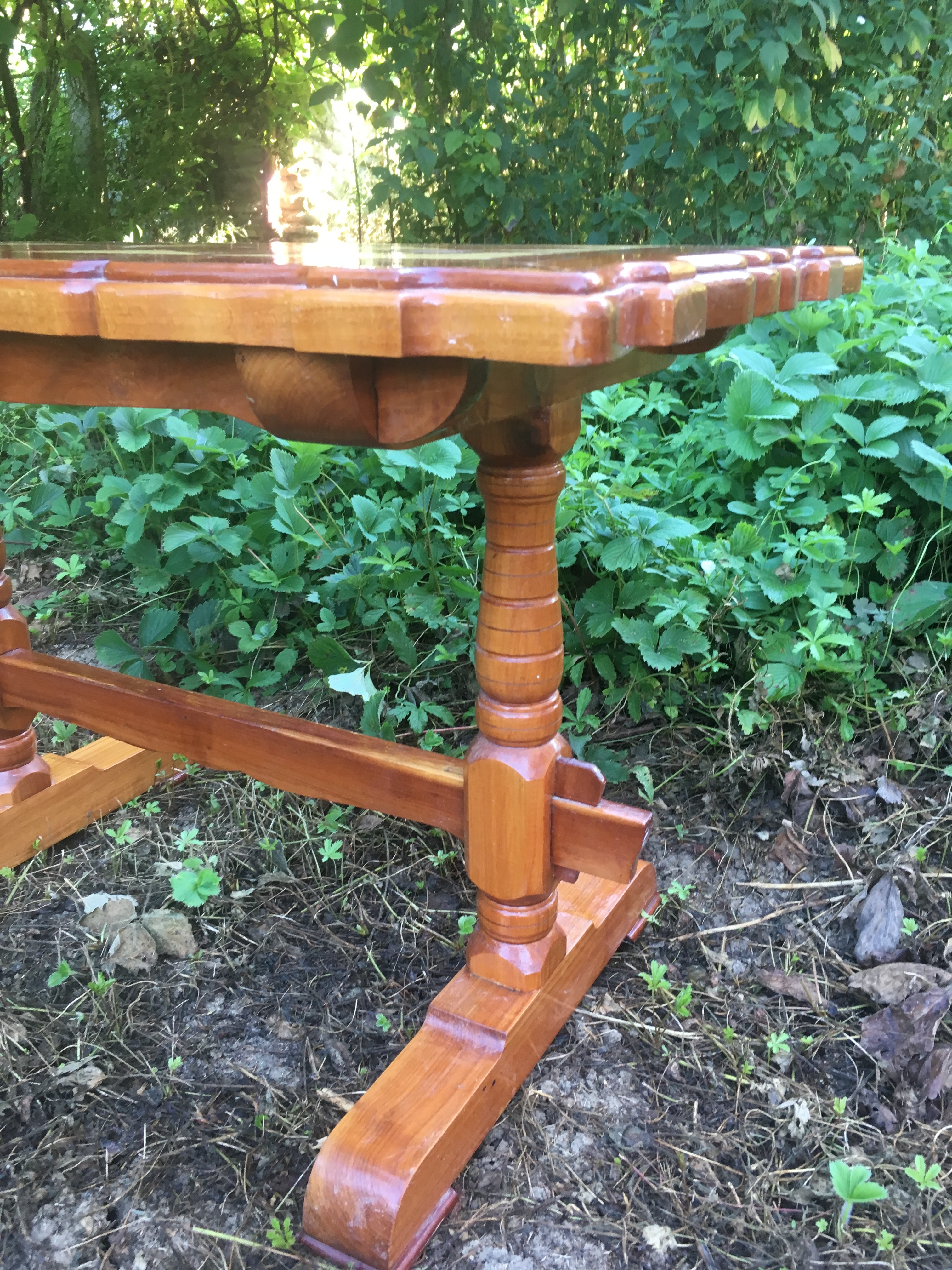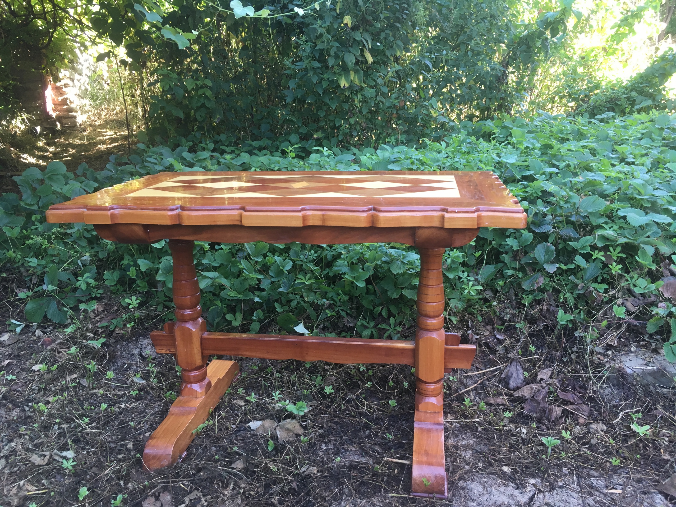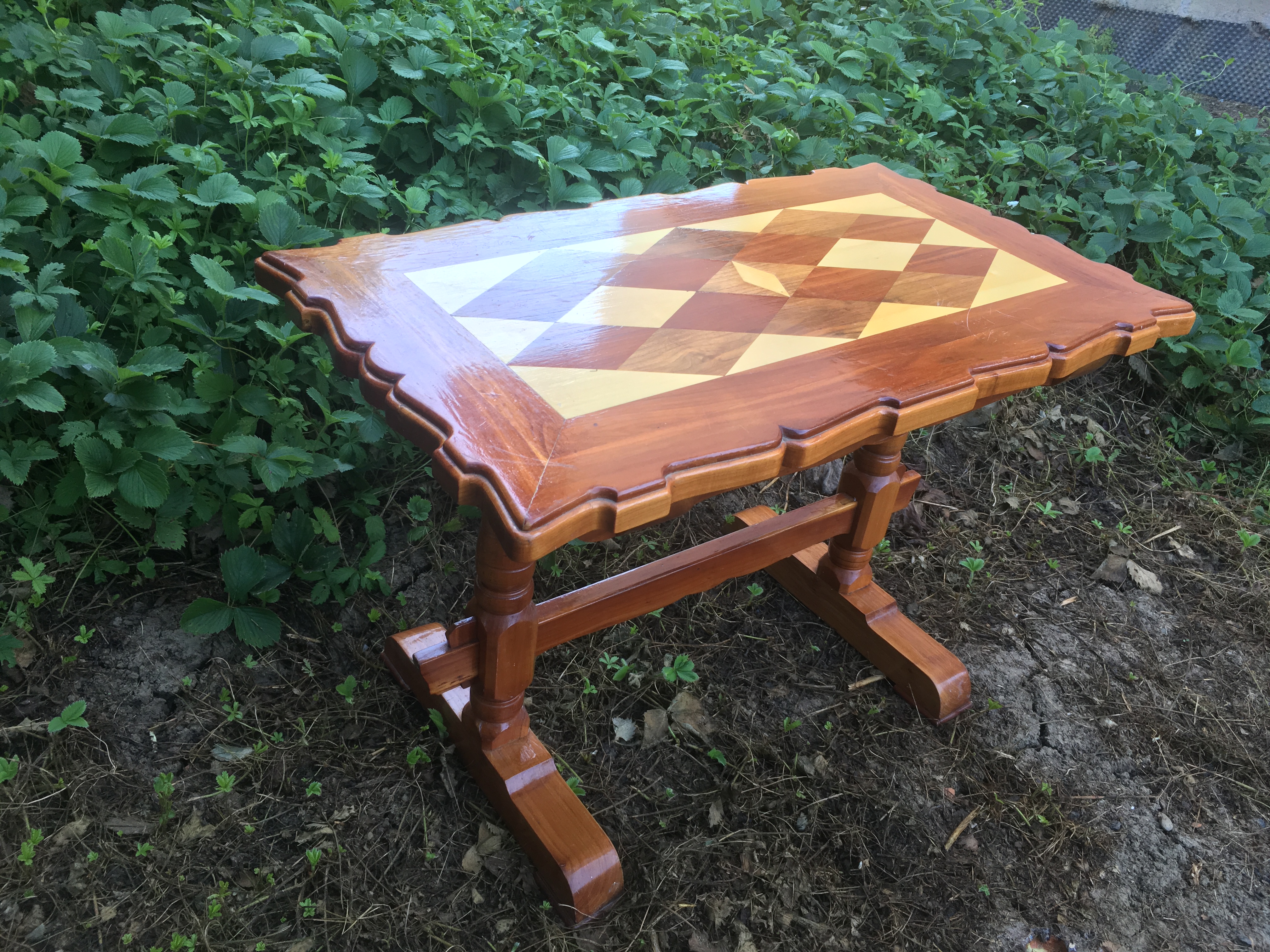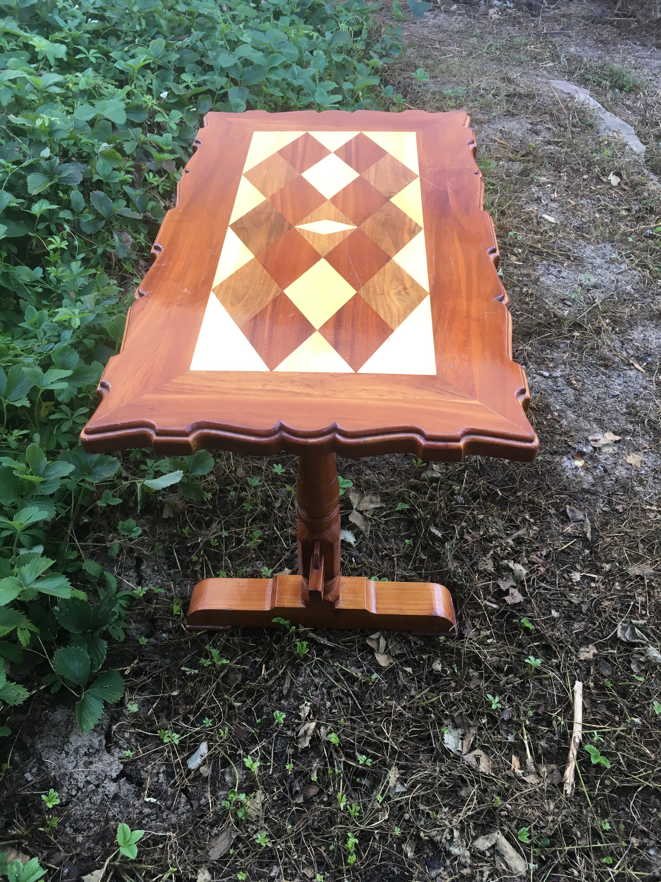 No me puedo abstener de colocar aquí unas fotos de un trabajo realizado por mi padre; que por desgracia nos ha dejado hace tres años. Era de profesión maestro de infantil pero le gustaba muchísimo hacer cosas de madera. Es una mesita que me lo ha realizado hace 17 años incorporando 8 tipos de madera; desconozco cuales son… todo realizado usando herramientas de mano heredadas de mi abuelo y un torno casero.