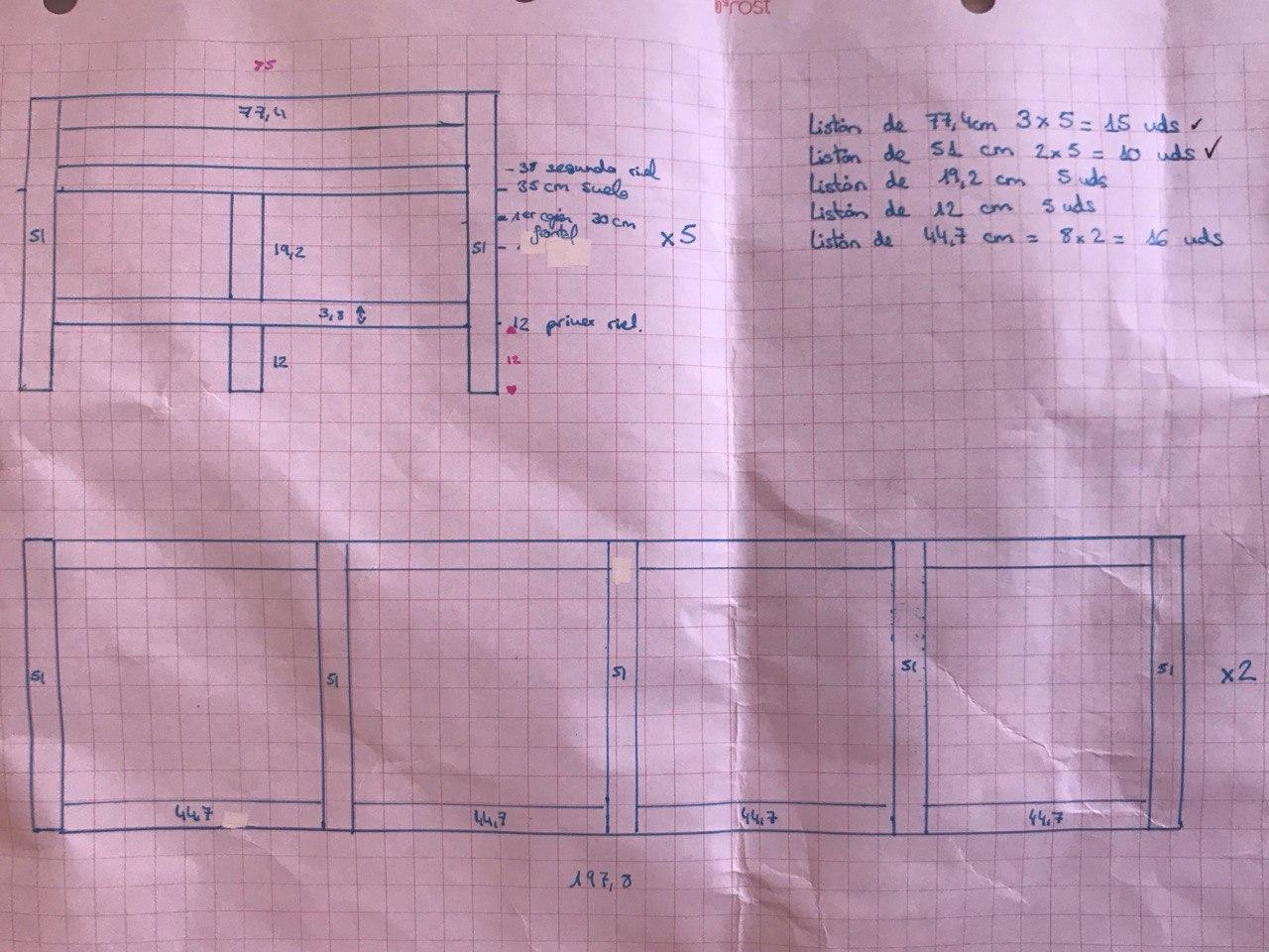 He estado dándole vueltas, y, sin unirlo a la cama que queda (necesito que estén separadas para poder limpiar con comodidad) la mejor idea me parece realizar una estructura de listones y montar los cajones en ella. He estado garabateando en el tren el plano: