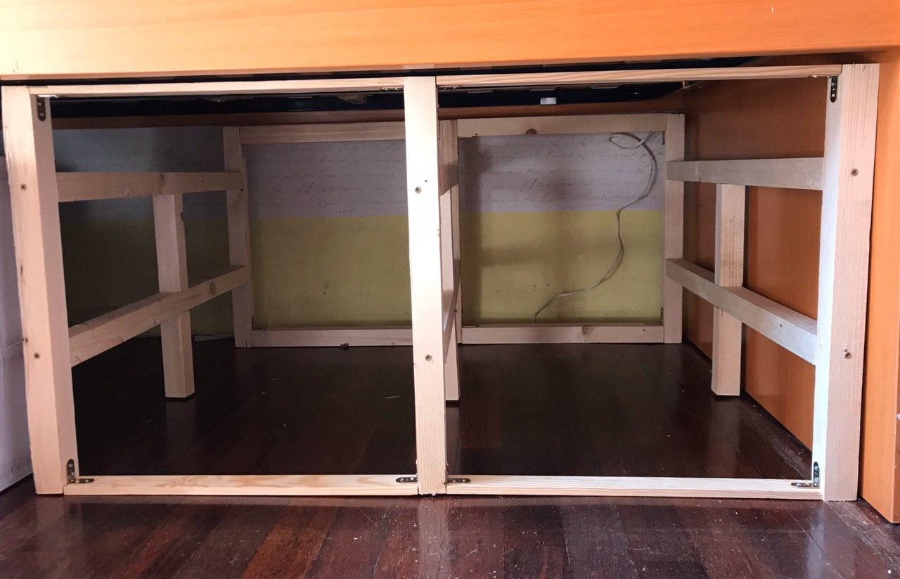 Bueno, pues después de mucho pelear con las ferreterías online por el tema de los rieles, ya estaría, creo que ha quedado bastante bien. Hice la estructura con listones de abeto sin cepillar de 3,8: