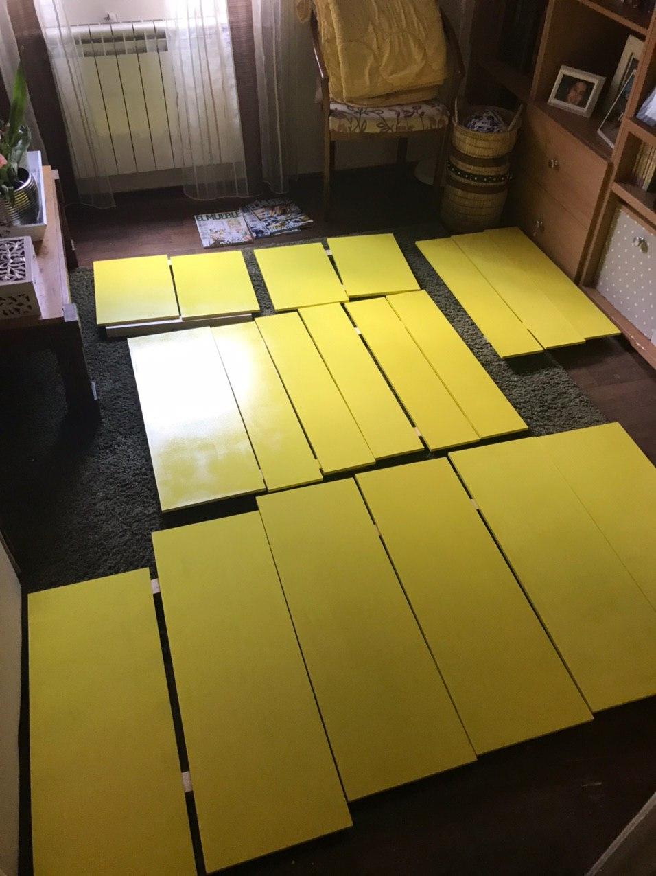 Con la estructura montada pude ir a Leroy Merlín a por los cortes de MDF de 1cm y de pino. Había esmaltes de liquidación a 3€ así que me llevé un bote de amarillo (no había mucho donde elegir) y le di una capa a las “paredes” de los cajones. Al fondo del cajón le di una capita de esmalte blanco que tenía por casa
