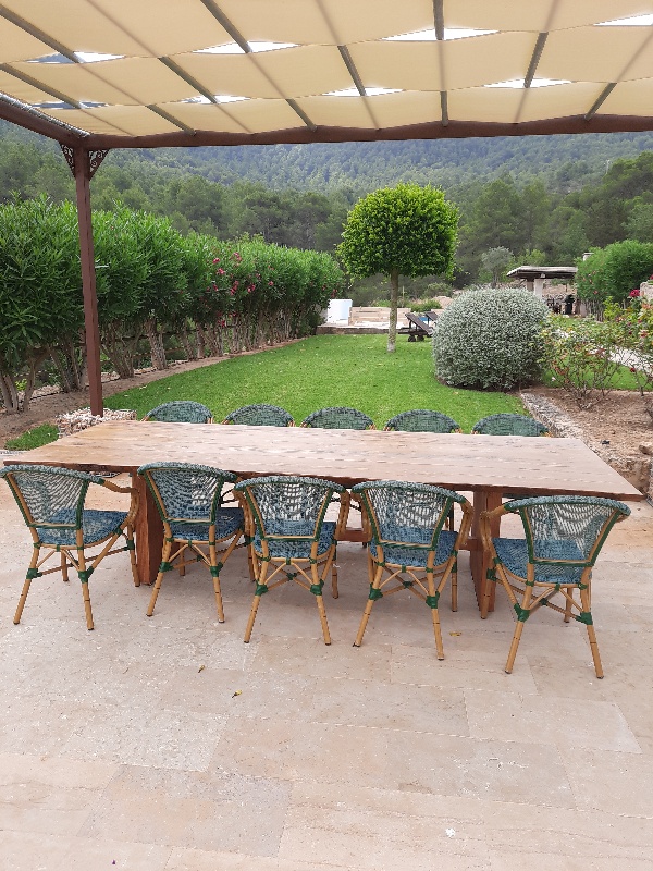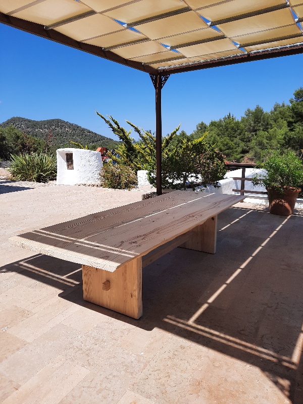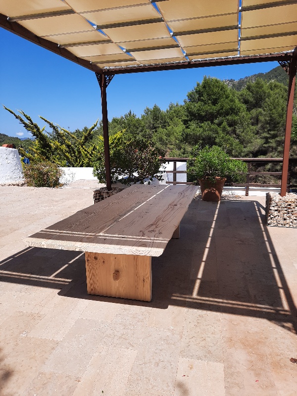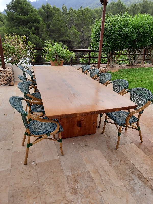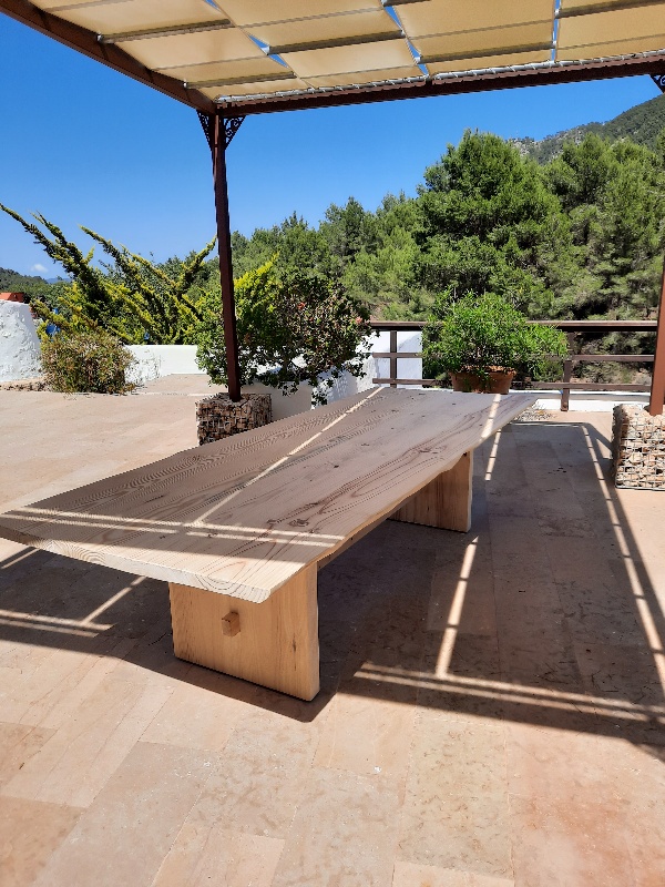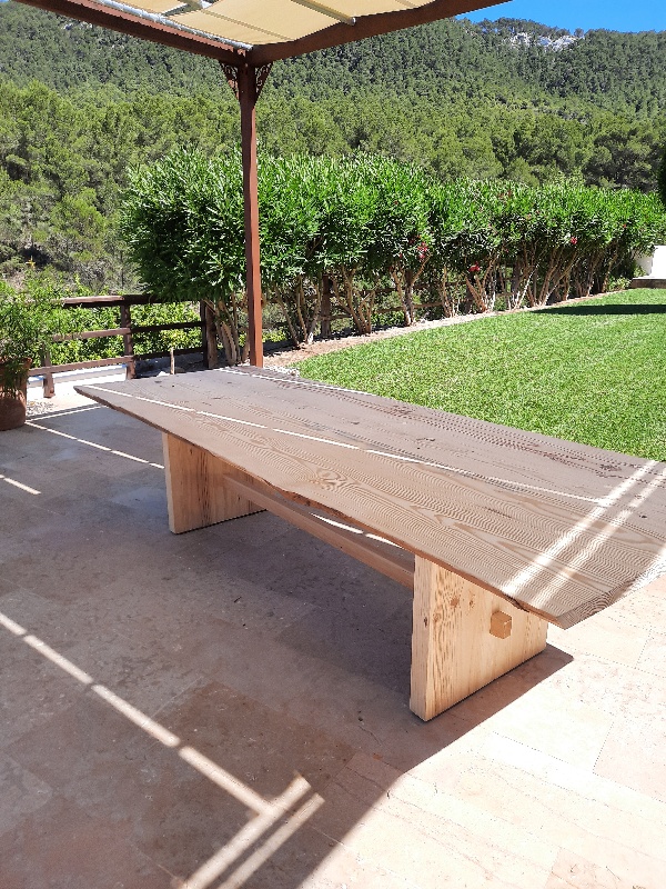 es una mesa de pino con un parte reclicado de una barra de bar que tenia quien la encargo,la criatura tiene 3 m de largo por 1,10 de ancho y sobre de 5 cm las patas 7 cm de grueso…