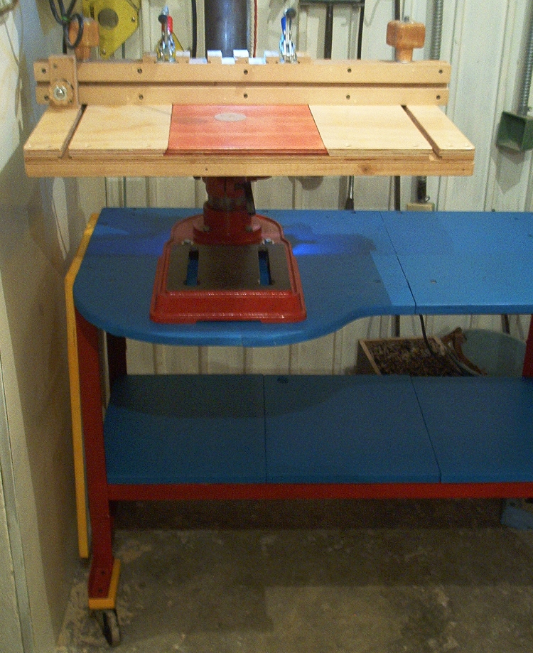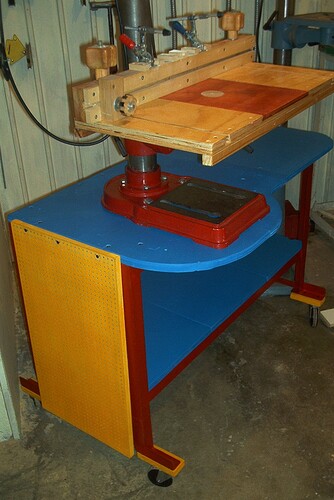 presento a ustedes una mesa para taladro de banco que hice hace algunos meses, esta mesa cuanta con ranuras T para la cerca, o barandal (fence), la cerca tiene a sus vez también una ranura T para que corra un tope, además de unas monturas que se me ocurrieron para utilizar clamps rápidos (hold down toggle clamps) y de esta manera poder usarlos en otros dispositivos, las perillas son de fabricación también en mi taller, bueno les presento unas fotos a ver que les parece.