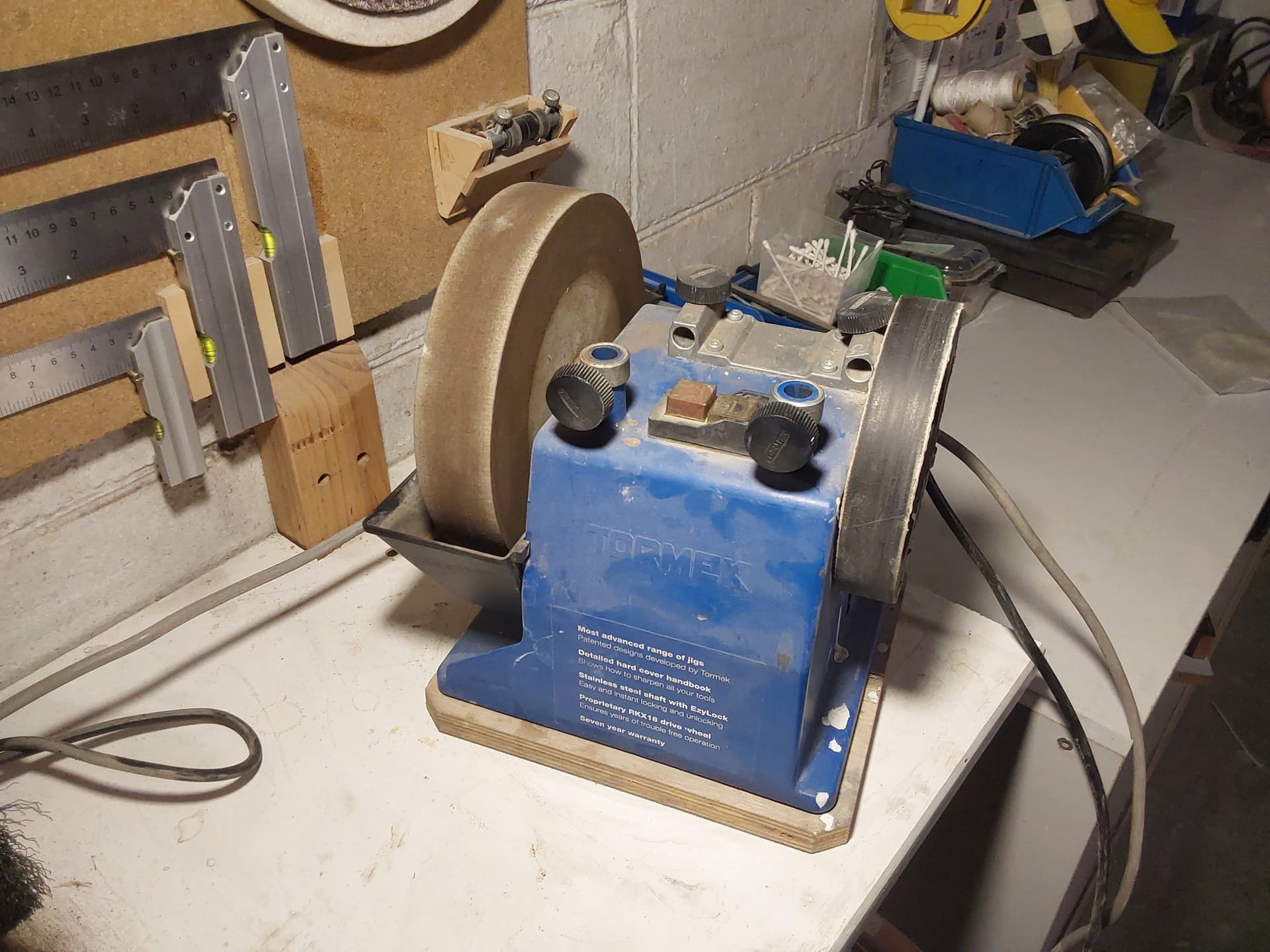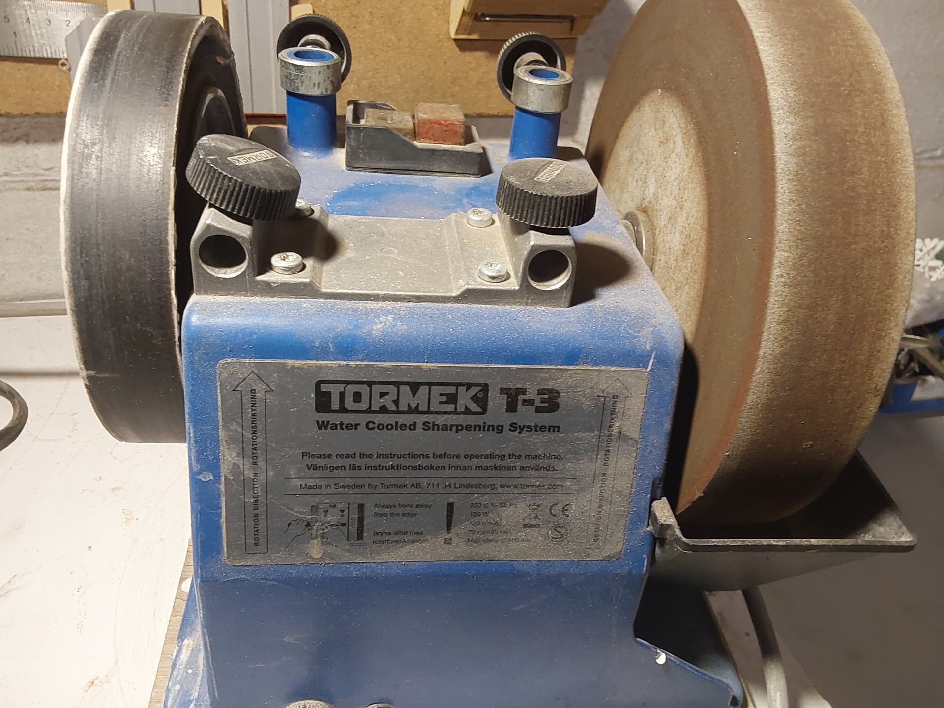 Te cuento, hoy arreglando unos desperfectos del taller, en una balda donde tengo una T3 se me cayo desde la pared una muela que tenia colgada, y que debi tirarla hace años de mala que era, me cayo con tan mala fortuna que rompio una esquina de la muela de la Tormek.