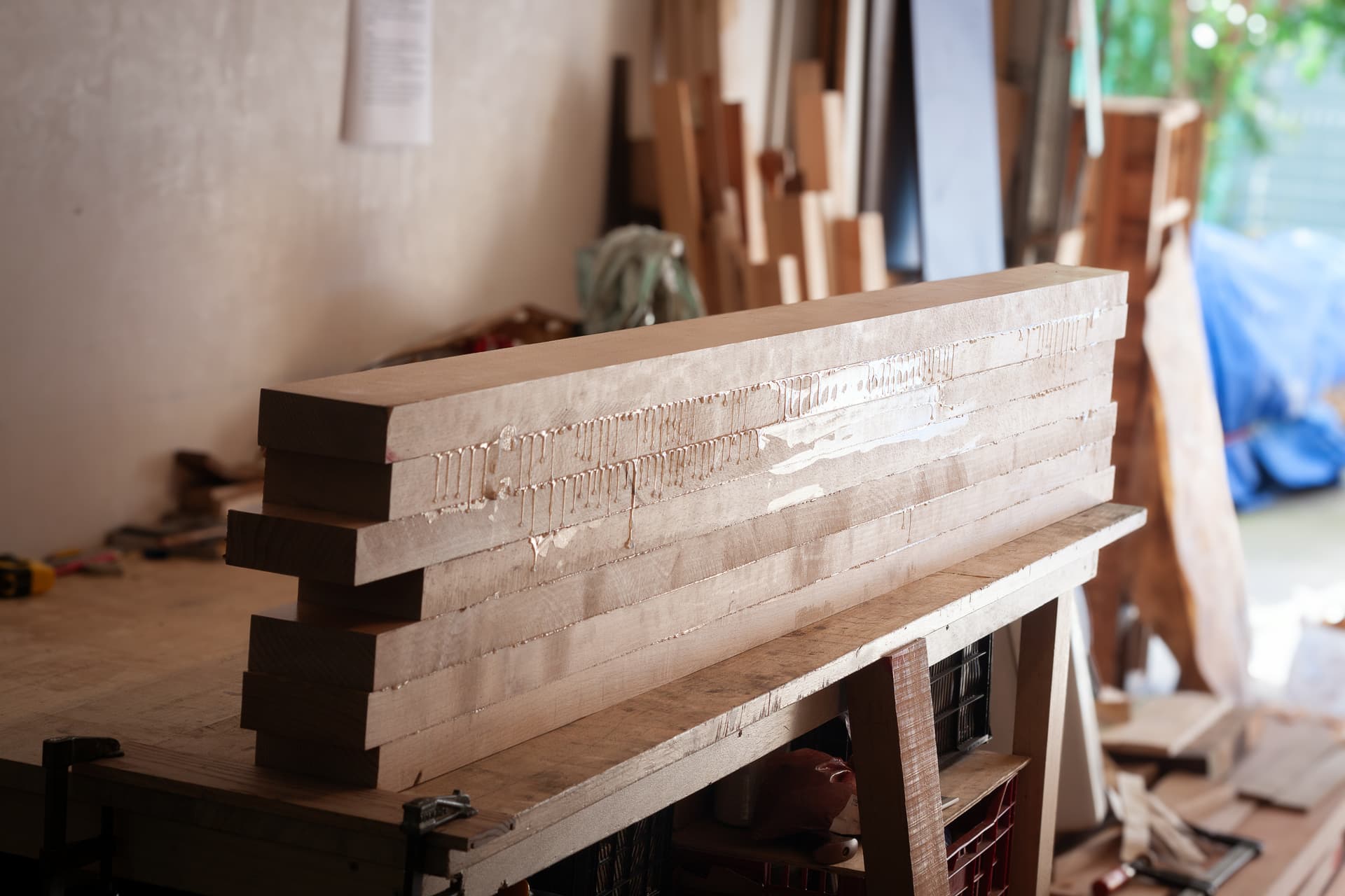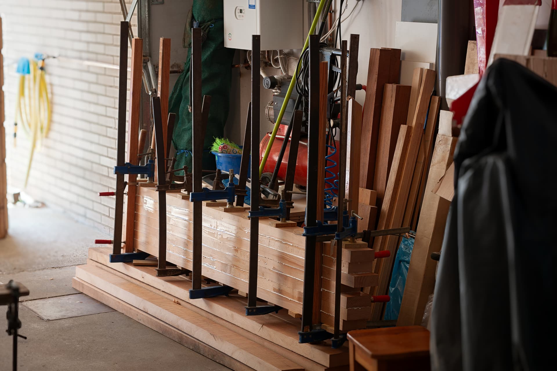Comencé seleccionando del stock de madera que tenia cual era utilizable y cual no y como podía hacerlo con lo que tenia. Corté, dimensioné y aplané tablas de roble blanco para hacer las patas. Cada una esta formada por el encolado de 3 tablas, y miden 125x125mm de lado. Las vigas que las unen y forman la estructura inferior están formadas por tacos macizos de roble rojo de 90x90mm. Tras eso, seleccione, ordene las tablas de la tapa en el orden que quería (motivos estéticos principalmente) y las oriente todas para que la veta fuera en la misma dirección. Cada mitad de la tapa esta formada por 7 tablones de haya, originalmente de 50mm, rebajadas a 44mm. El bloque encolado mide 2m de largo, 300mm de ancho y 100mm de grosor una vez terminado. Son 12 caras a preparar, las cuales deben tener una junta perfecta, mas las otras 2 exteriores.