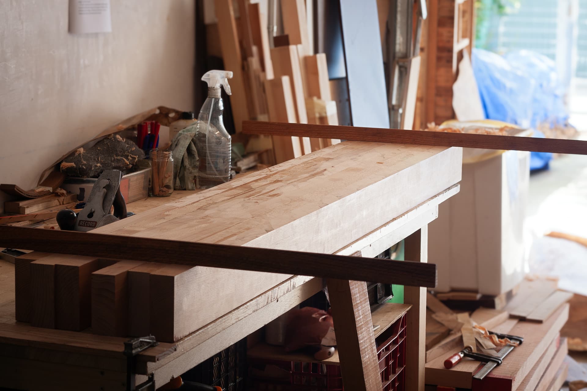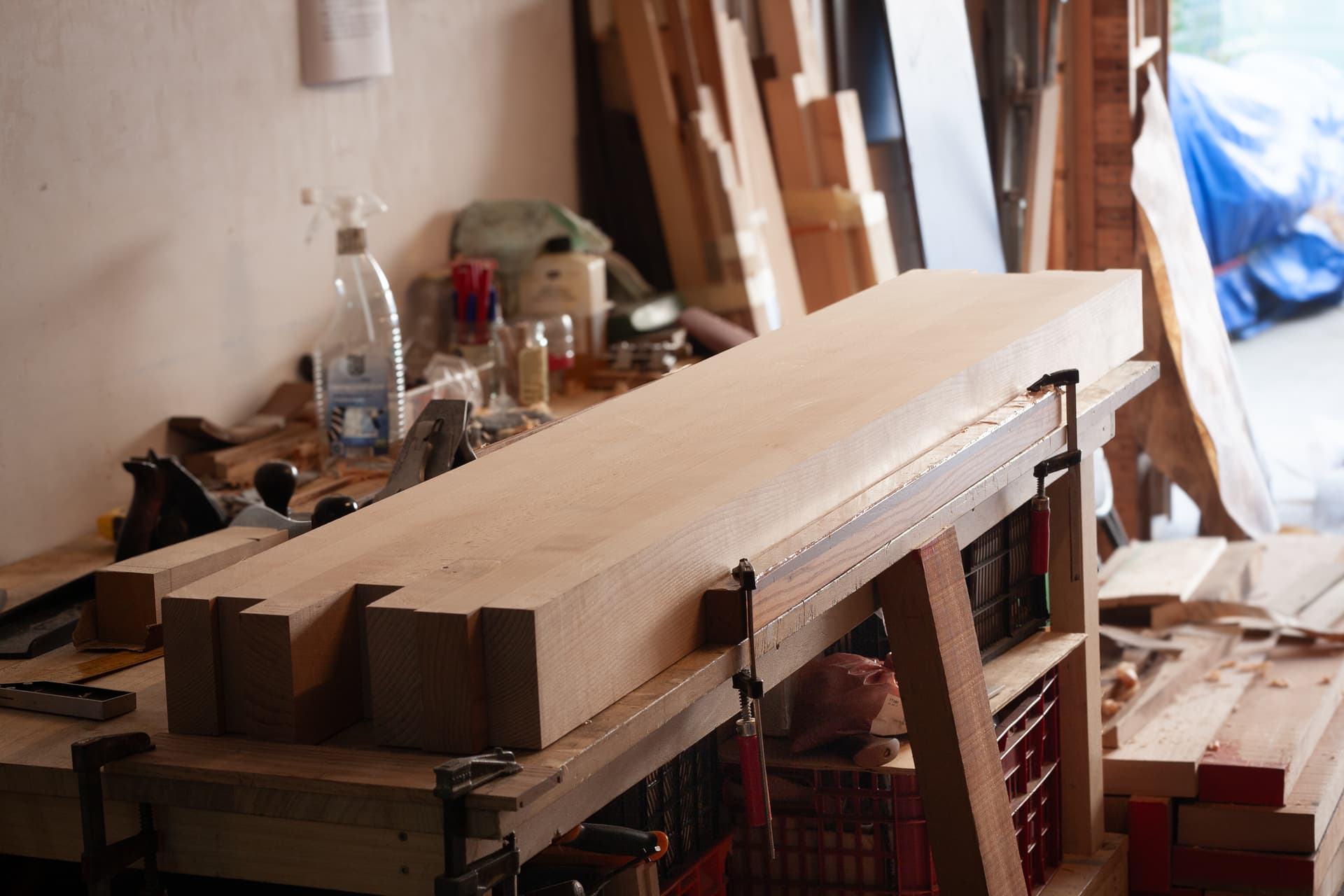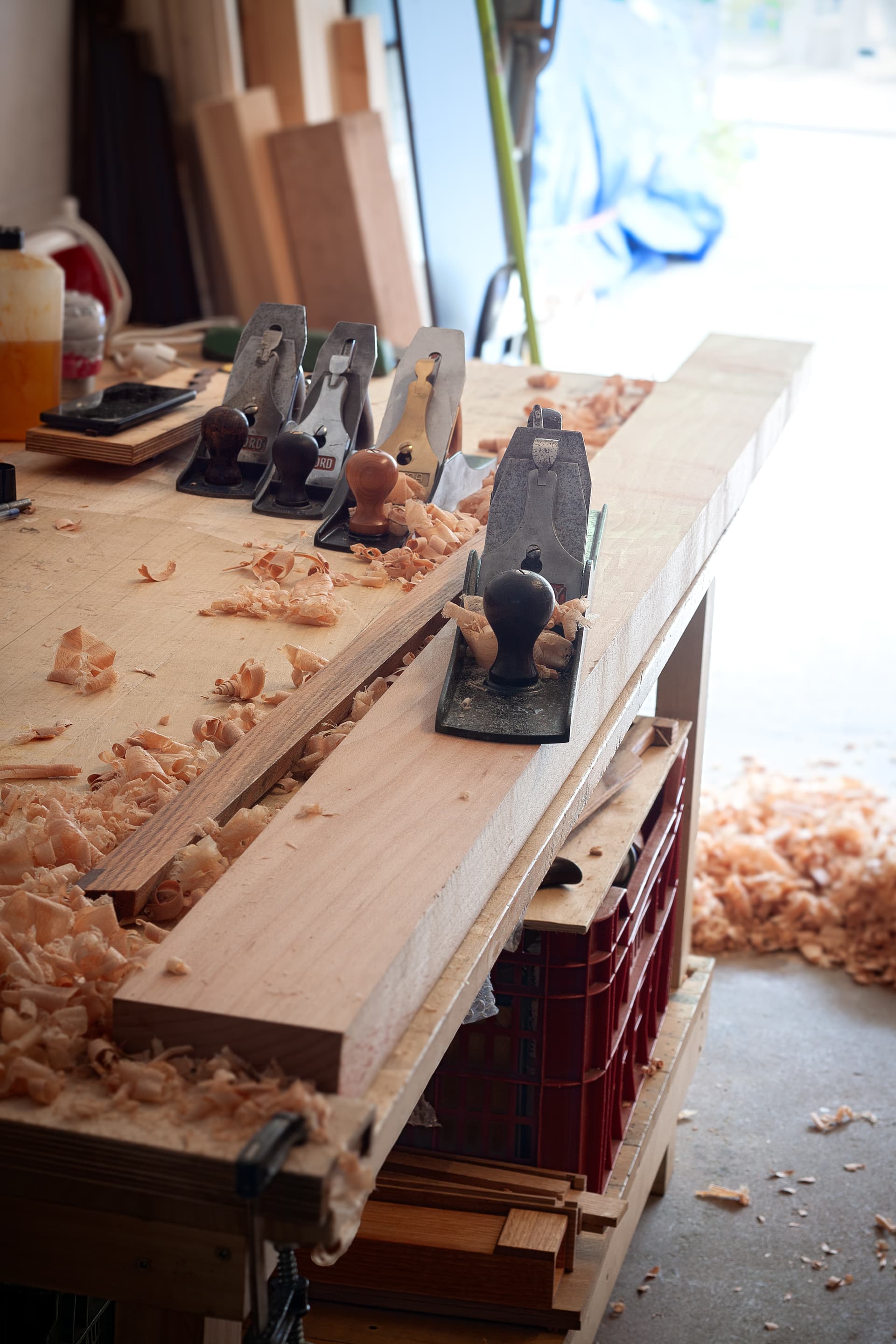 Gran parte de todo esto fue hecho a mano, pero usé una sierra de mesa para eliminar la anchura sobrante de los tablones y mi regruesadora para quitar 4mm rápidamente en las tablas de haya de la tapa, que igualmente tuve que retocar extensamente a mano porque mi regruesadora es malísima y deja torceduras, tripas y marcas. El 90% (o más) del tiempo empleado fue trabajando a mano.