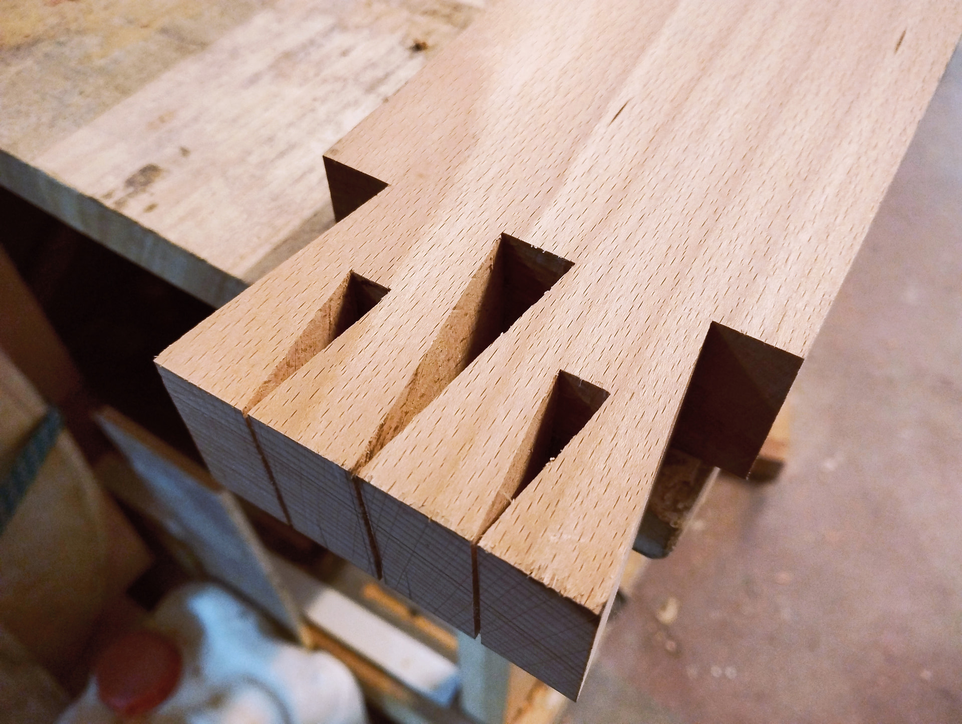 Por un lado es mi primer gran proyecto en solitario, especialmente desde que no trabajo con mi padre en su taller, hace 15 años. También es mi primer proyecto con herramientas manuales, y al inicio de este solo contaba con dos cepillos de una calidad paupérrima: un Stanley 4 con mangos de plástico y un nº5 sin marca, y aun con estos pude hacer las patas y las vigas que las unen.