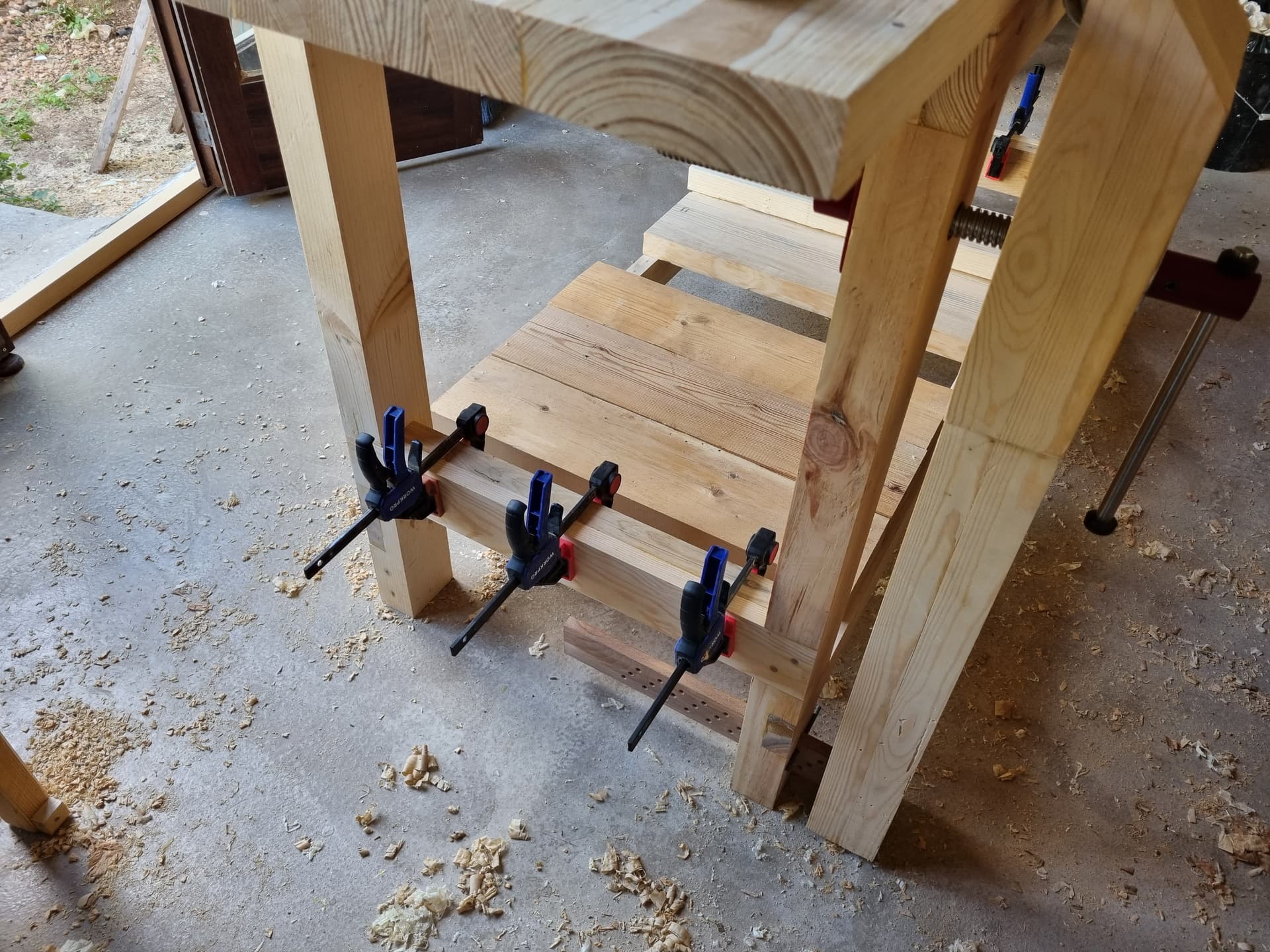 La distribución de los agujeros es algo bastante personal, pero yo me haría dos hileras, una cerca del canto del banco , como a 5 cm, y otra más hacia dentro ( a 15 o 20 cm del canto) para tablas más anchas y sujetarlas con dos puntos de sujeción en las testas.