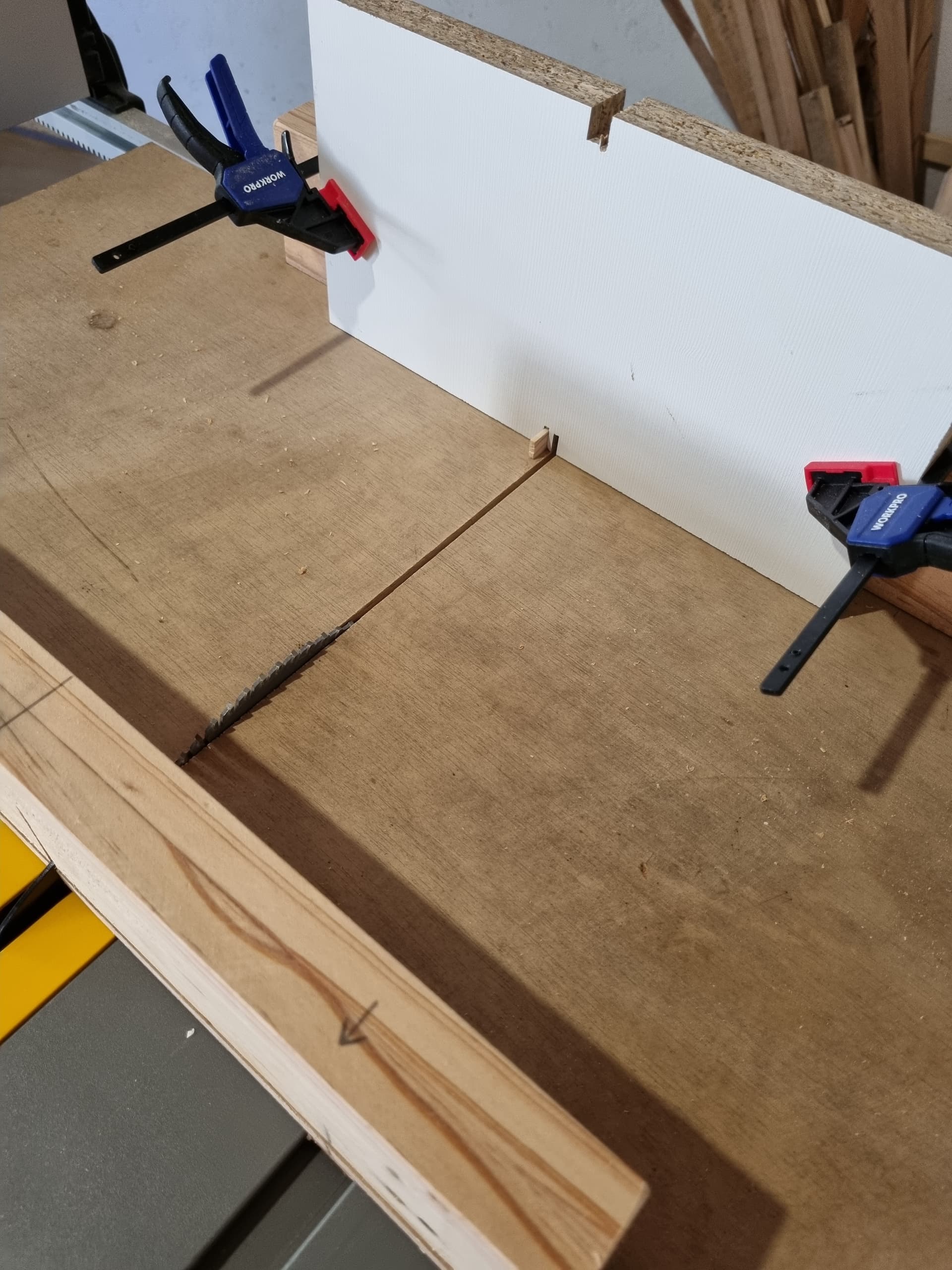 Por si te interesa, tienes una herramienta de precio moderado en Banggood que te permite hacer los ensambles de dedos con mayor control que con ese tipo de plantilla artesanal que te has fabricado.Está hoy a 83€ + 6 de envío. Hay otra posibilidad que es una plantilla de calidad de Incra, se llama iBox. Eso permite hacer virguerías de precisión pero vale casi 300€, y además dispone de seguridad que hace casi imposible un accidente aunque se trabaje con fresadora de mesa en vez de con sierra.