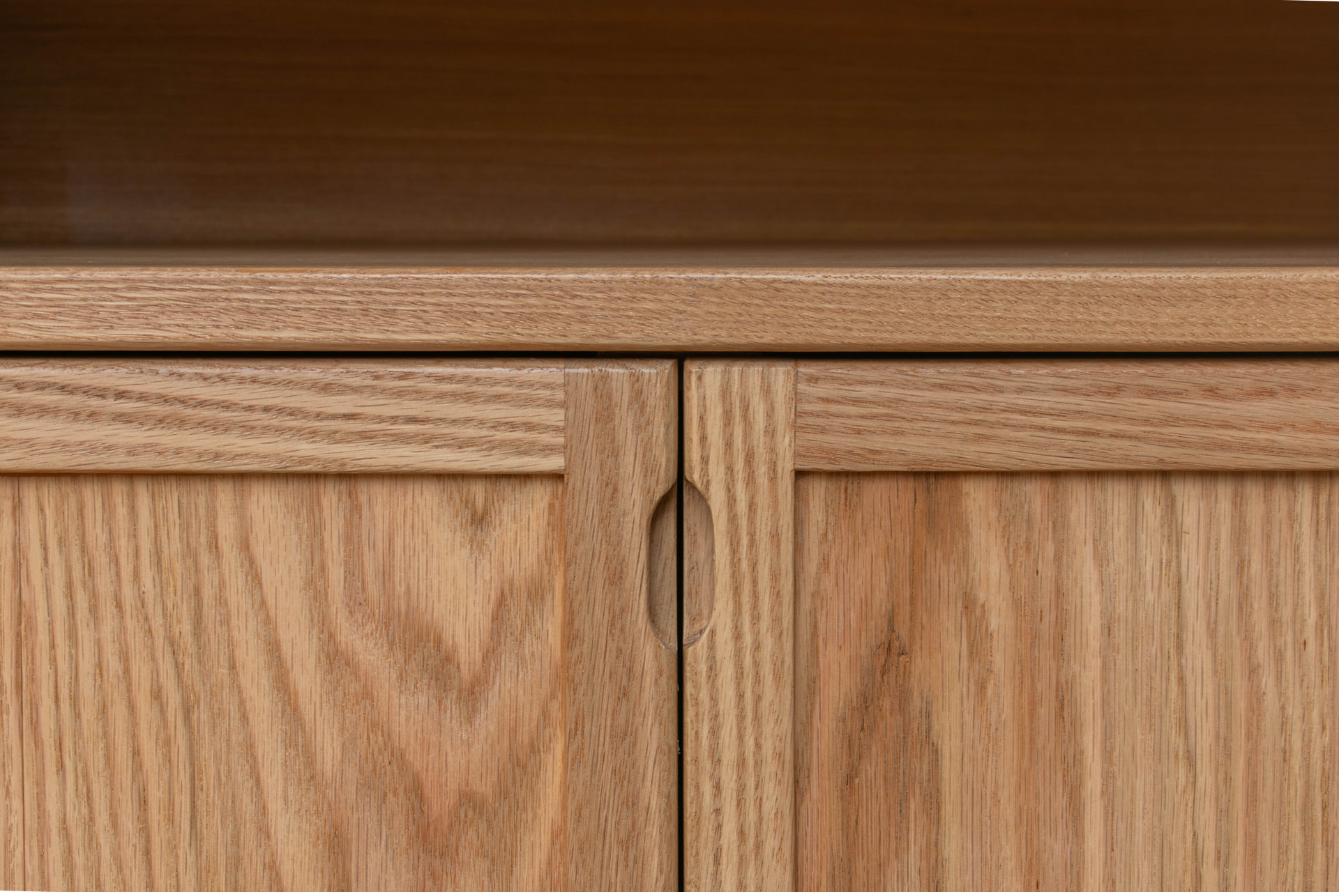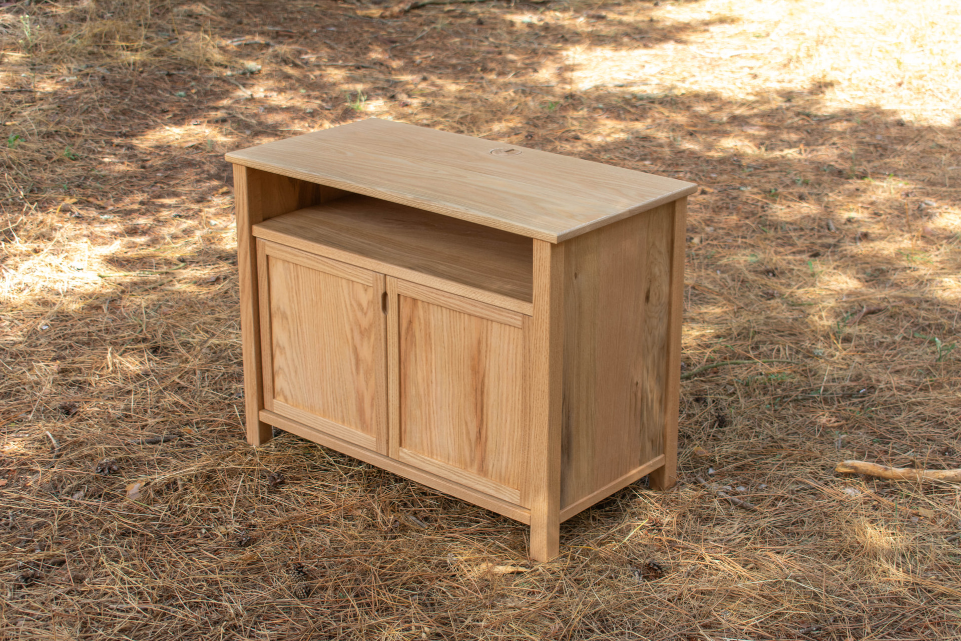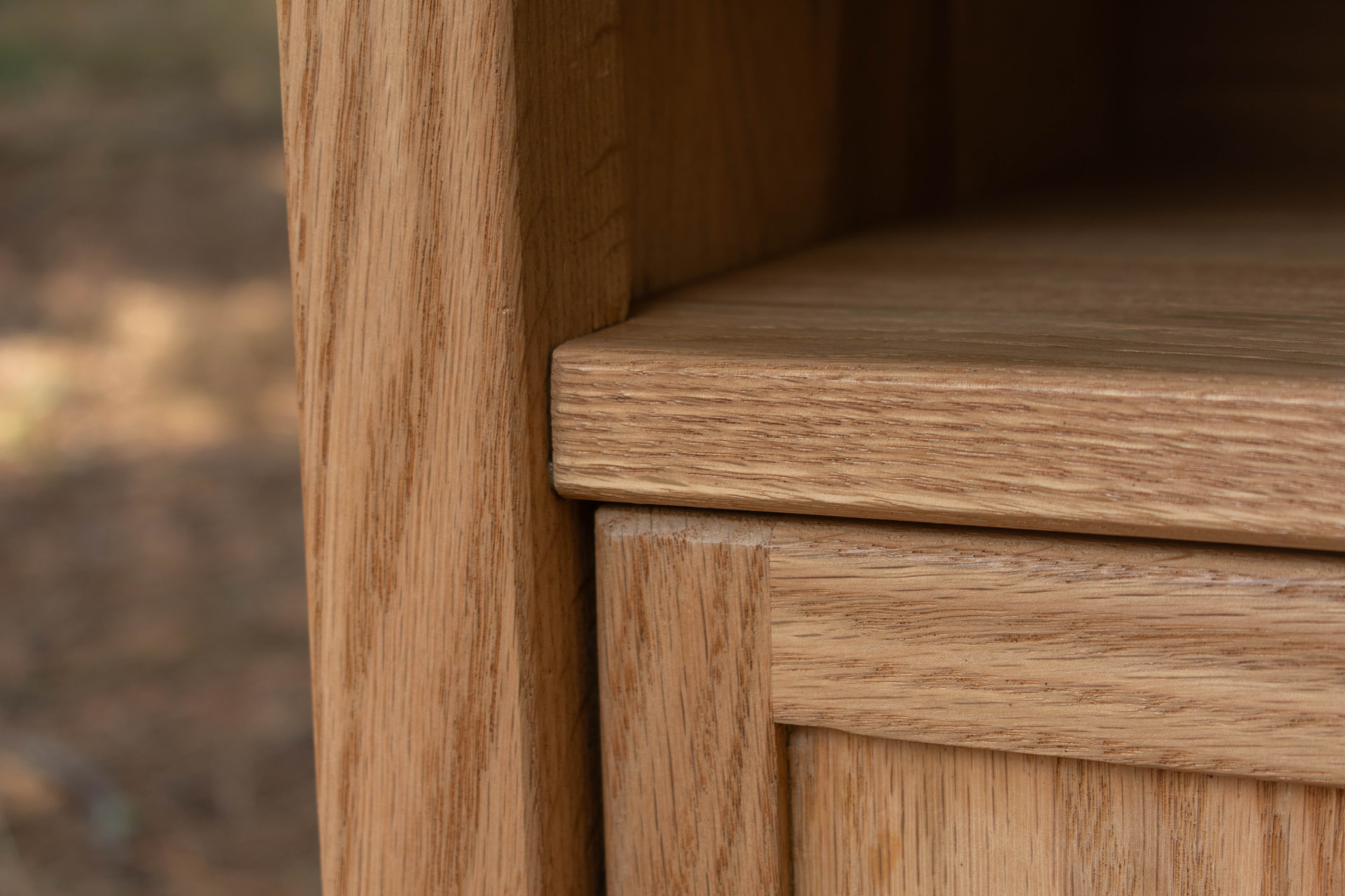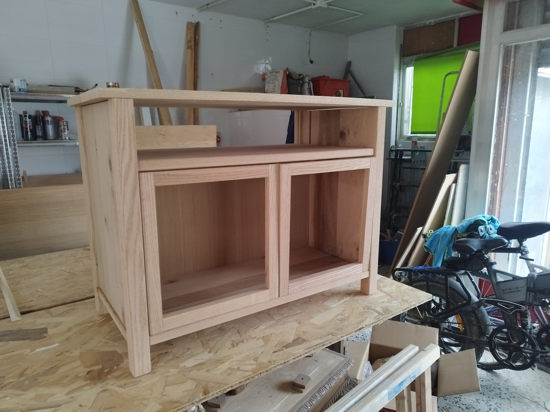 Adjunto fotos de mis dos primeros muebles de este estilo, creo que han quedado bien. Estructura de madera de roble y paneles de chapa de roble. En el de TV la tapa superior y las puertas son completamente macizas