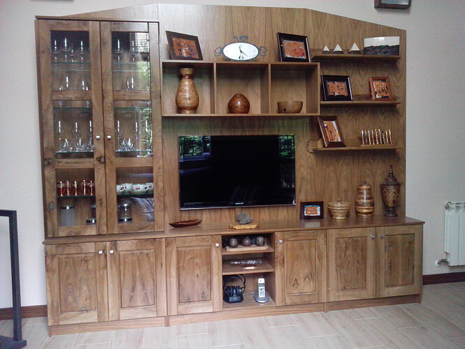 Buenos días a todos y todas. De la serie “amueblemos el salón de una vez” hoy presentamos la siguiente entrega: Mueble de salón. Realizado en nogal leones (los mismos que para la mesa y sillas que ya mostré por aquí y de los que aun queda bastante madera) y con la misma terminación. Los paneles de la pared son DM rechapado en nogal para que quede mas vistosa la veta y ahorrar tablas macizas para hacer un par de mesitas auxiliares. Adelante con criticas, comentarios, preguntas o consejos. Un saludo desde León.