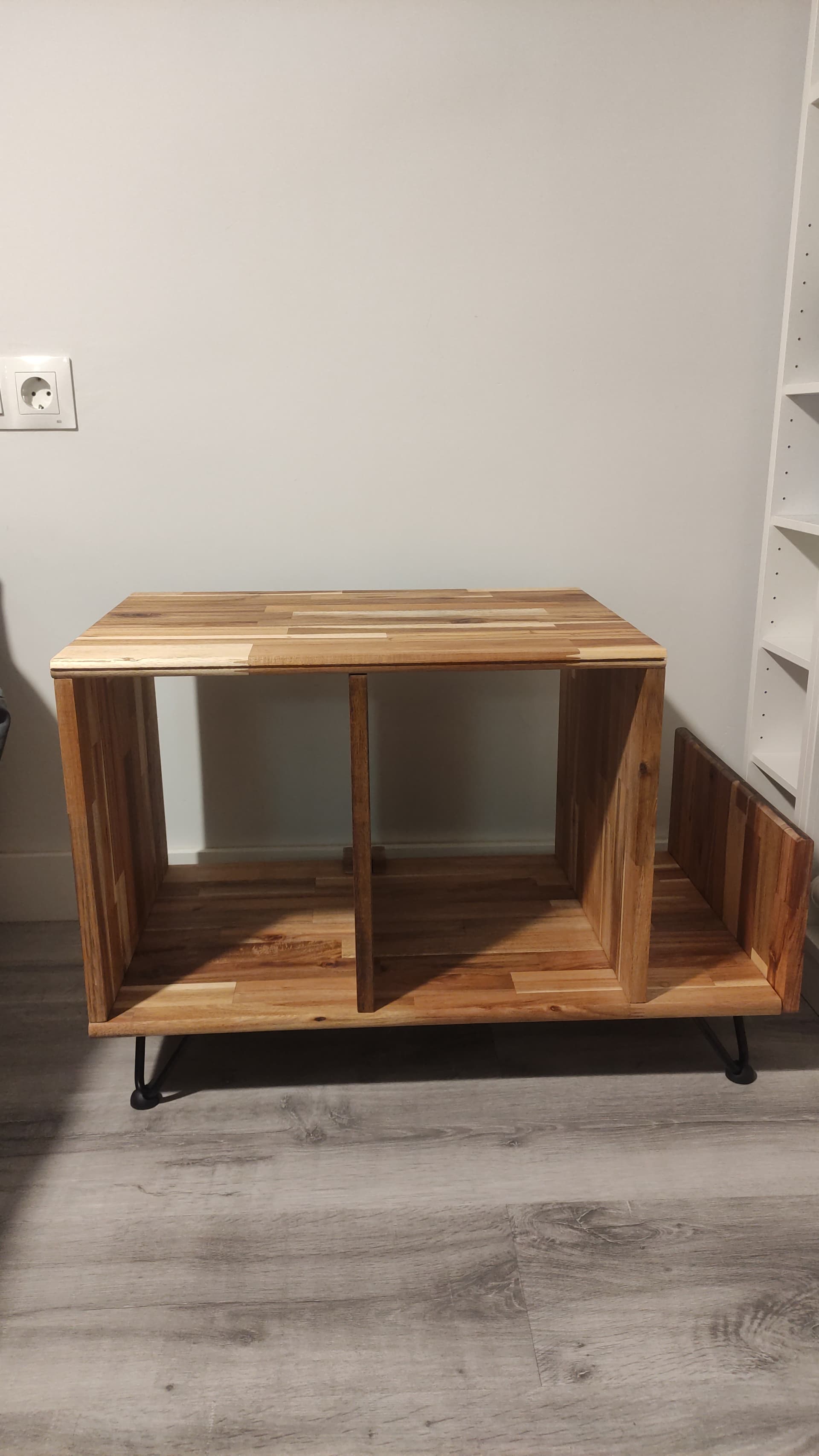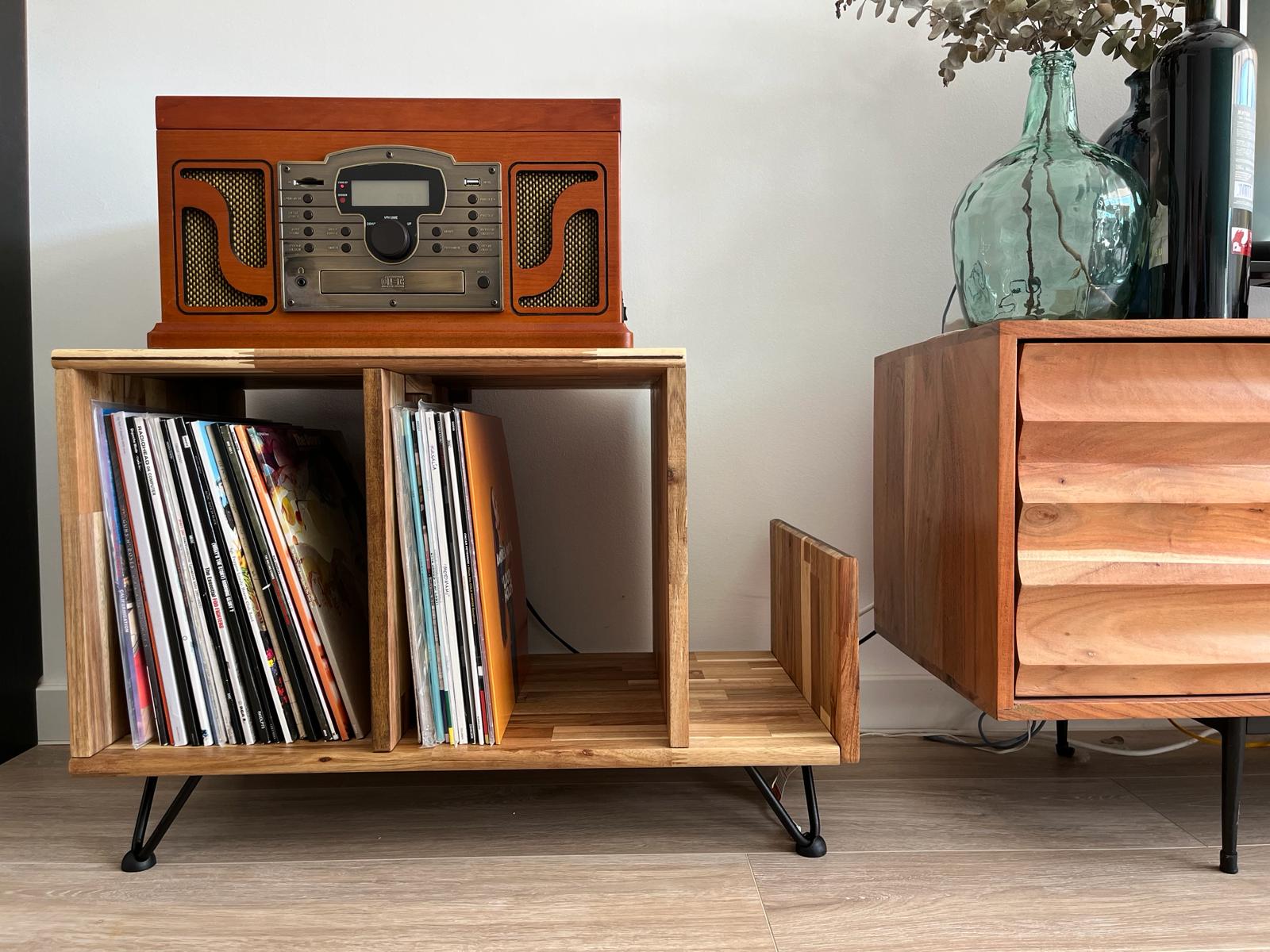 Es un mueble para tocadiscos hecho en acacia y con patas de metal para un pequeño espacio a aprovechar.