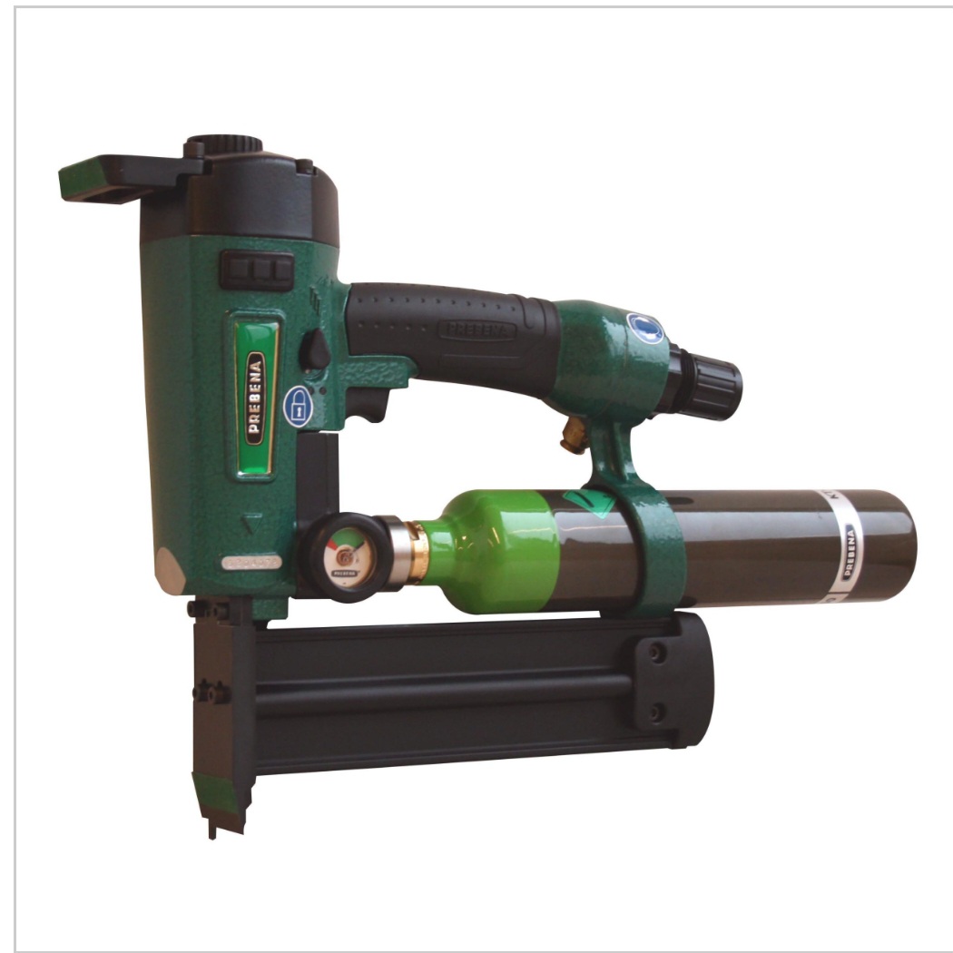 Ese sistema se puede hacer relativamente fácil con una mini botella de carabina de aire comprimido. Yo era algo que hacía mucho antes, tenía botellas de aire de 0.8l que cargaba a 232bares desde una botella de buceo, a la botella le conectaba un regulador y un latiguillo, regulado a 80bares, y este lo conectaba a pistolas de co2 o carabinas. Si tu lo regulas a 8 bares que es a lo que van las pistolas puede durar mogollón de puntas sin gastarse y luego lo recargas de nuevo a 200bares o 232 desde la botella grande. Para cargar la botella grande lo ideal era llevarla a cargar a una tienda de buceo que salía en unos 8€