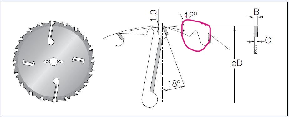 Estos discos están diseñados con un saliente en el cuerpo del acero justo delante de cada diente de carburo. Su función principal es controlar el espesor de la viruta y evitar que el disco muerda demasiada madera de golpe, lo que reduce drásticamente el riesgo de retroceso (kickback),