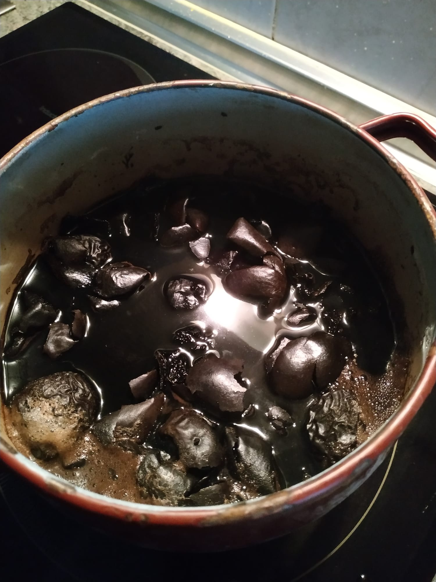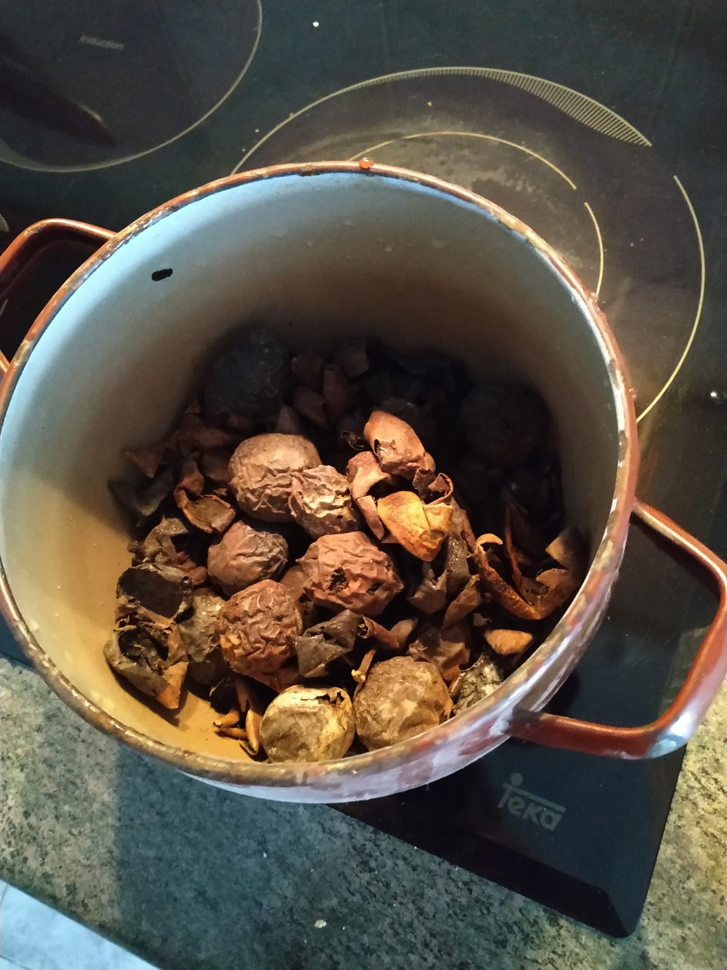 No tenía ni idea de como se hacía, busqué un poco por internet y el fin de semana hice la prueba. en una cazuela vieja puse las pieles (alguna nuez había también) con agua y a fuego lento lo tuve un par de horas. El olor me revolvía un poco las tripas así que todo abierto, extractor a tope y sólo me pasaba de vez en cuando a ver cómo iba.