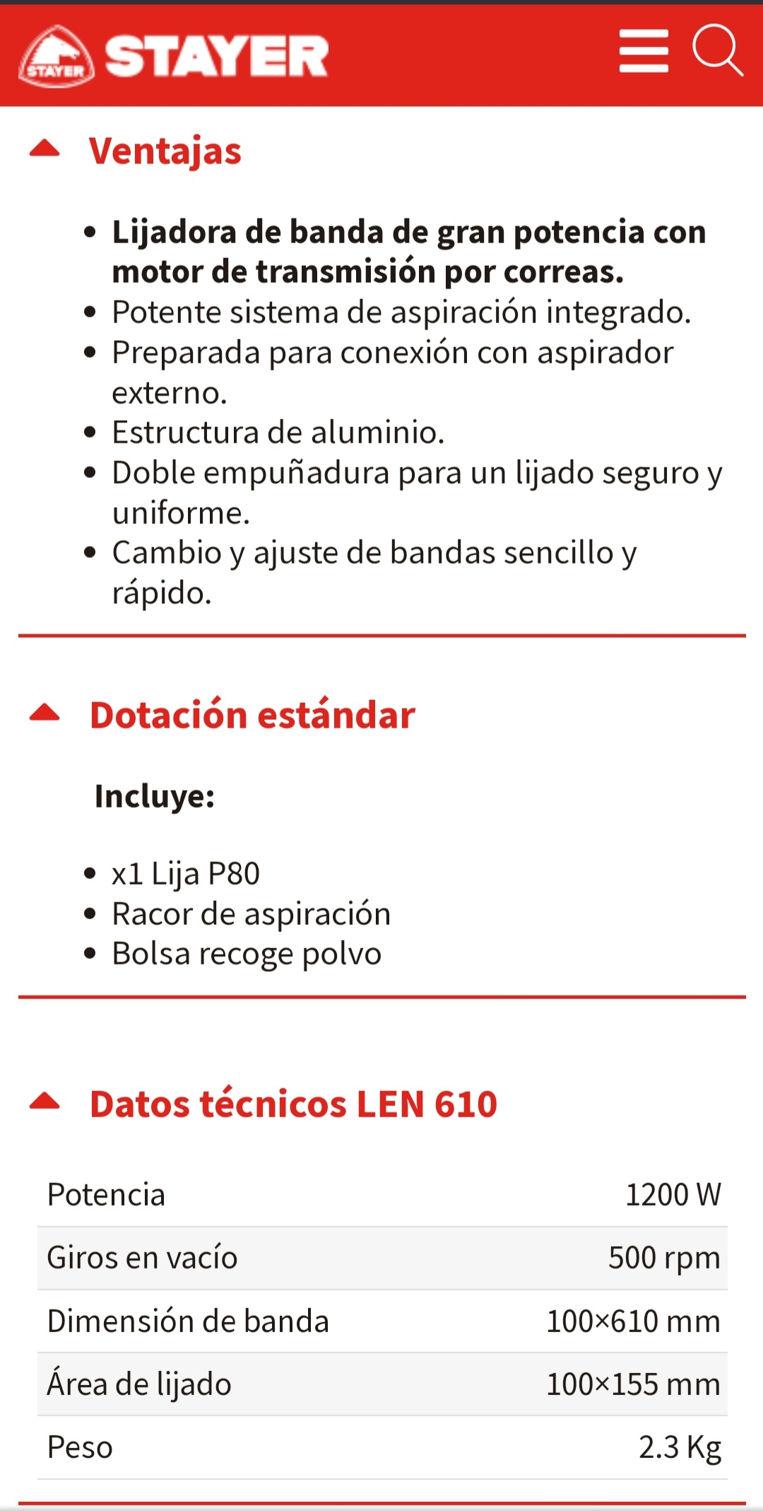Peso de la makita, 5,7kg, la stayer 2,3kg. Además de que el peso ayuda a la hora de usarla (en las superficies horizontales, claro