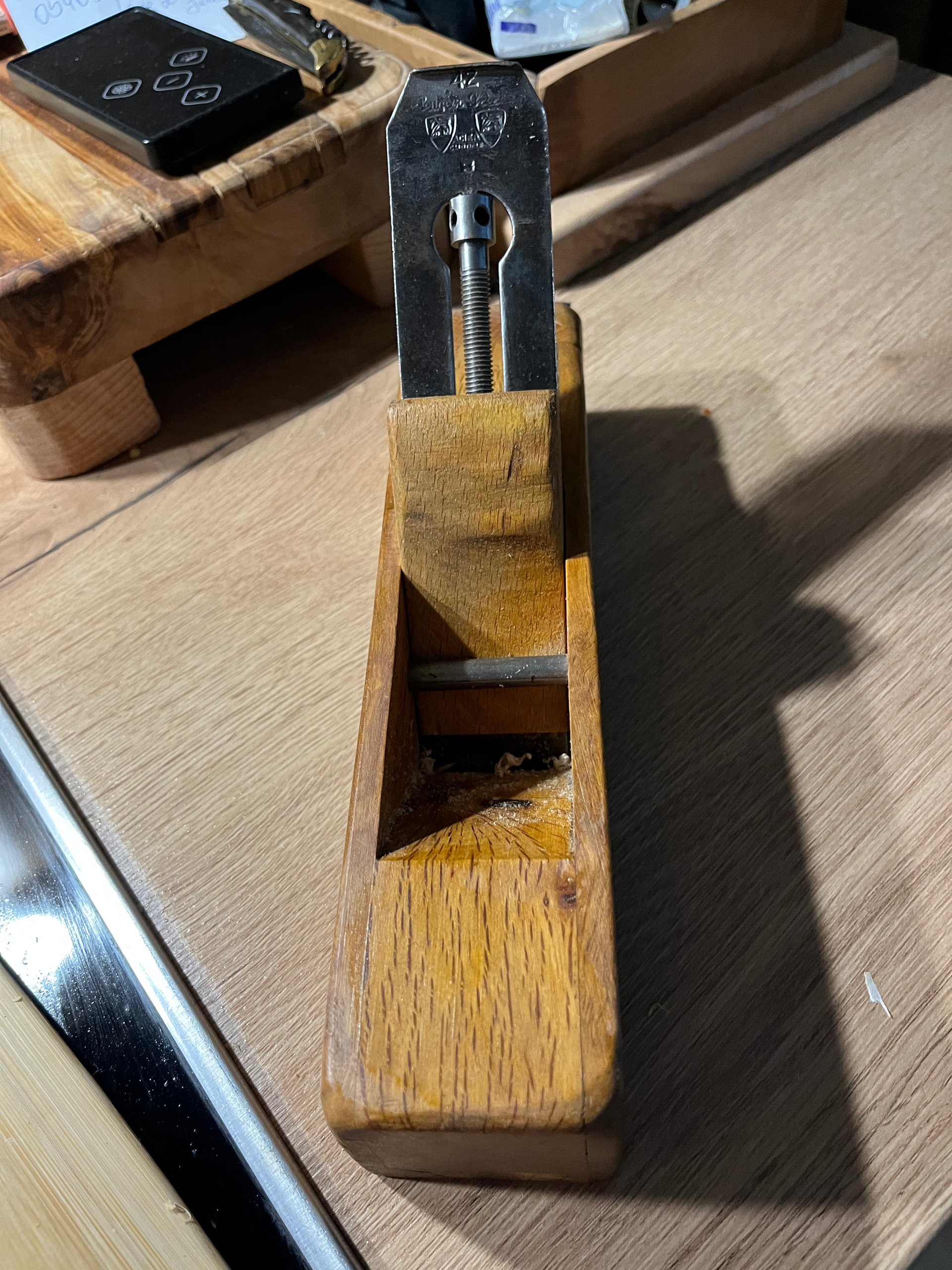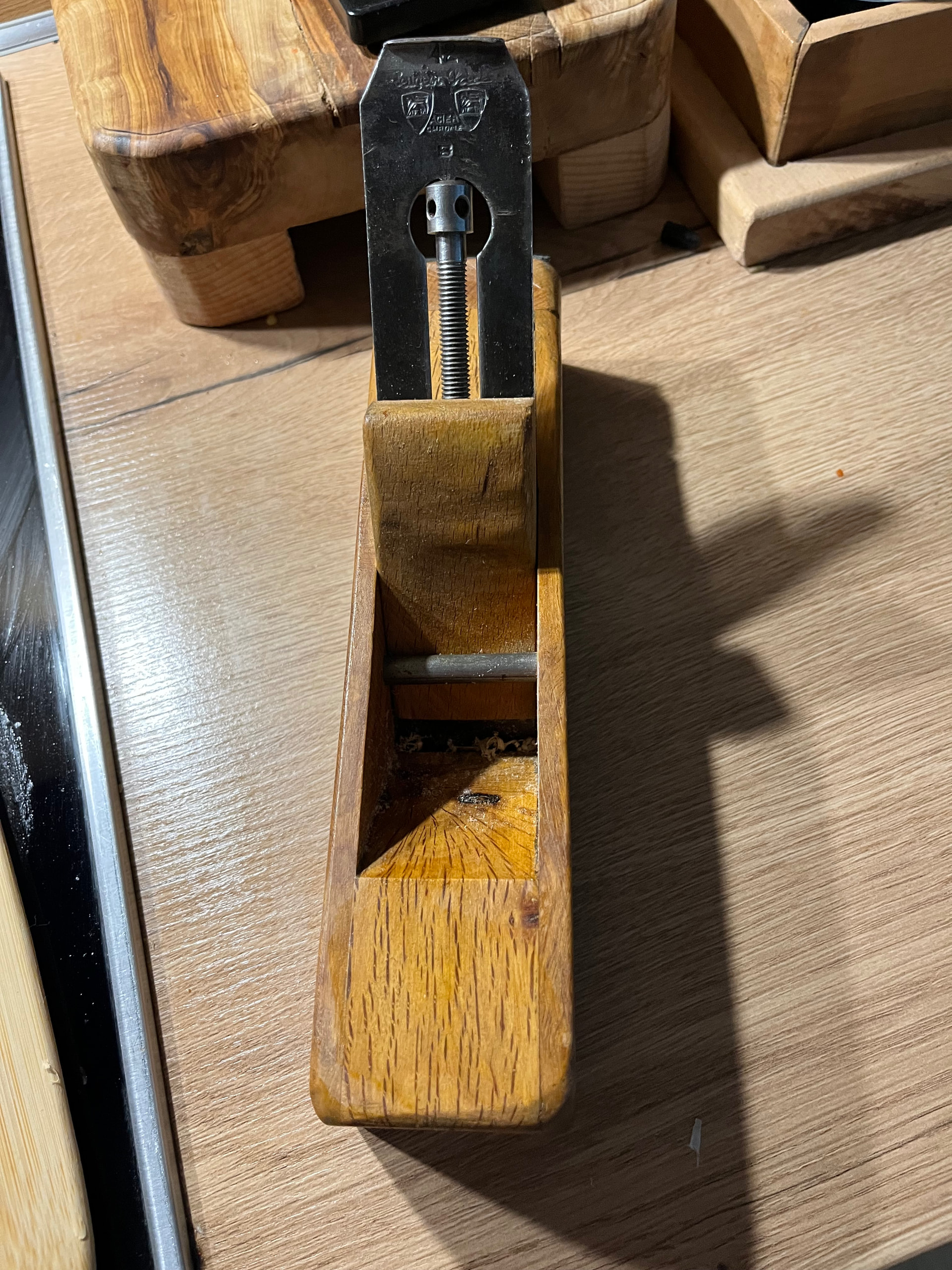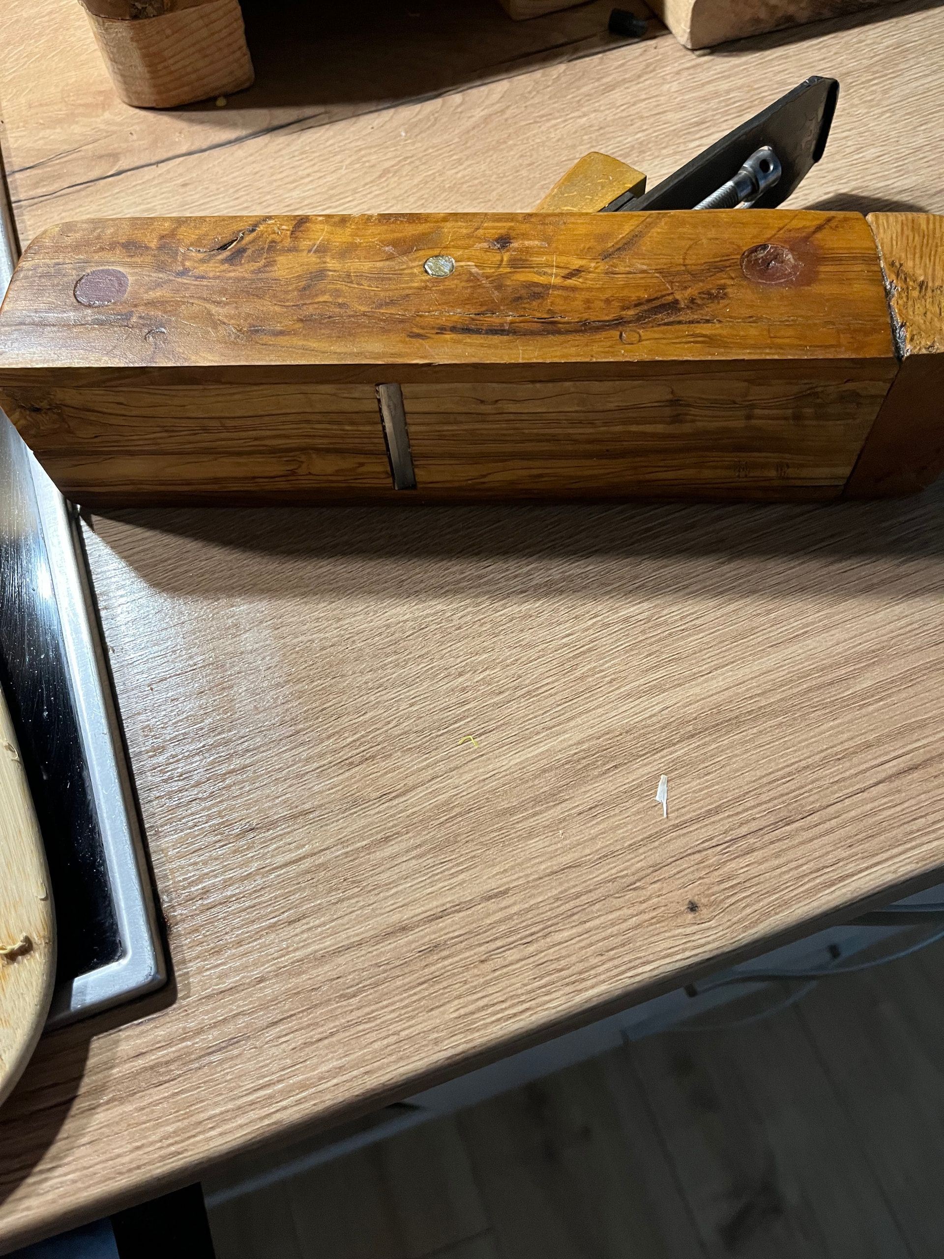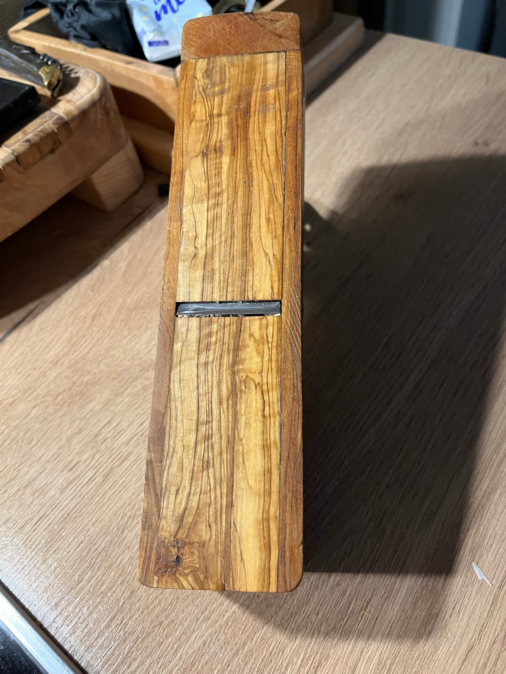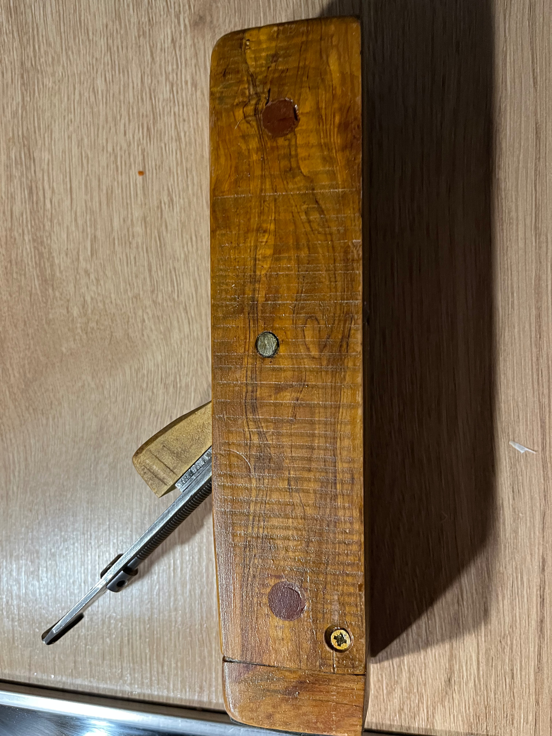 Cuerpo de Encina , la base es de Olivo Parte frontal de Encina y los laterales de De roble o Castaño no me acuerdo .Cuchilla Peugeot Frères 44mm y para finition va perfecto ..Estoy esperando Encina y haré 1 de Angulo bajo con cama de 12 grados .Tengo un par de cuchillas low angle de 50mm en P-MV11 y A2 de Veritas para este proyecto.