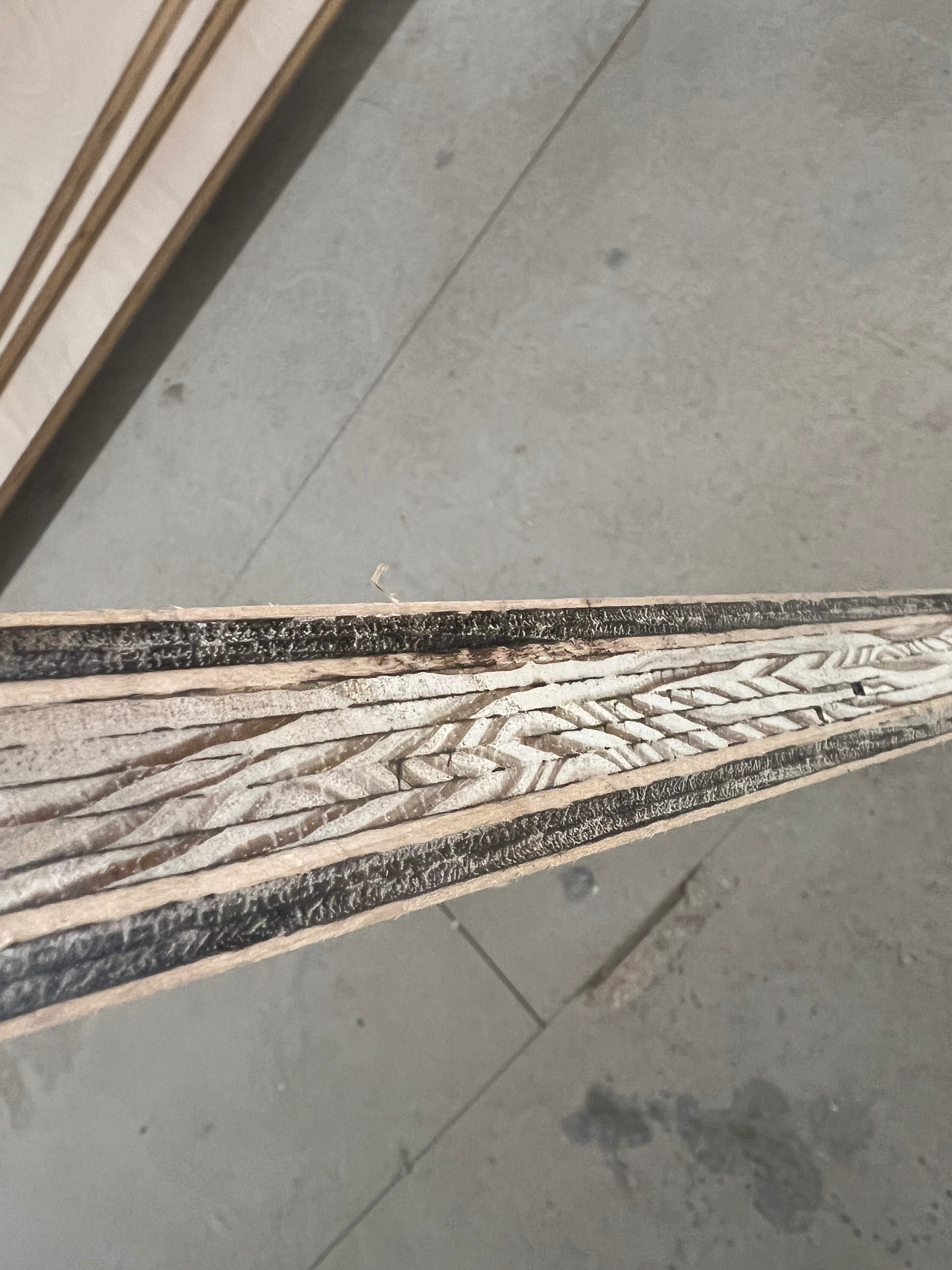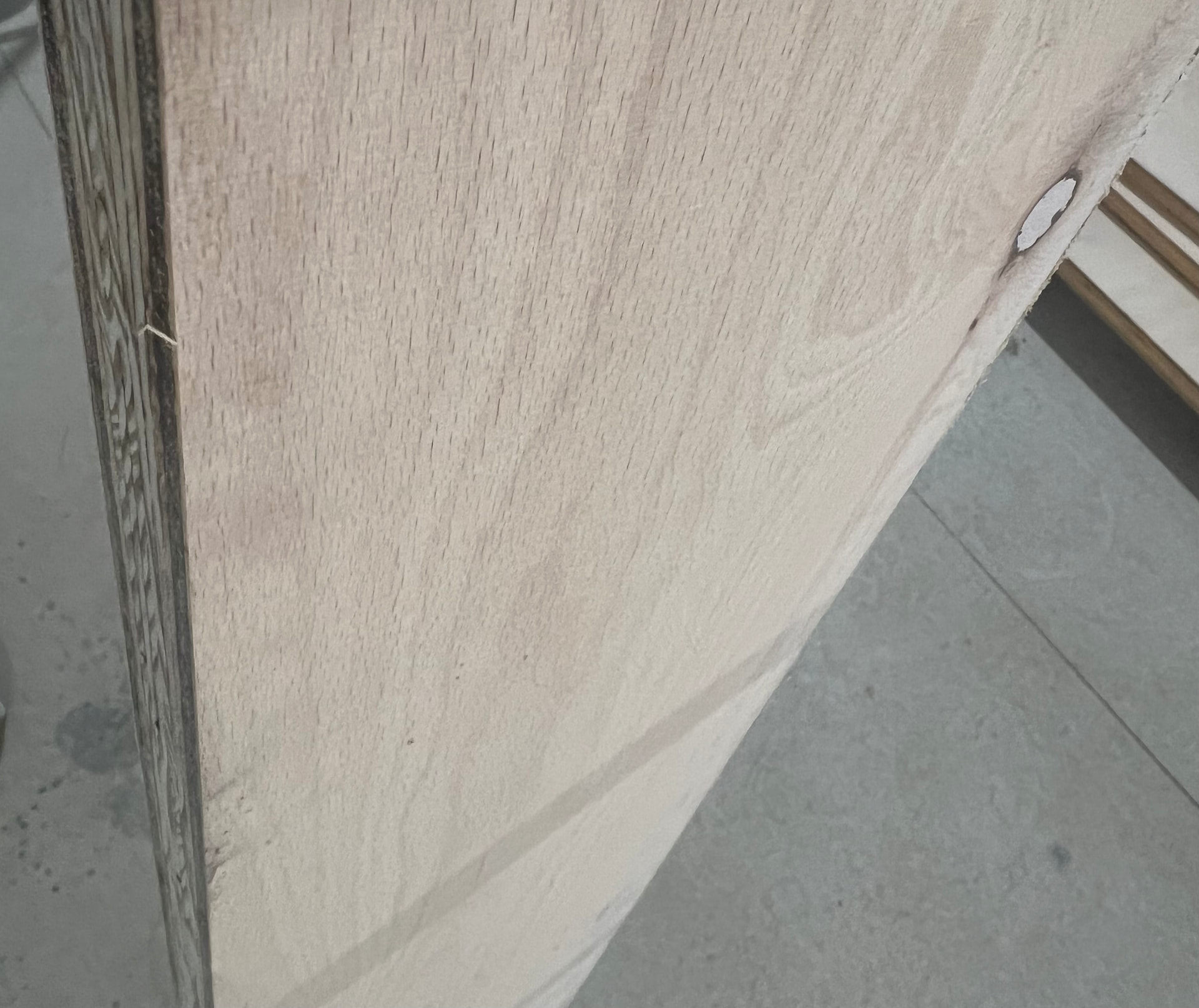 Todo el pino y las chapas más oscuras van en la dirección larga del tablero, solo el haya va a la contra. El tablero es de un grueso ya considerable, es de 28, lo que también hace que el corte sea más lento.
