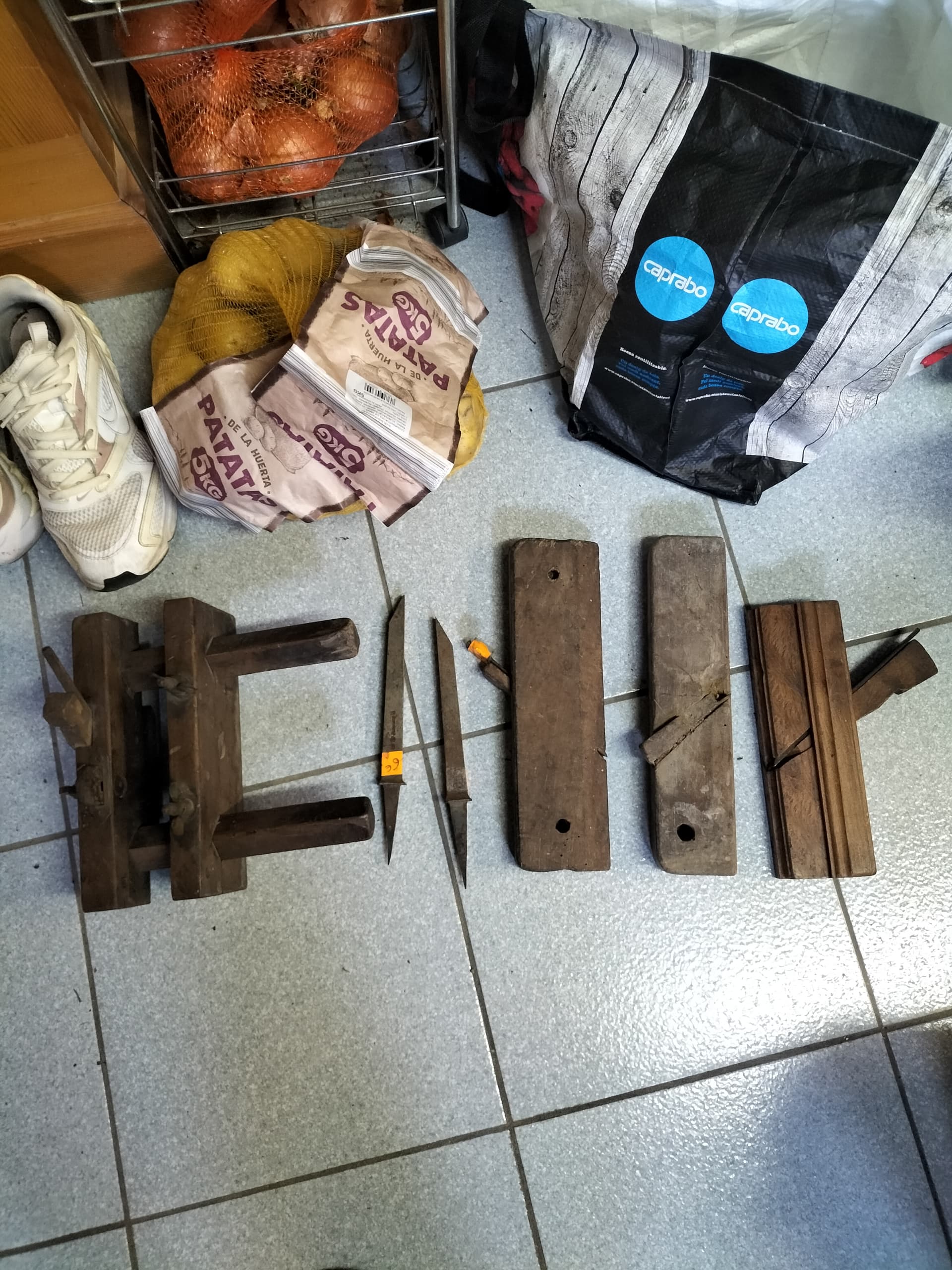 De las mismas tiendas de antigüedades, he comprado unos muy viejos cepillos con formas, uno de ranuras con guía y tope ajustable (plough plane) y dos formones de caja sin mango. Dos tienen o han tenido carcoma y copiaré la base, los otros, espero, recuperables. 50€ en total.