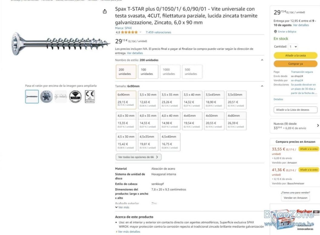 Y otra de tirafondos con cabeza T20, en medida 6x90, cajas de 200 unidades y a 10,42 €