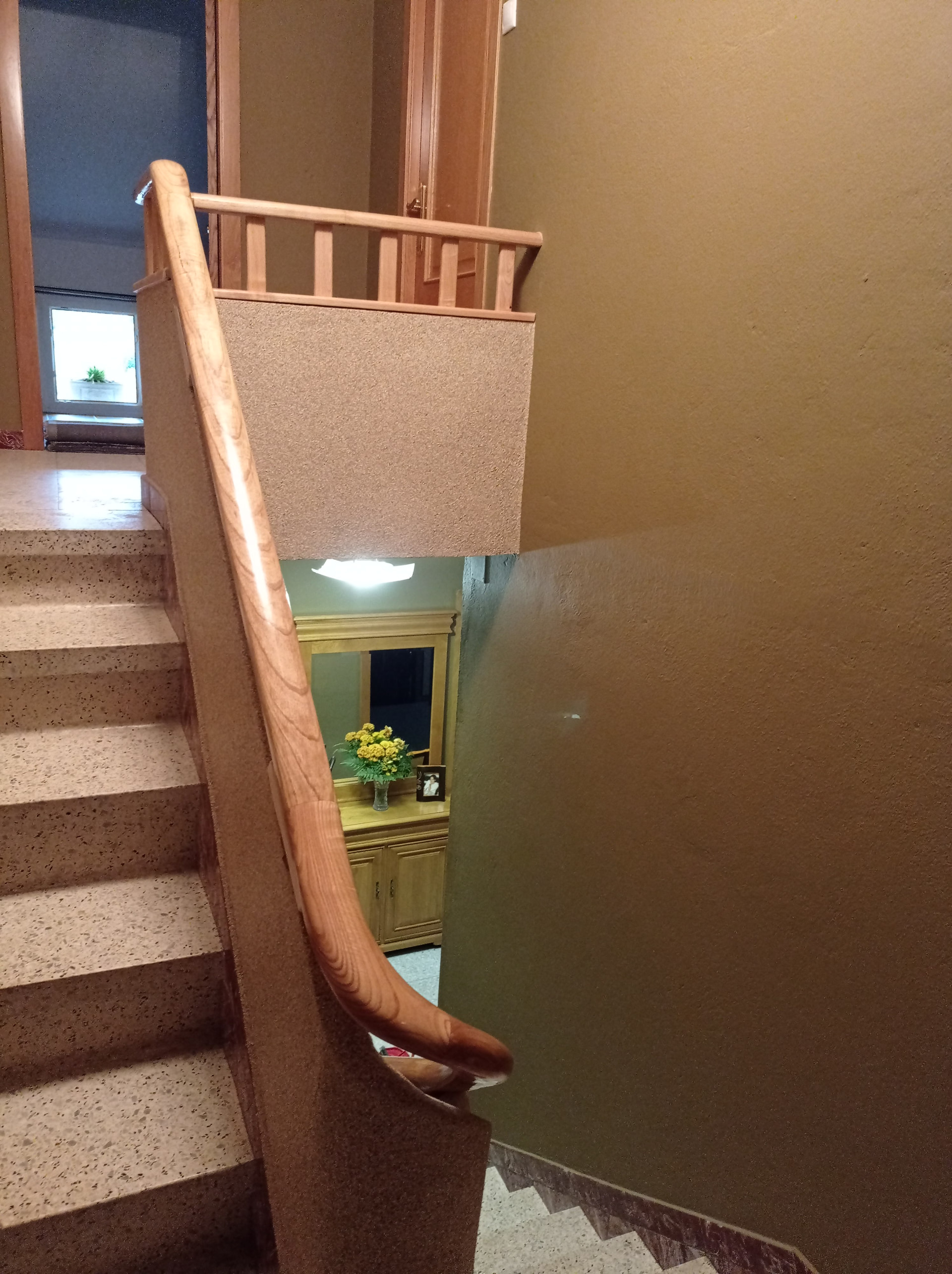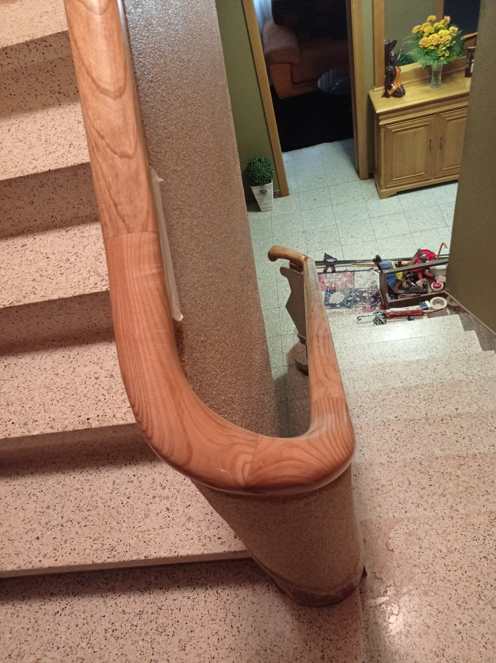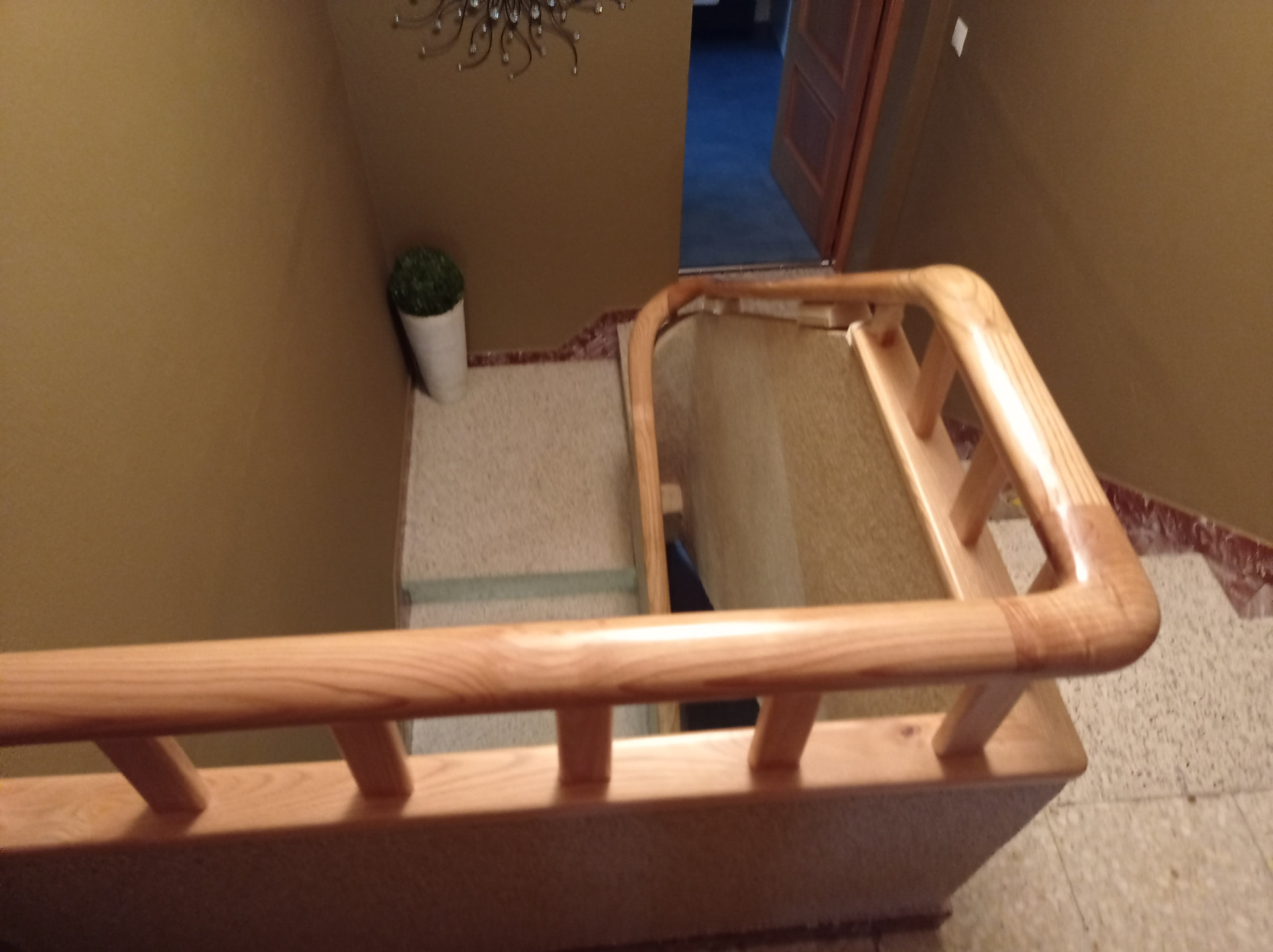 Este es un pasamanos de castaño sobre murete con sus curvas. Como vivían en la casa, y no era plan dejarla como una panadería, lo barnicé a brocha y no quedó muy mal.