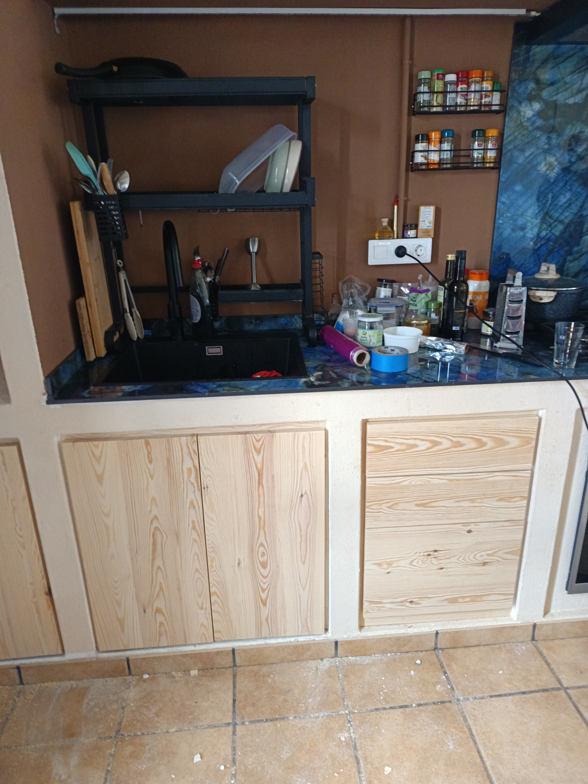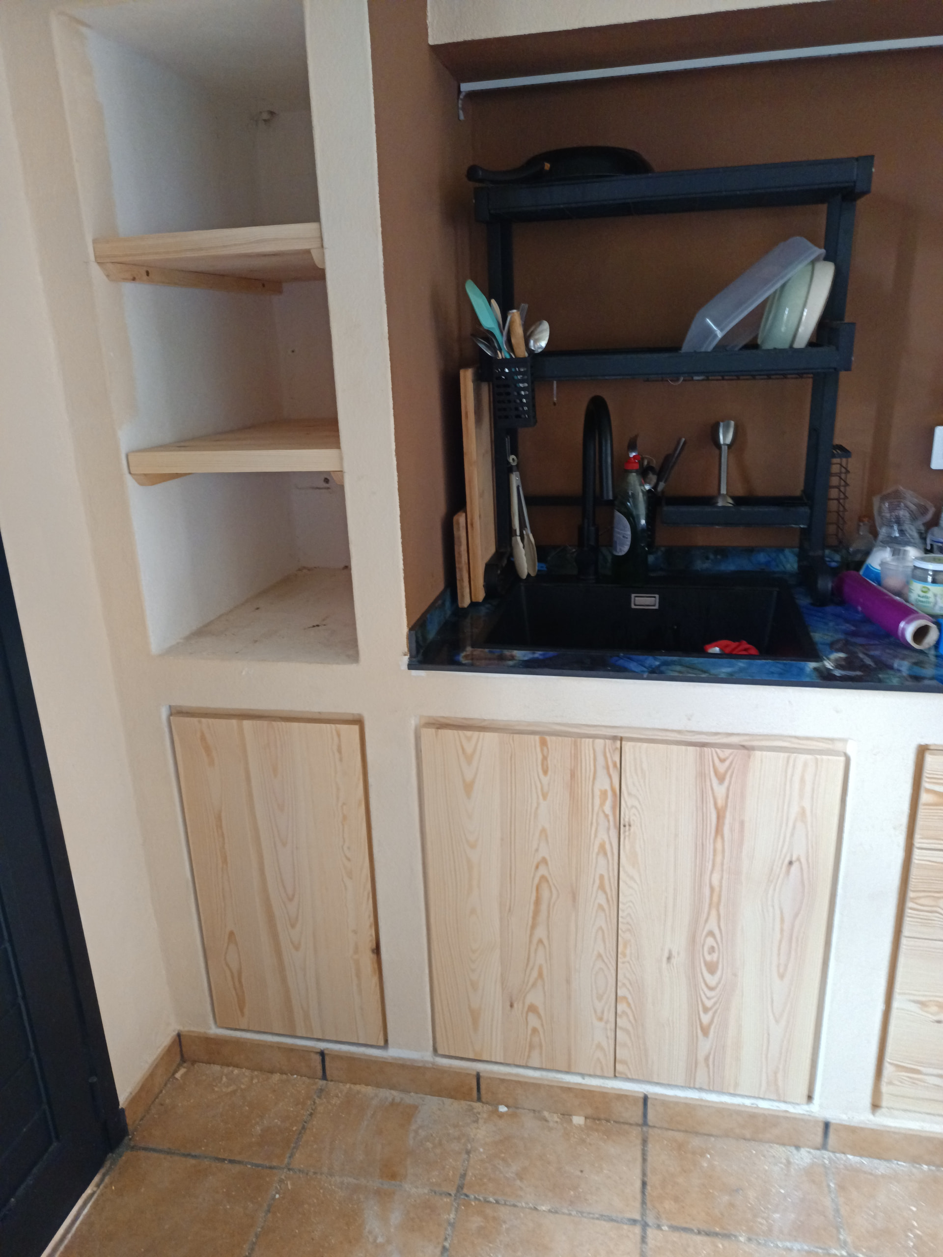 Por aquí se han vuelto a poner de moda las cocinas de obra, está es de un pequeño estudio la madera elegida pino Flandes dos estantes pequeña puerta ,bajo fregadera y una pequeña cajonera , con la premisa de que fuera lo más económico posible, espero que con el acabado no la oscurezcan demasiado.