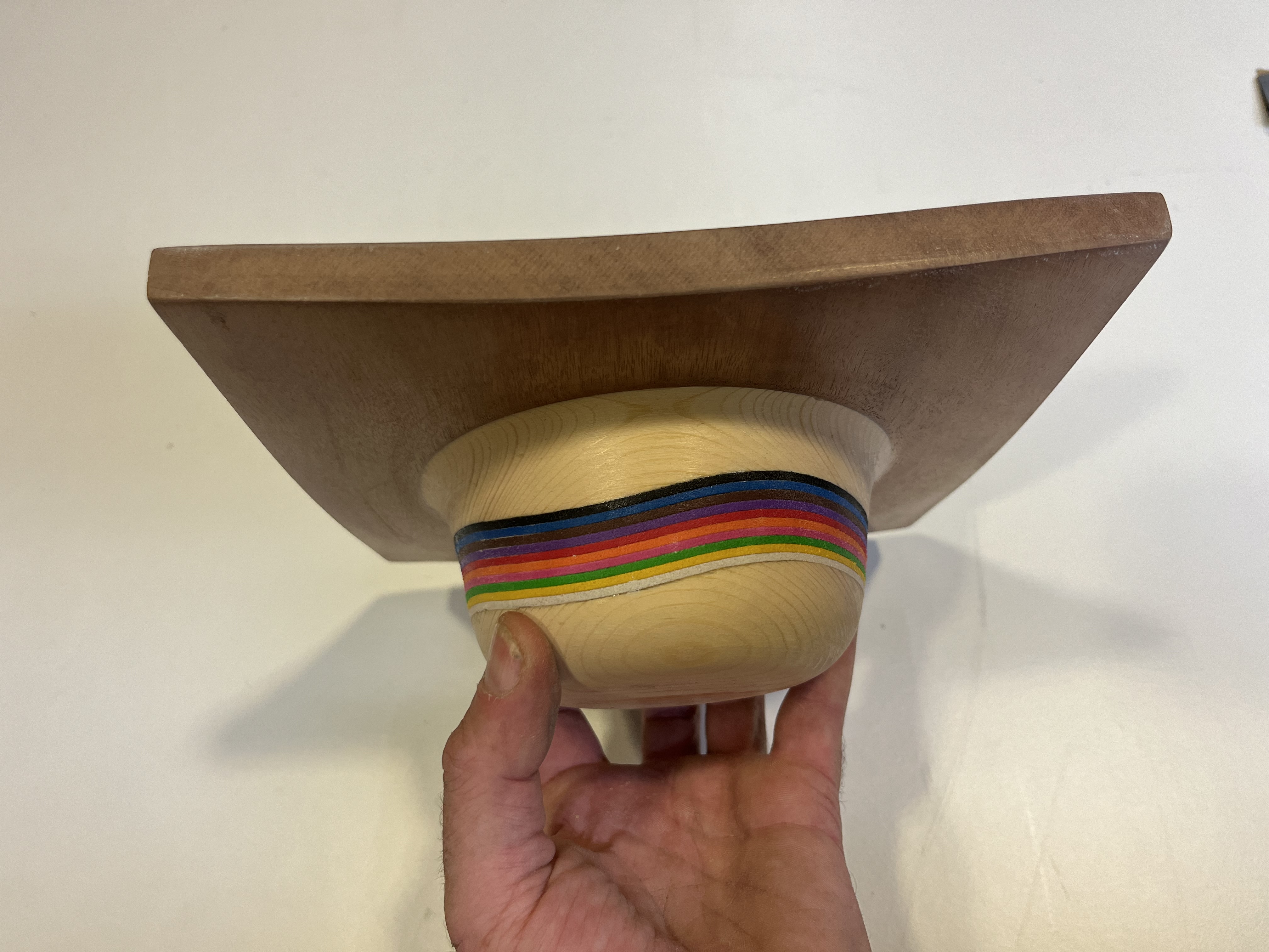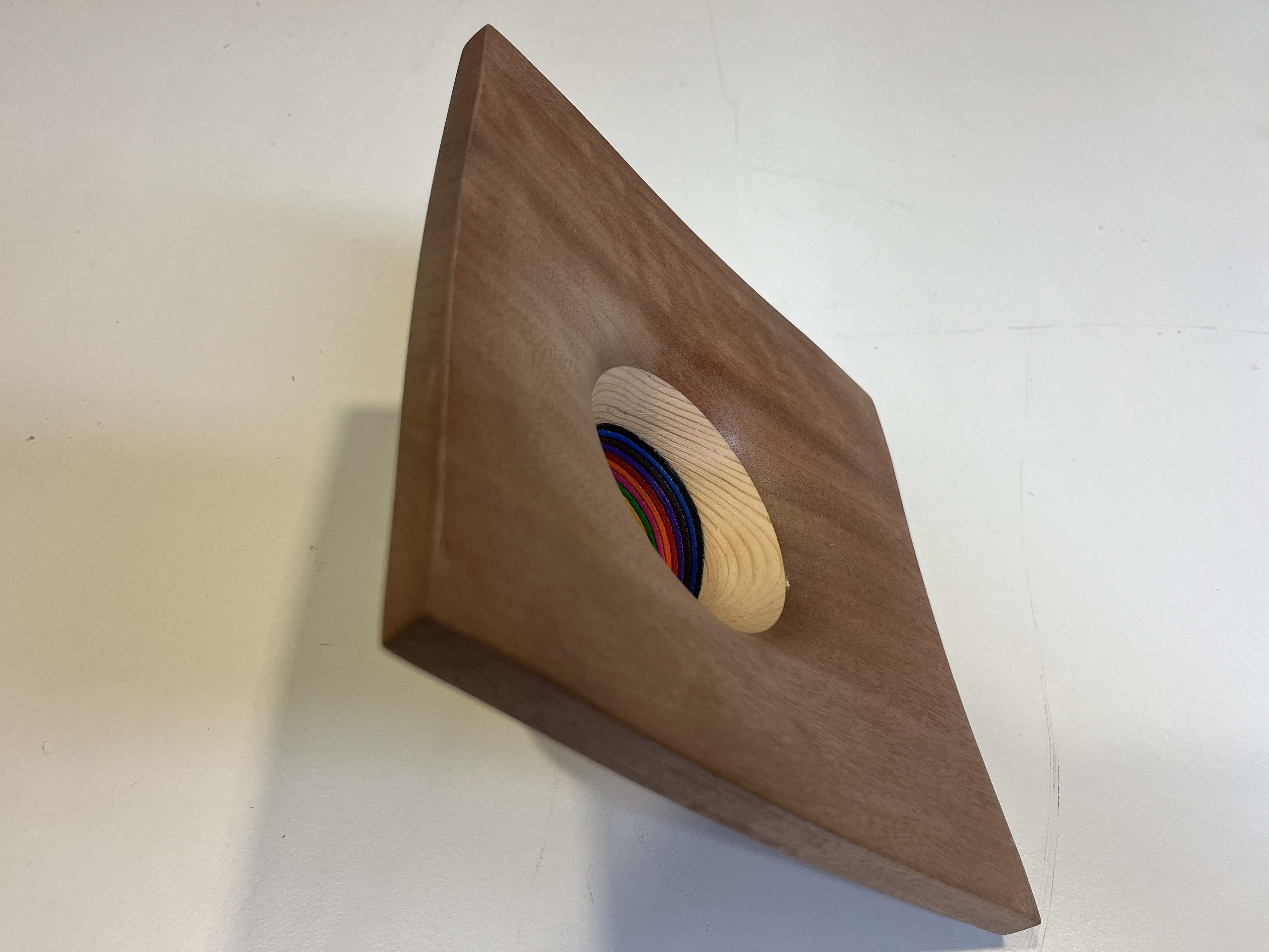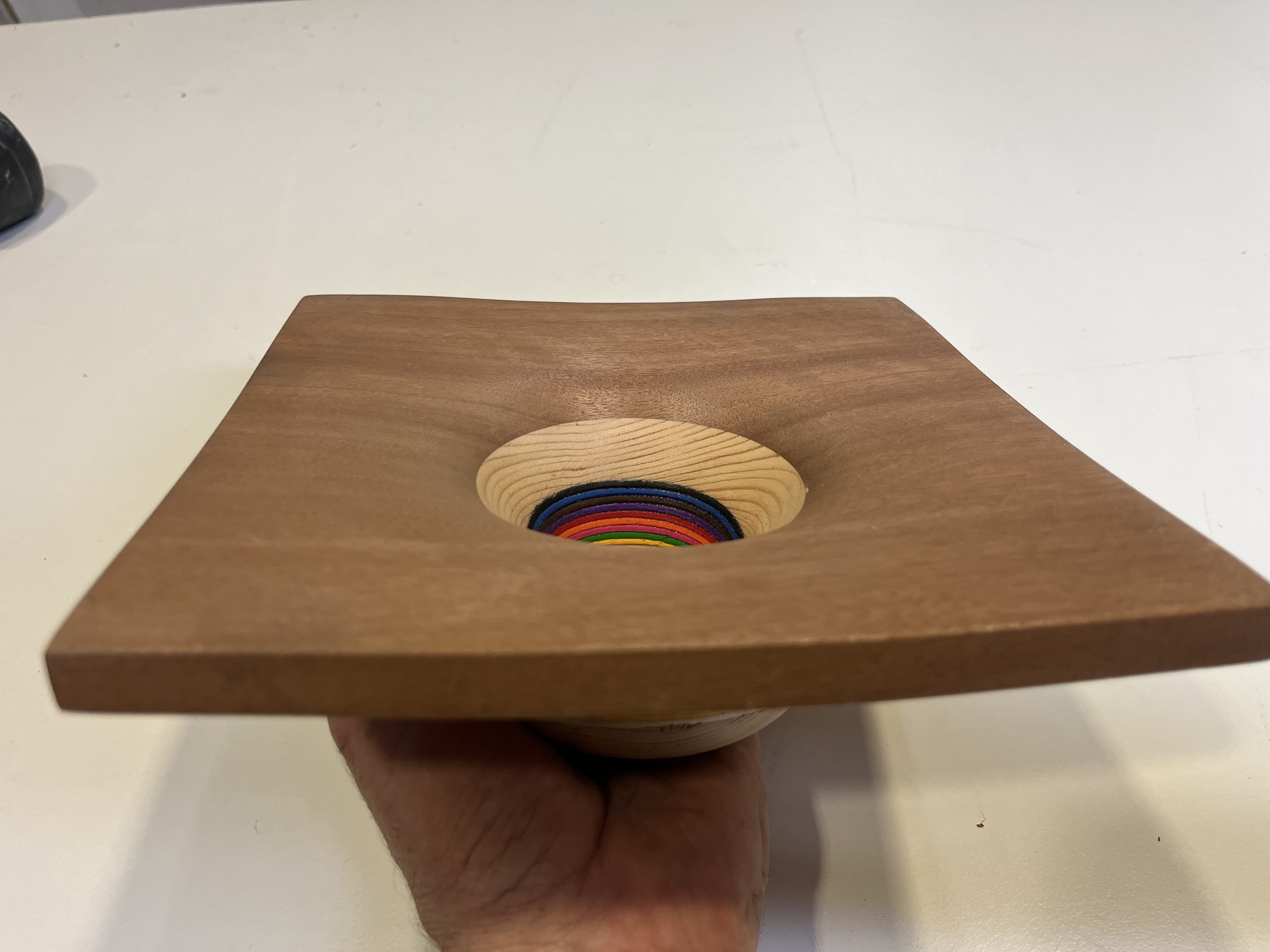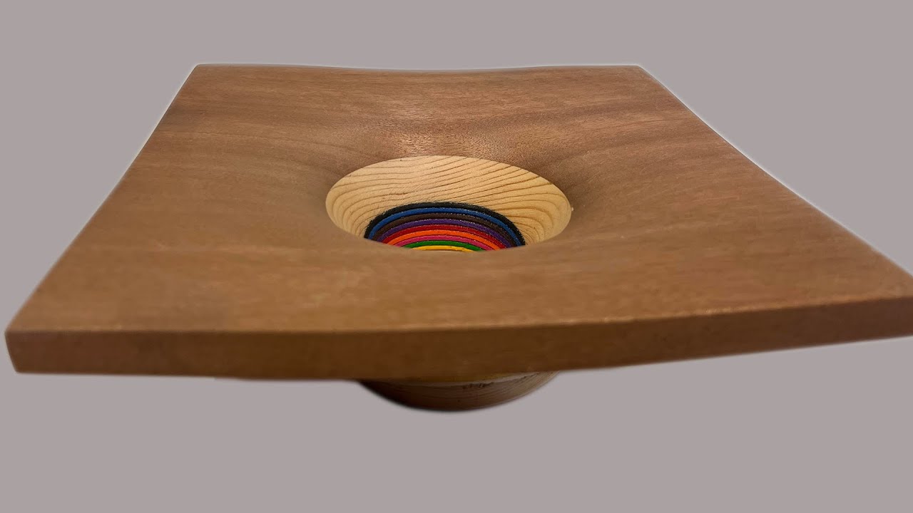 A falta de acabo final de lija fina y barniz, en esta ocasión, he trabajado en una pequeña fuente cuadrada utilizando una combinación de madera de sapelli, pino y gomaeva. El desafío principal de esta pieza no radica únicamente en la diferencia de dureza entre el sapelli, que cubre la parte superior, y el pino, que forma la base, sino en el hecho de que en el centro he encolado 10 piezas de gomaeva. Este material introduce una dificultad adicional, ya que al tornear, es necesario hacerlo con la precisión y delicadeza de un bailarín de ballet. Cualquier movimiento brusco o falta de control puede resultar en la rotura de la pieza durante el proceso de torneado, aunque no son las maderas más bonitas, ahí dejo unas fotos, mañana subiré el vídeo del proceso de principio a fin.