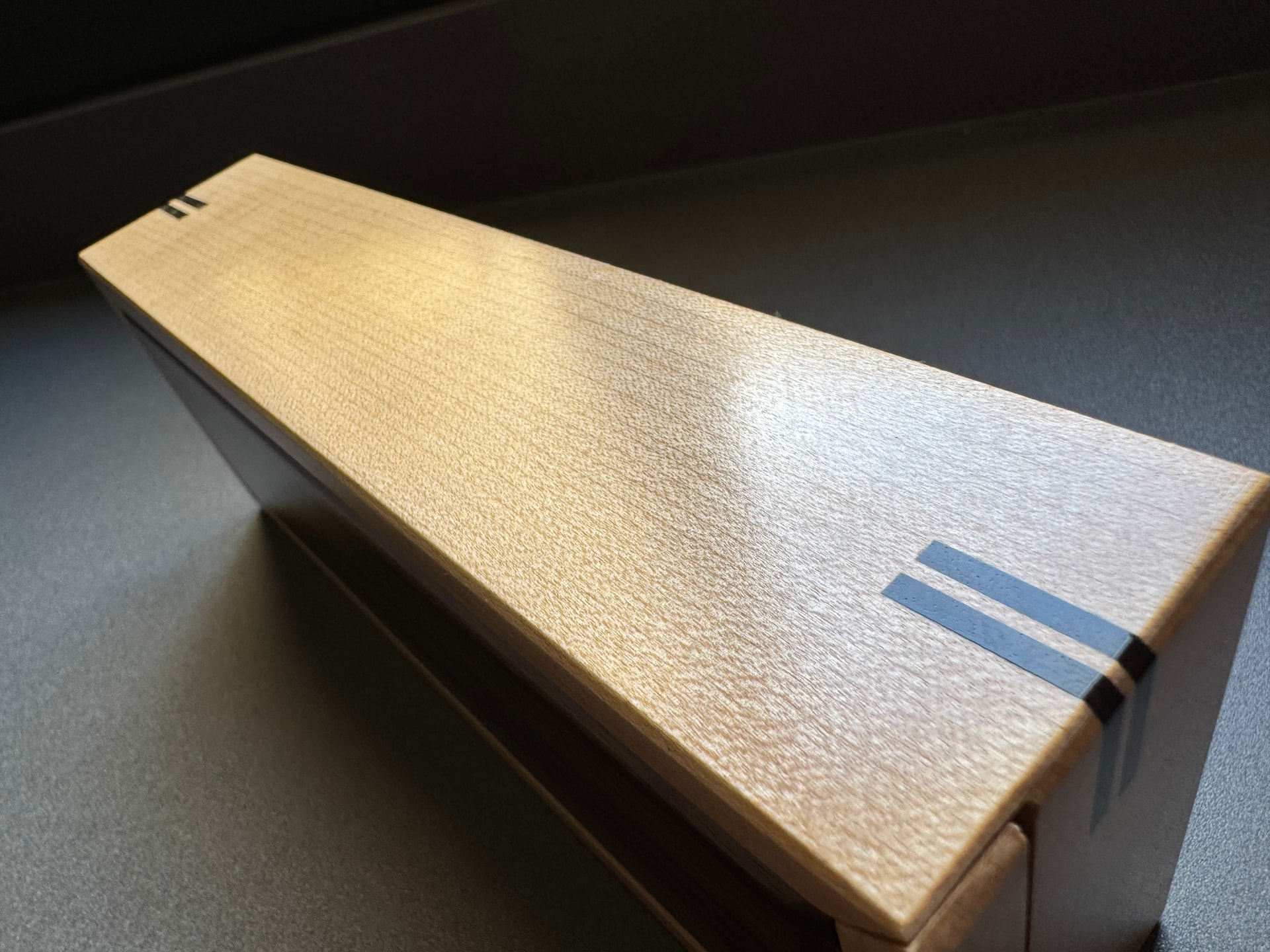 Entre esperas que tengo que hacer con la caja para la limpieza de zapatos, me propuse tener un par de proyectos sencillos. Uno de ellos es esta caja (las cajas nunca sobran y siempre agradan a quien las recibe). Arce duro, ébano para las costilla y ébano exótico para la tapa. Acabado en goma laca. Espero que os guste.