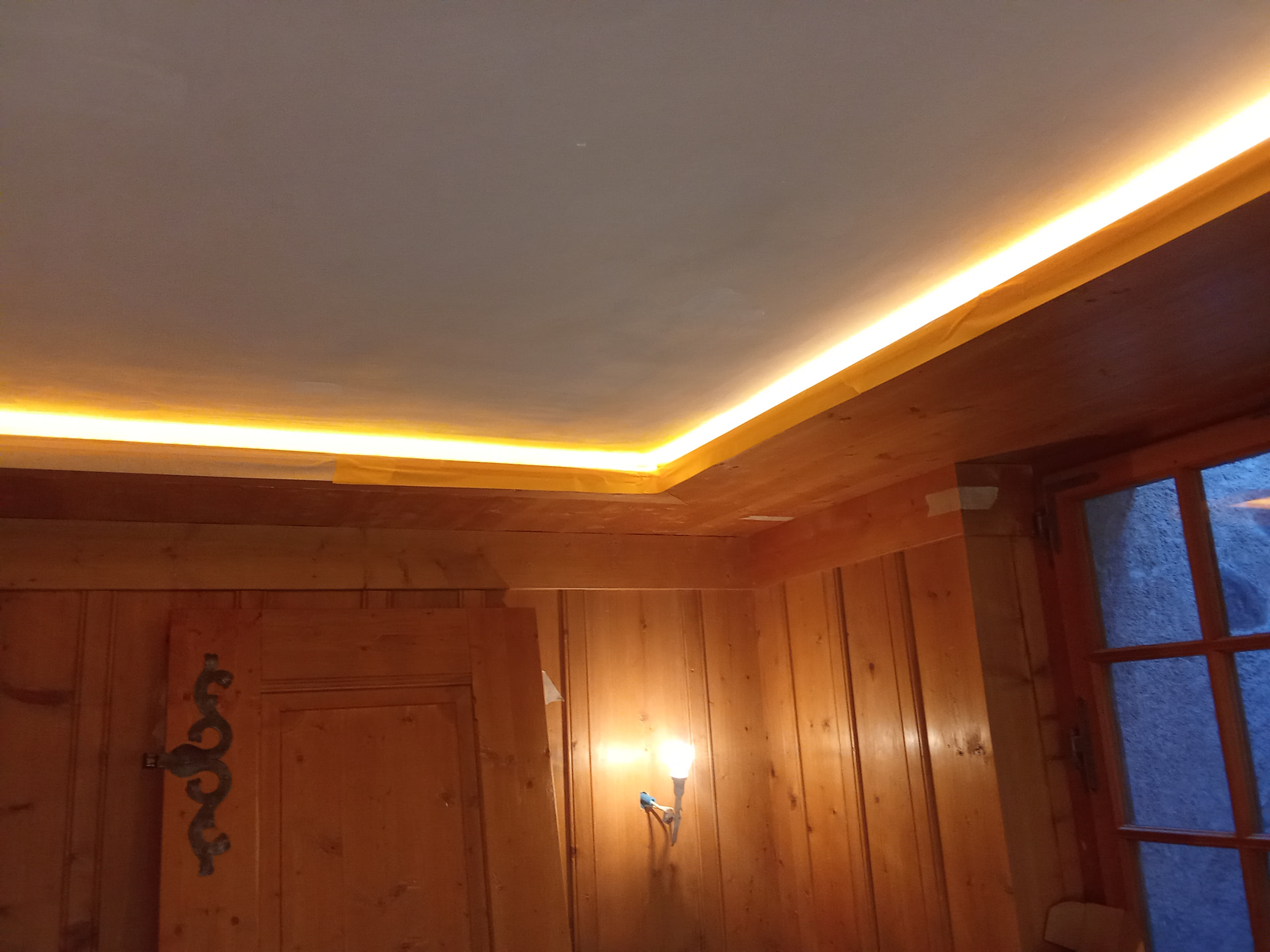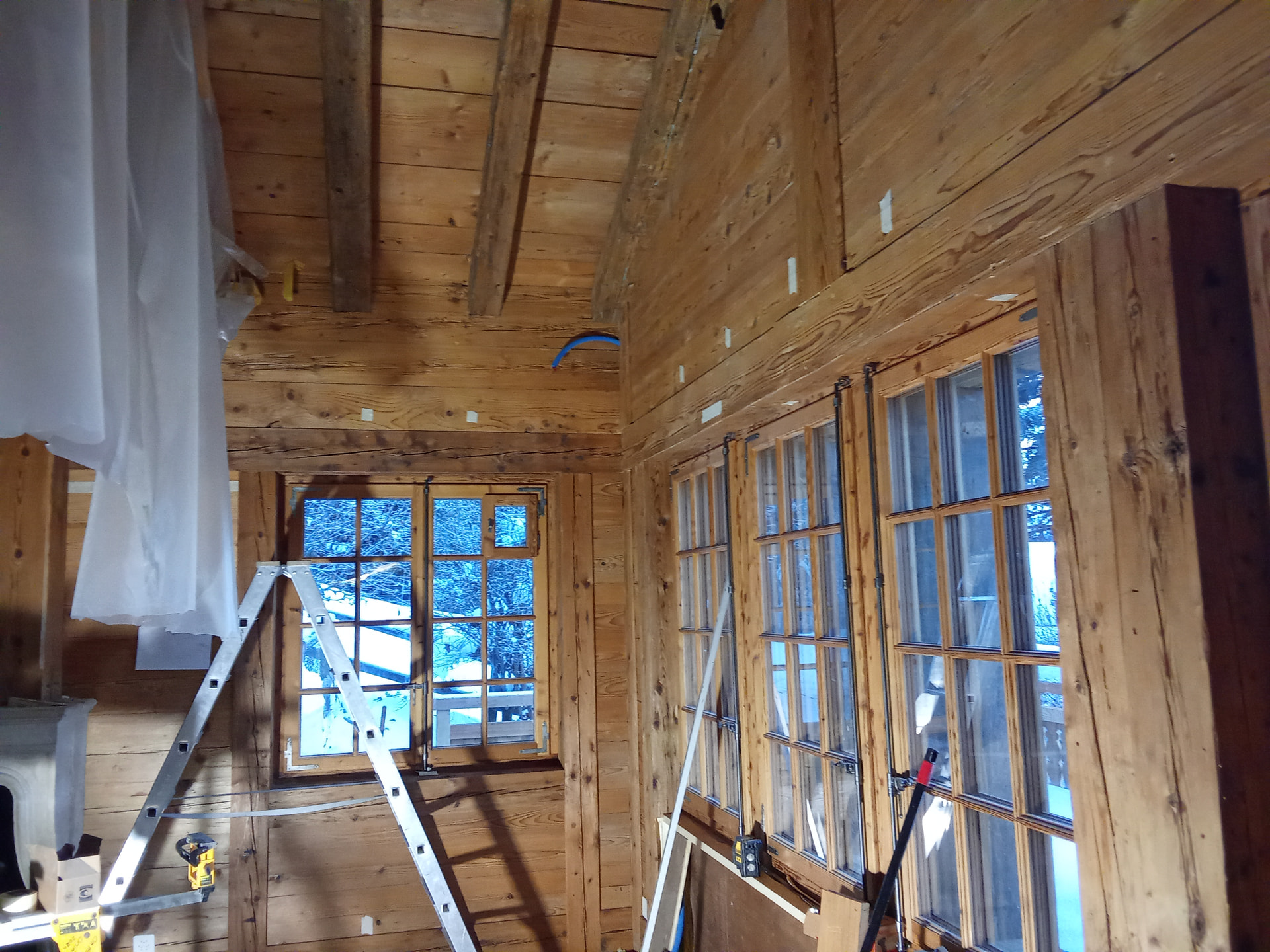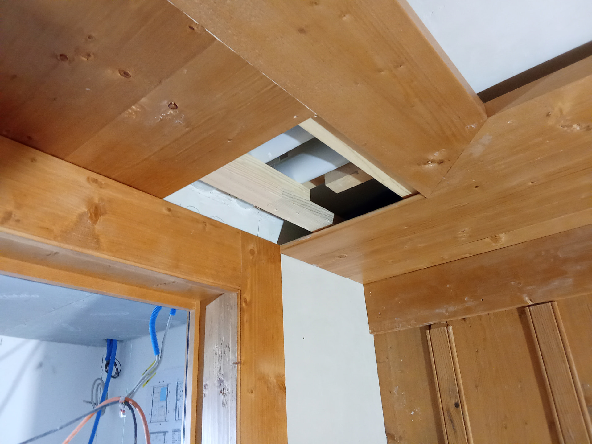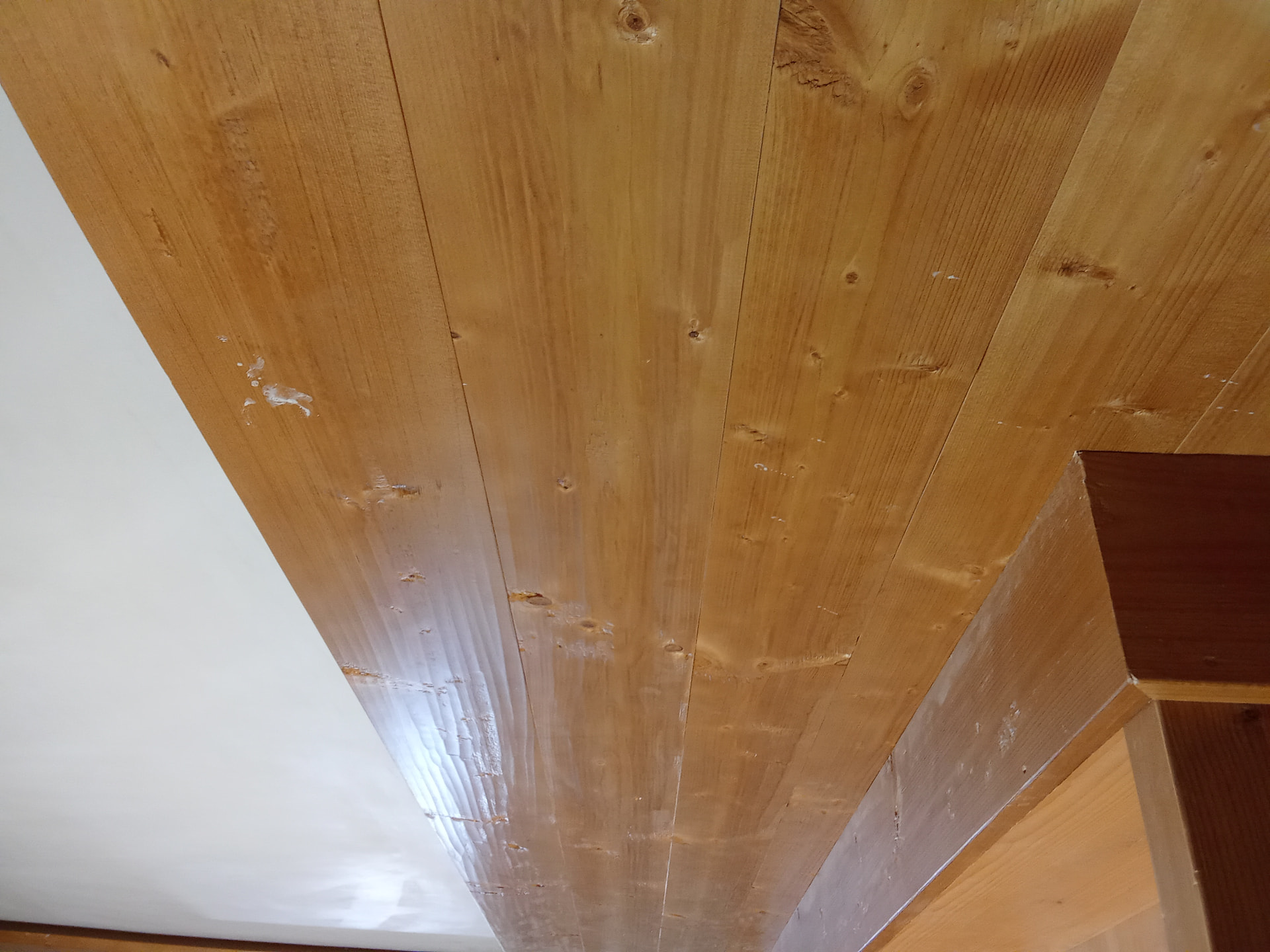 mientras que el plafón es de abeto, lama de 19 milímetros, cepillado a mano y tintado para conseguir igualarlo a la madera de la pared, es del mismo chalet, si se puede mecanizar y al mismo tiempo darle ese aspecto anciano