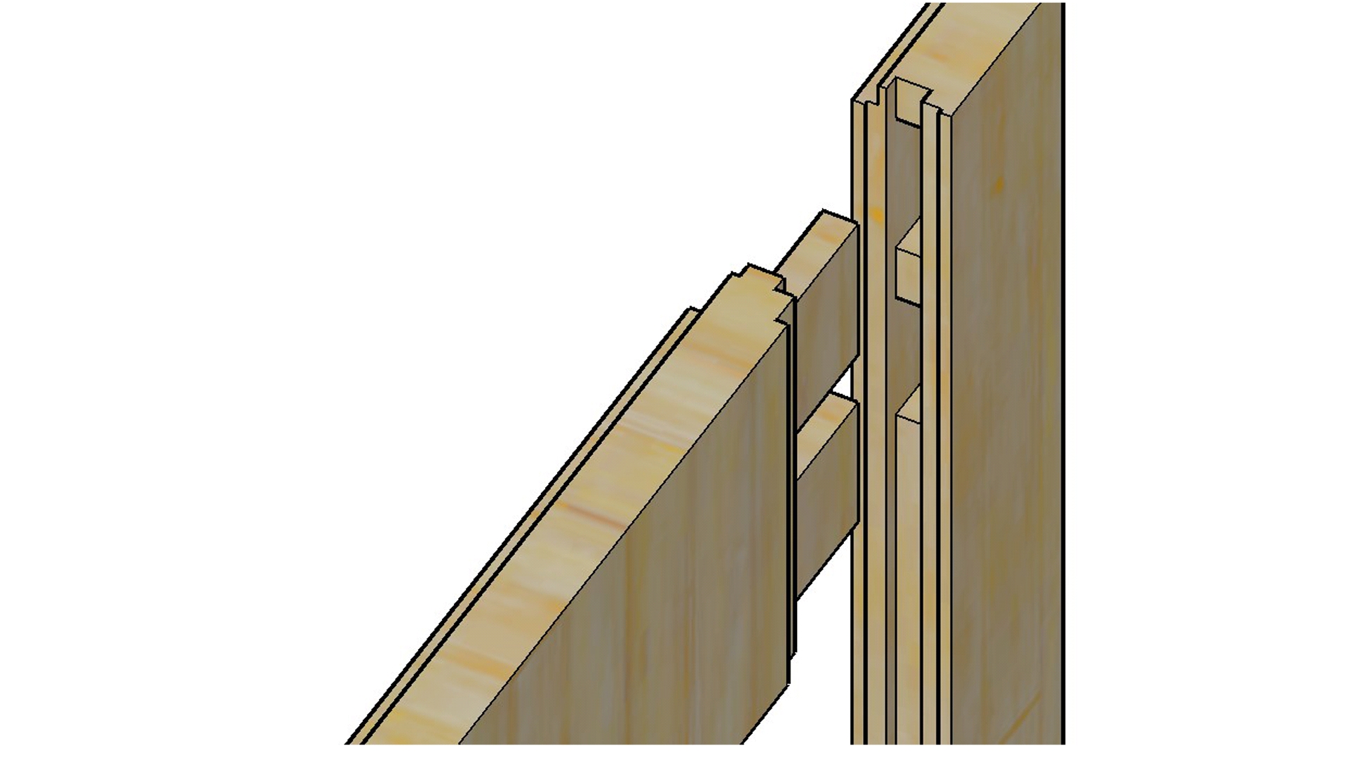No están dibujados como biseles, sino como redondeos, pero realmente son biseles. A la izquierda vista superior de la hoja (pie y barra); en el centro un entrepaño al que le falta el macho, a la derecha el conjunto