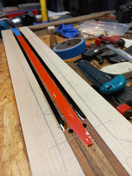 Yo también le meto dos pletinas de fibra de carbono a a cada lado, para añadir estabilidad, ya que la fibra de carbono no se ve afectada por los cambios de humedad como la madera.