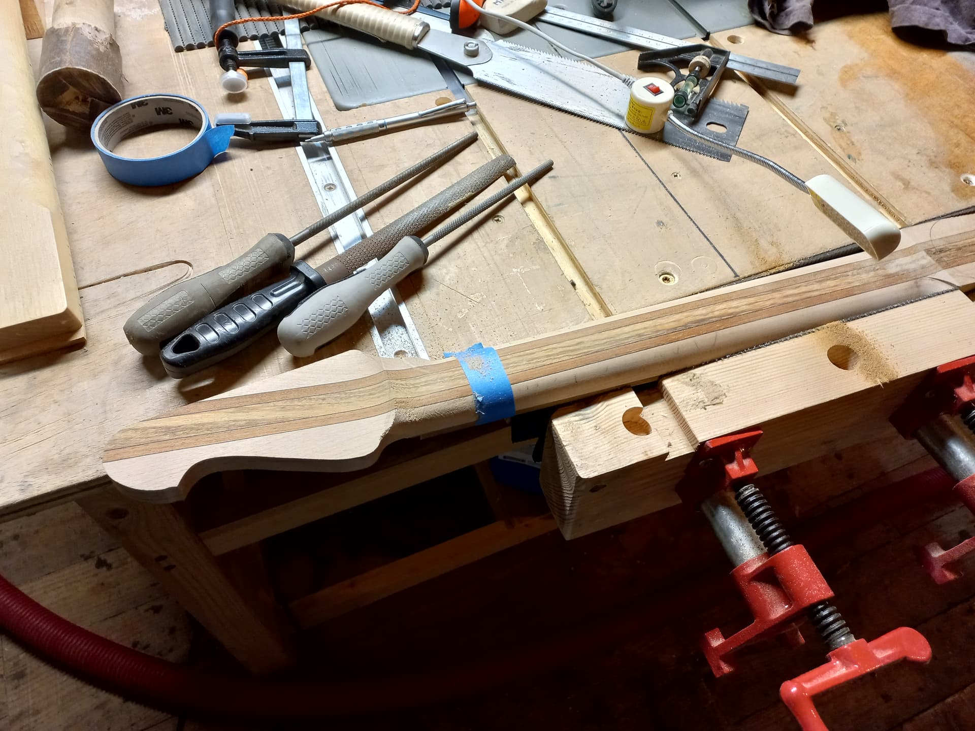 El diapasón se encola sobre el mástil, y con una plantilla y una fresa de copiar se le da la forma definitiva.