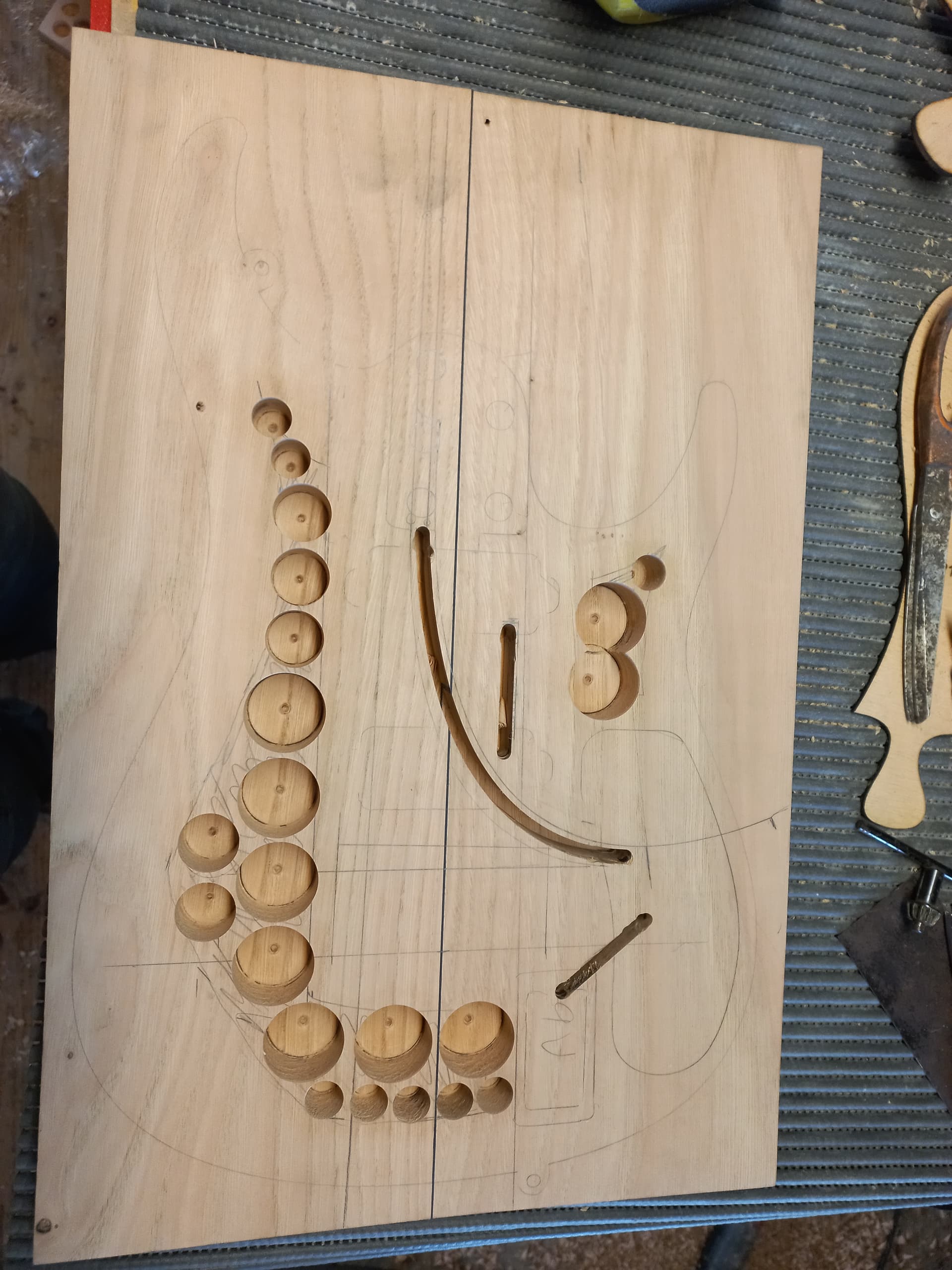Después darle la forma, orificios para pasar las cuerdas, taladros para colocar el puente, cavidades para las pastillas, para el cajetín de la pila de 9v por si se utiliza electrónica activa, tornillos del mástil… el zócalo para el mástil…