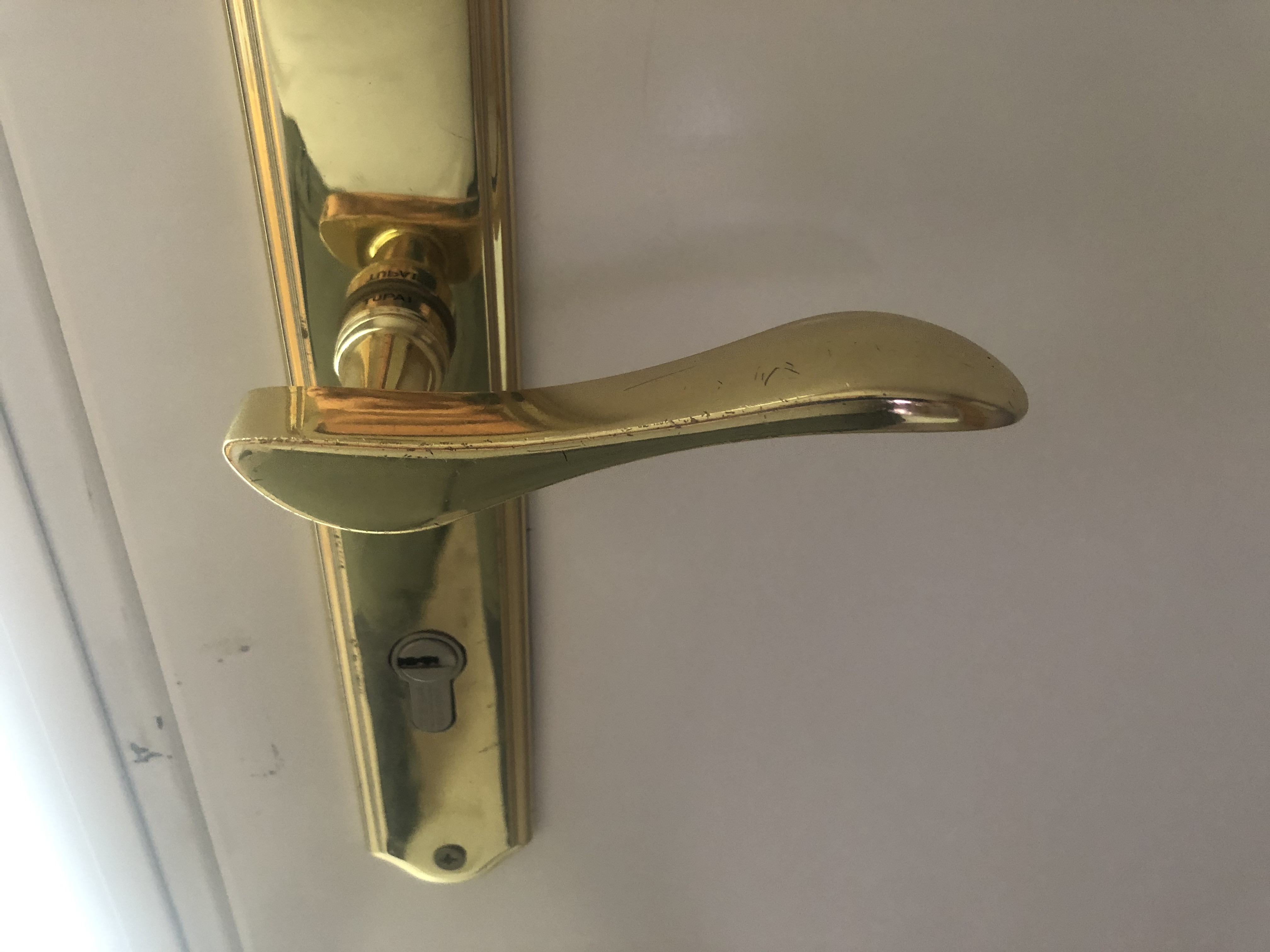 El primero de una manilla (la pareja de esta que os enseño, que como es la puerta de la calle no lleva manilla fuera). De la parte cilíndrica pegada a la puerta he sacado la virola del cuchillo de marcar de verruga de latón.