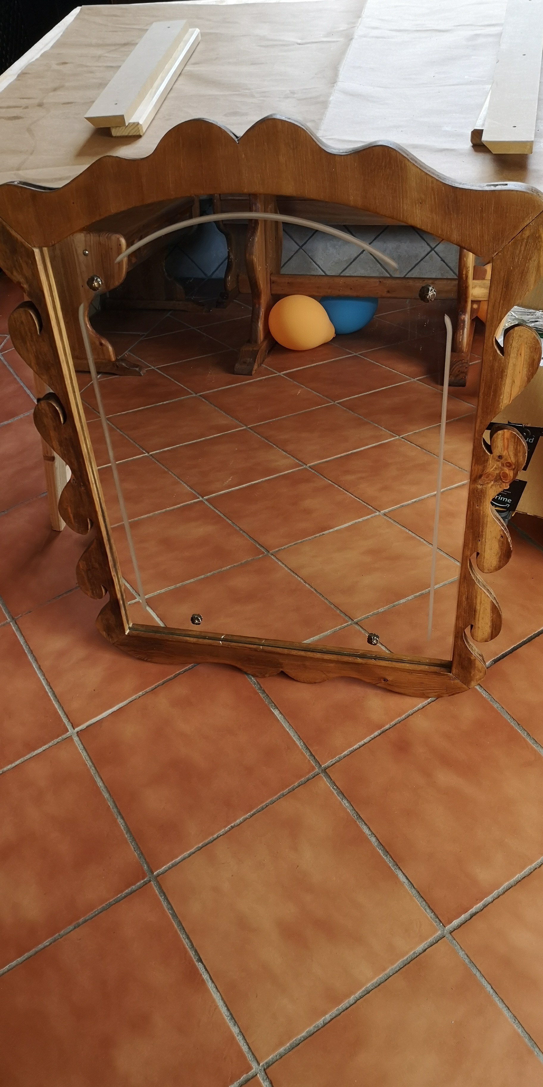Un espejo que fabricó mi suegro con retales para mi xurri que en su día lo pintó de gris para guardar la estética de lo que tenía y que después de mudarnos no nos encajaba en ningún lado.