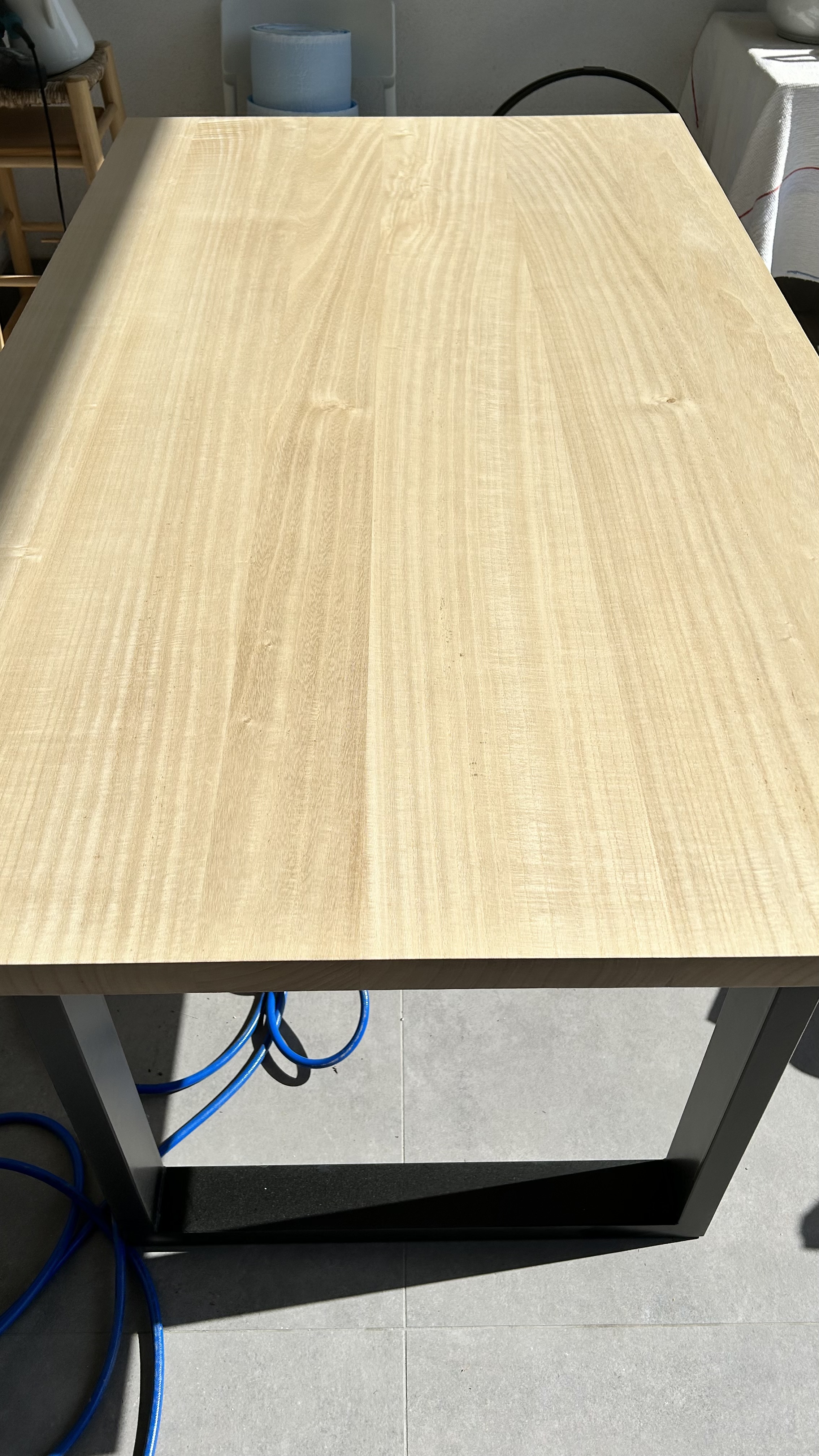 Pues la primera prueba con la pawlonia, simplemente un tablero de 38 mm sobre patas de hierro, acabada con barniz al agua satinado.