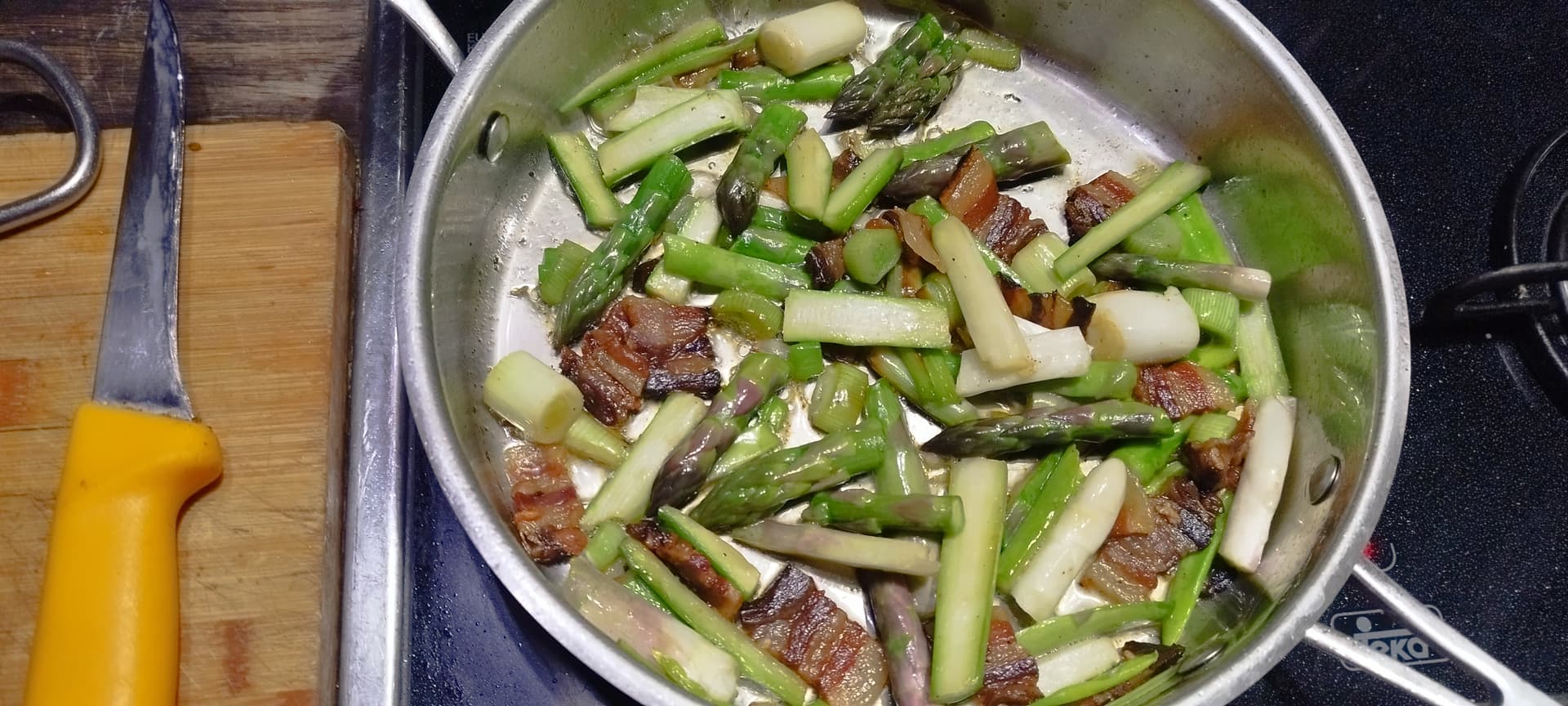 Panceta ahumada ,echar el exceso de grasa, esparagos y cebollas tipo calsot salteados, vino blanco pata desglacear, bajar fuego, una cucharada de concentrado de tomates, y ir mojando poco a poco con el caldo almidonado de la pasta.