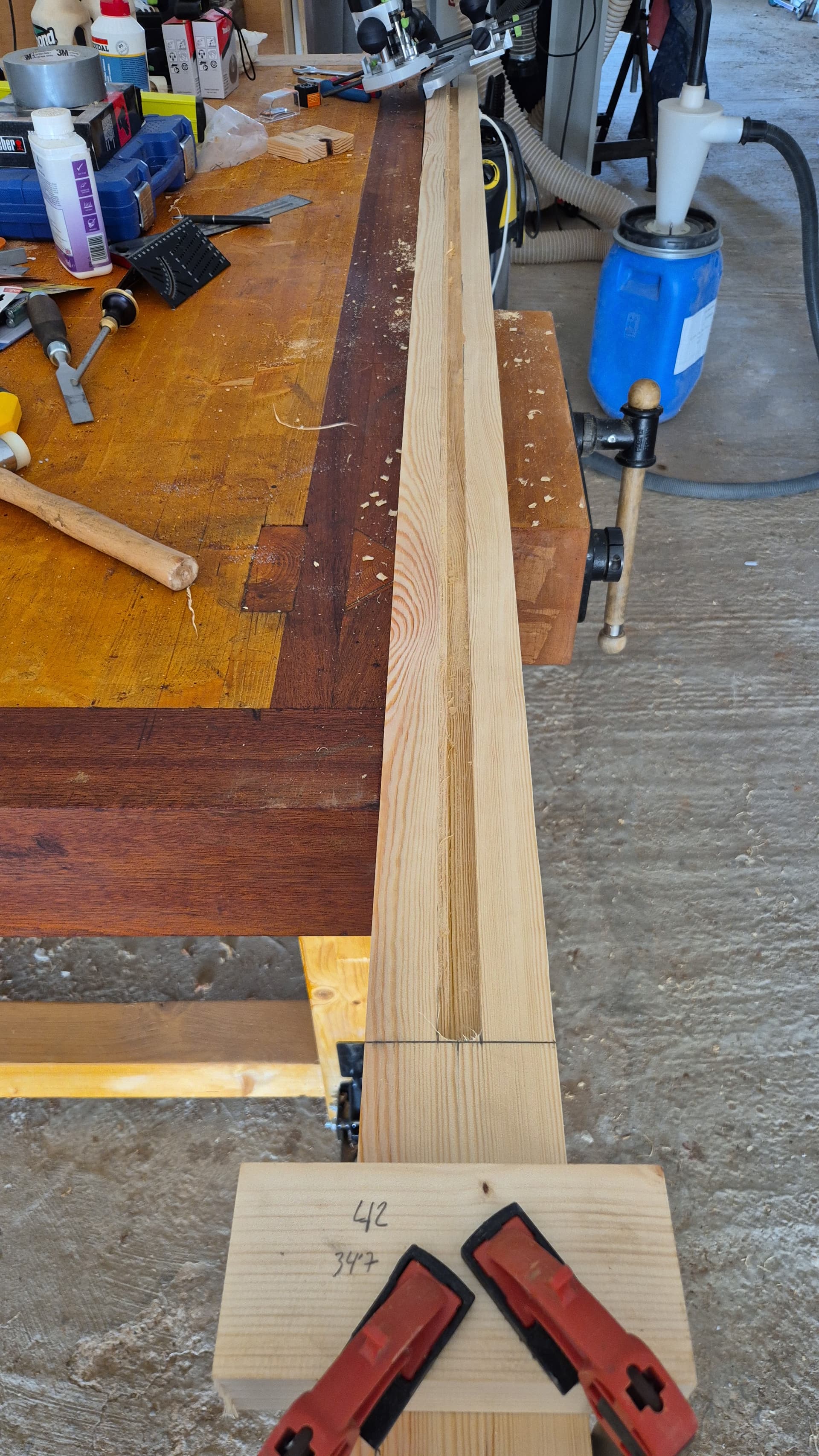 Mas bien son cuatro dos por lado. El canal es de 2cm con lo que hago una pasada a la mitad y luego otra pasada con el resto, eso repetido ya que la fresa es de 11mm y el canal son 22mm de ancho.