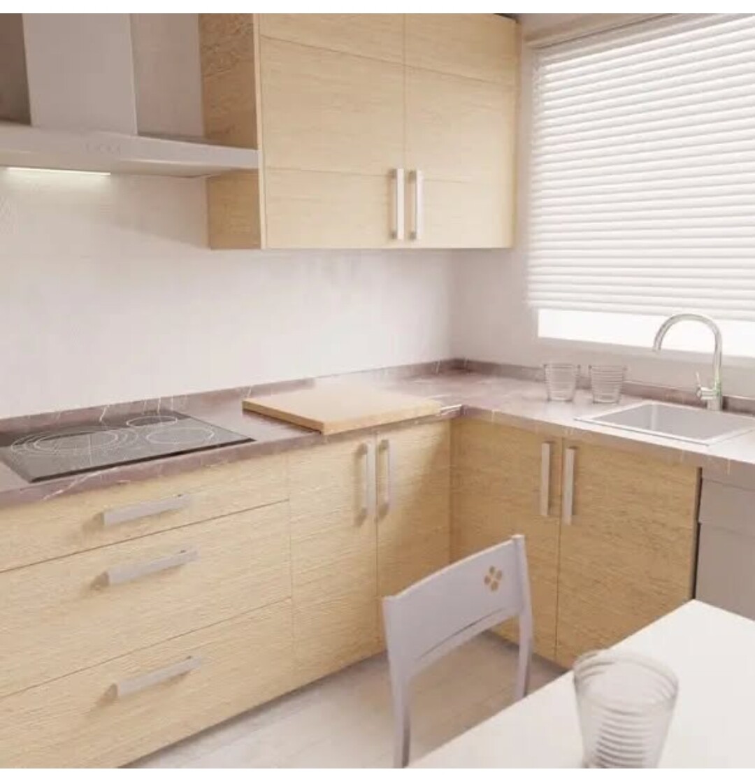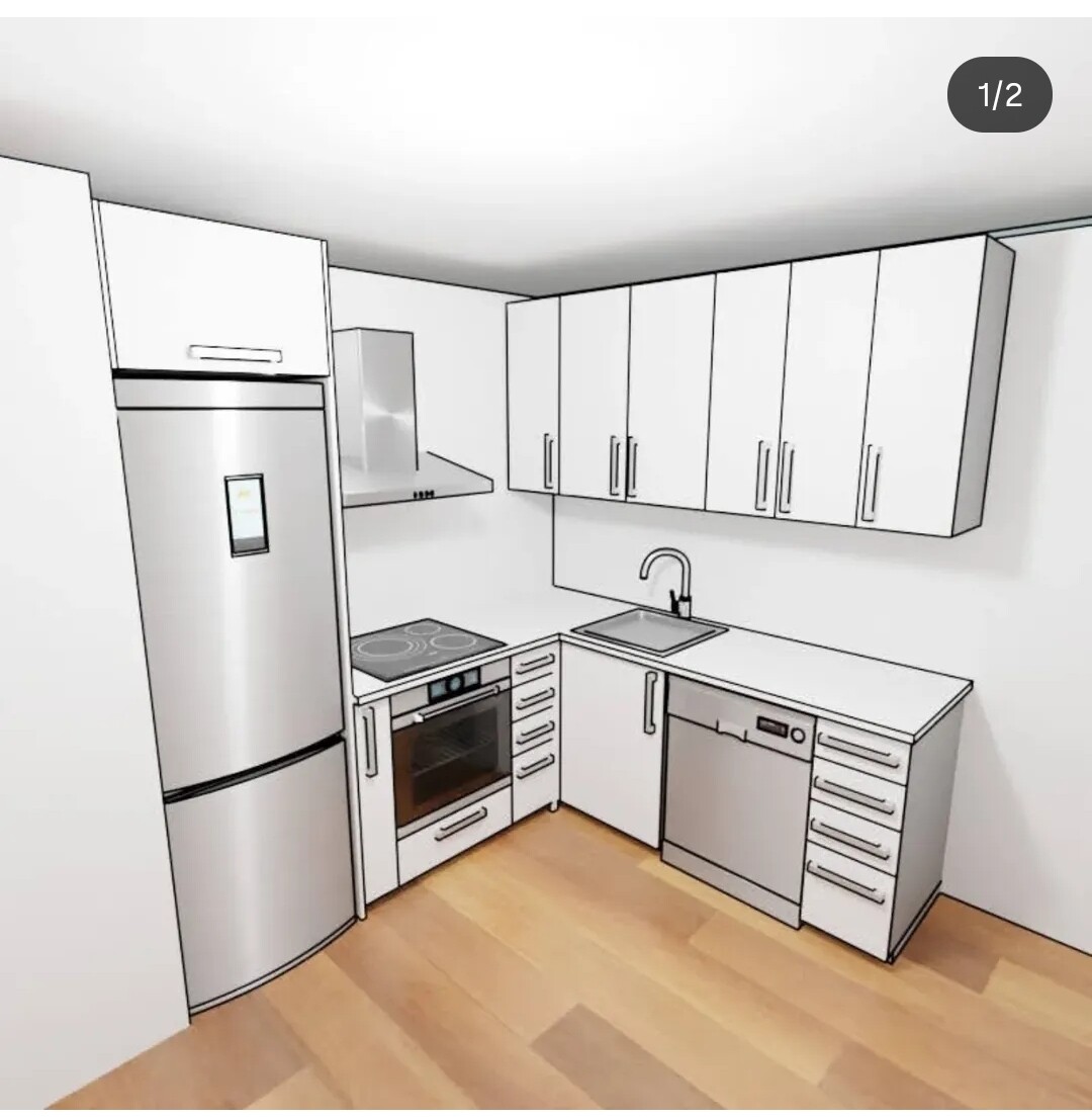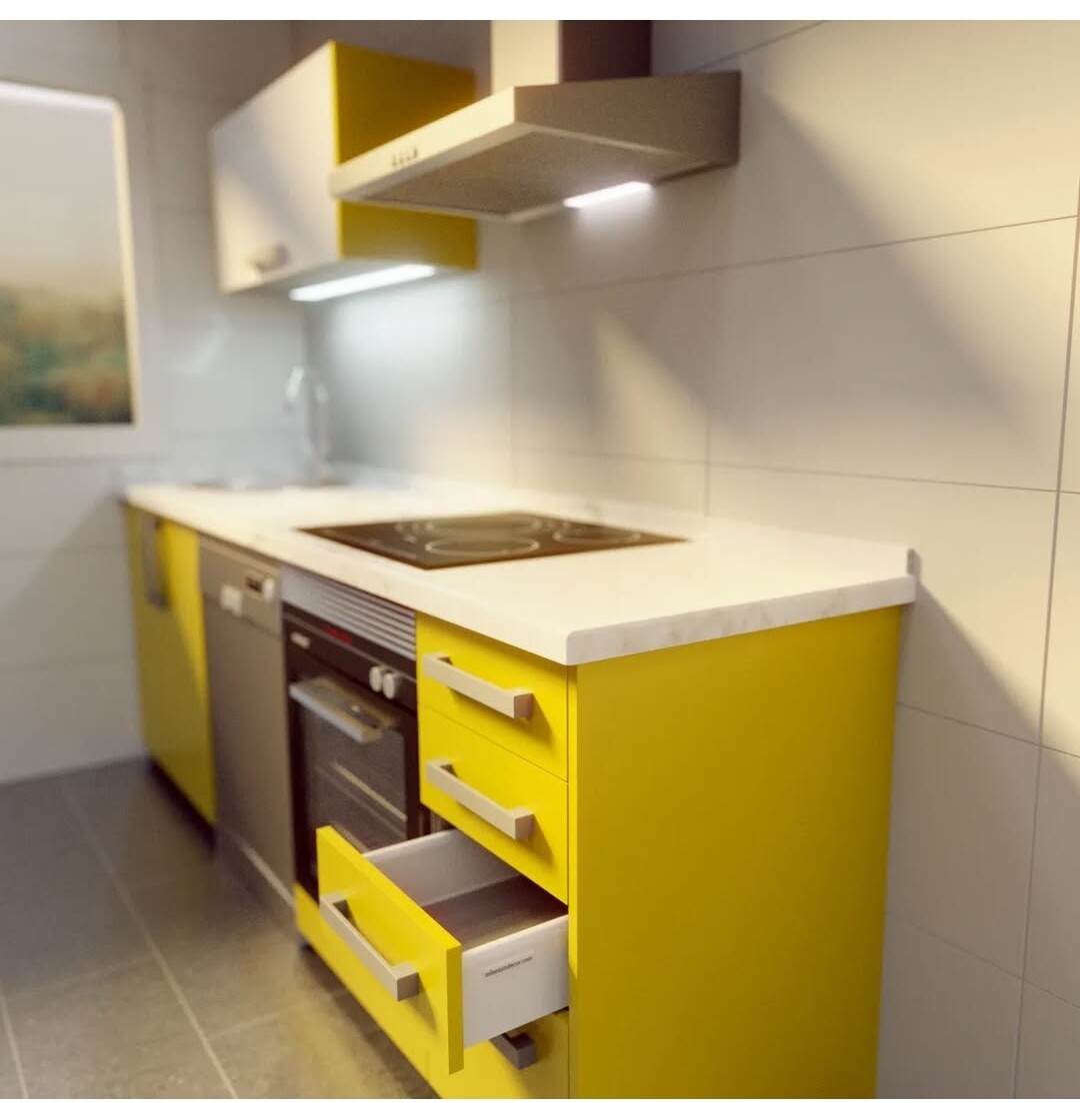 Mira, me he entretenido 10 min. para que veas, como con Blender, con mi archivo que tengo configurado con mis muebles, en 10 min. puedes hacer un pequeño boceto de cocina (aunque se puede personalizar y hacer lo que quieras obviamente, no hay límite).