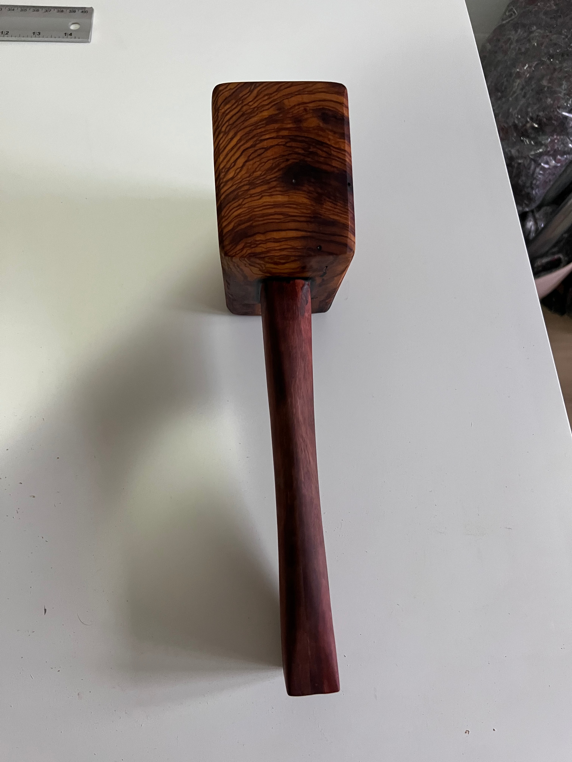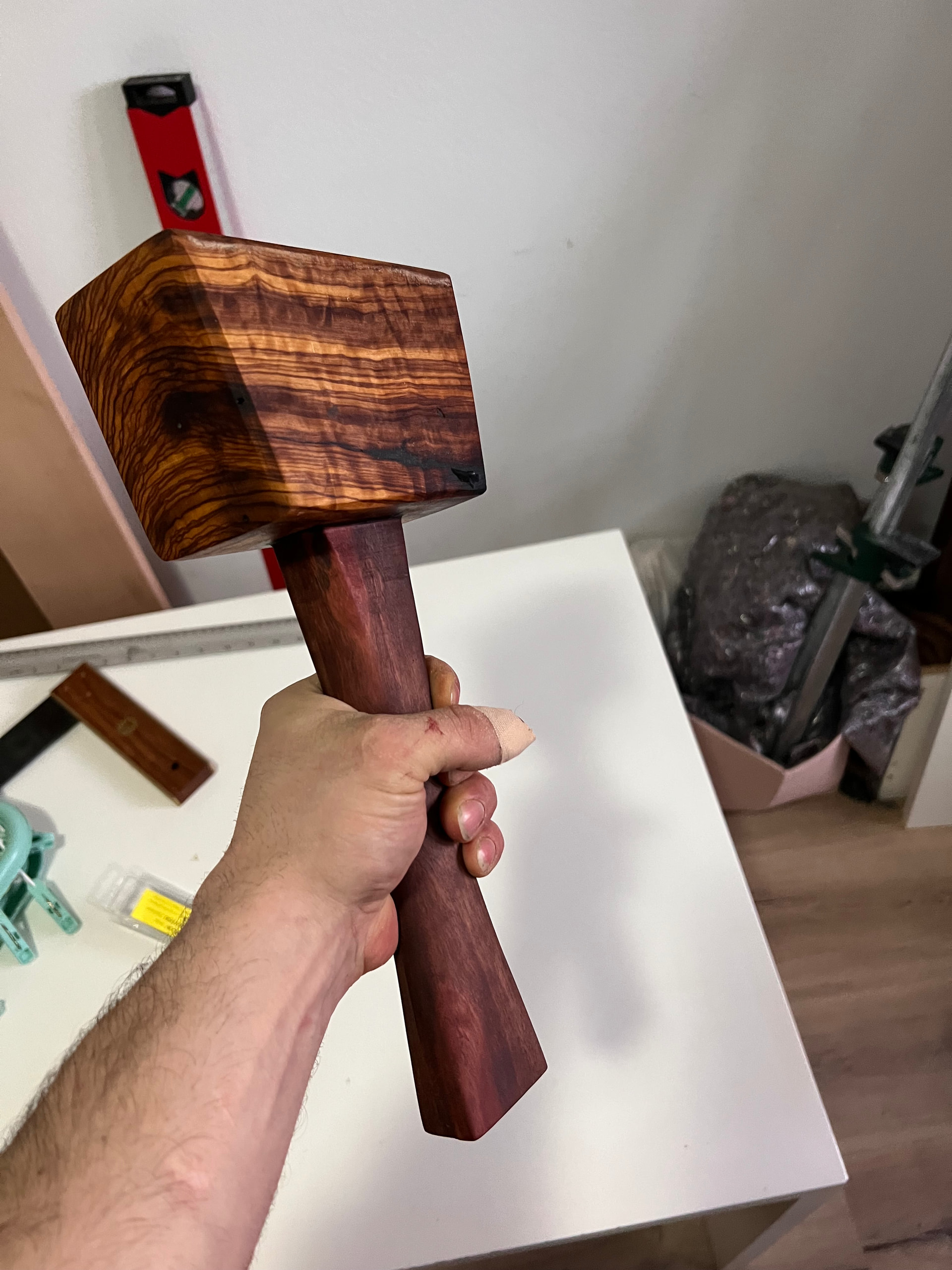 Pues como todos que juegan con la madera , hice un mazo , todo esta hecho con herramienta manual . El cabezal es madera de olivo y el mango de un cacho de pallet que tenía un color bonito , ni idea que es