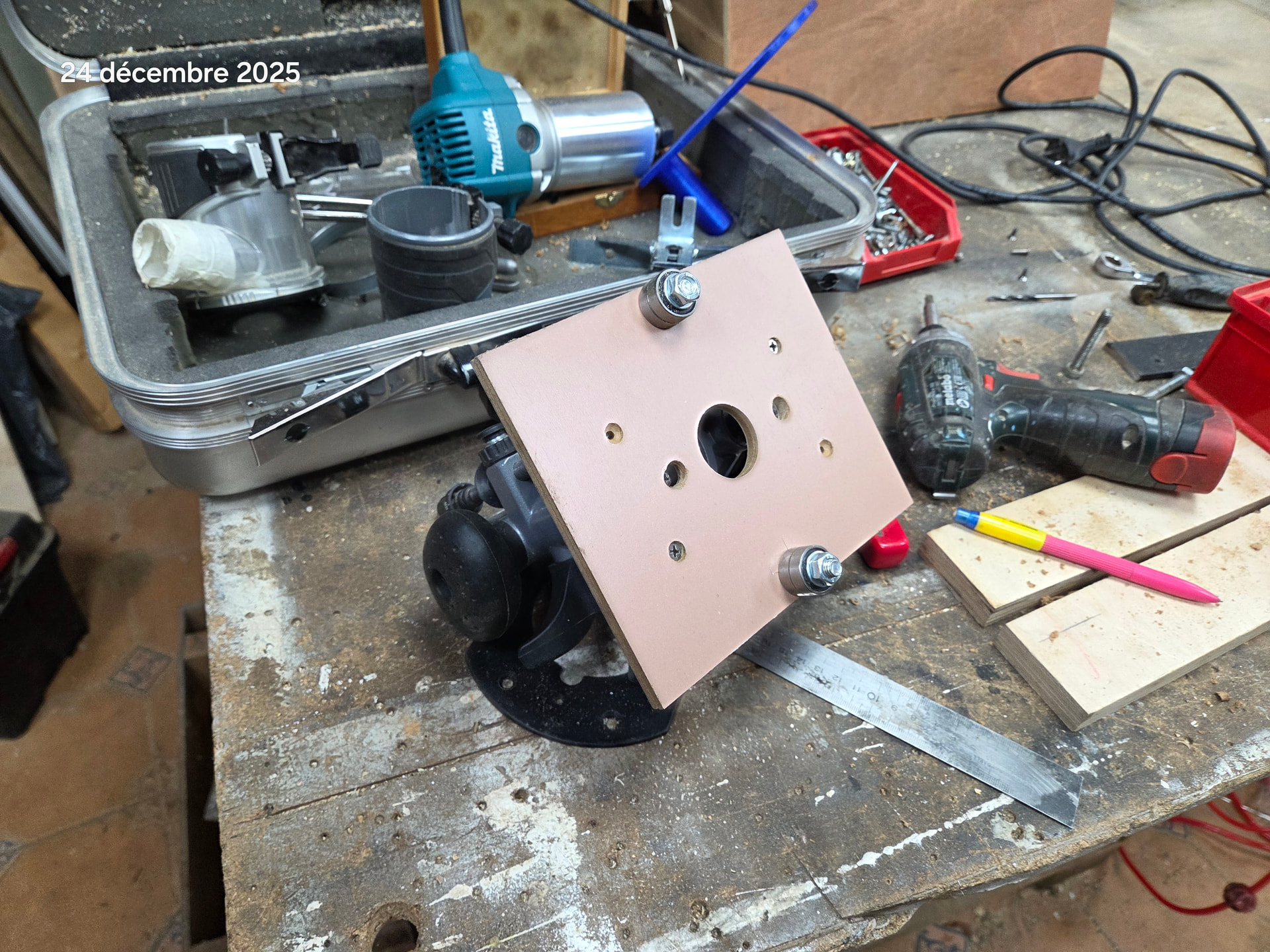Hace unos dias meses toco hacer lo mismo, pero yo utilice la festool 1400, con el tope de profundidad. Ahora viendo tu invento con la makita habría resuelto. Para un futuro….