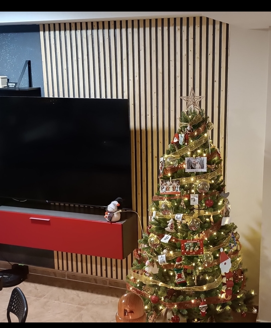 En la foto no se aprecia, pero esa pared era negra con purpurina de colores, de forma que con la luz se siguen viendo esos reflejos entre los perfiles de madera, parece que no, pero es entretenido, se me habran ido unas 3 horas en el taller fabricando perfiles, y otras 2/3 en casa colocando.