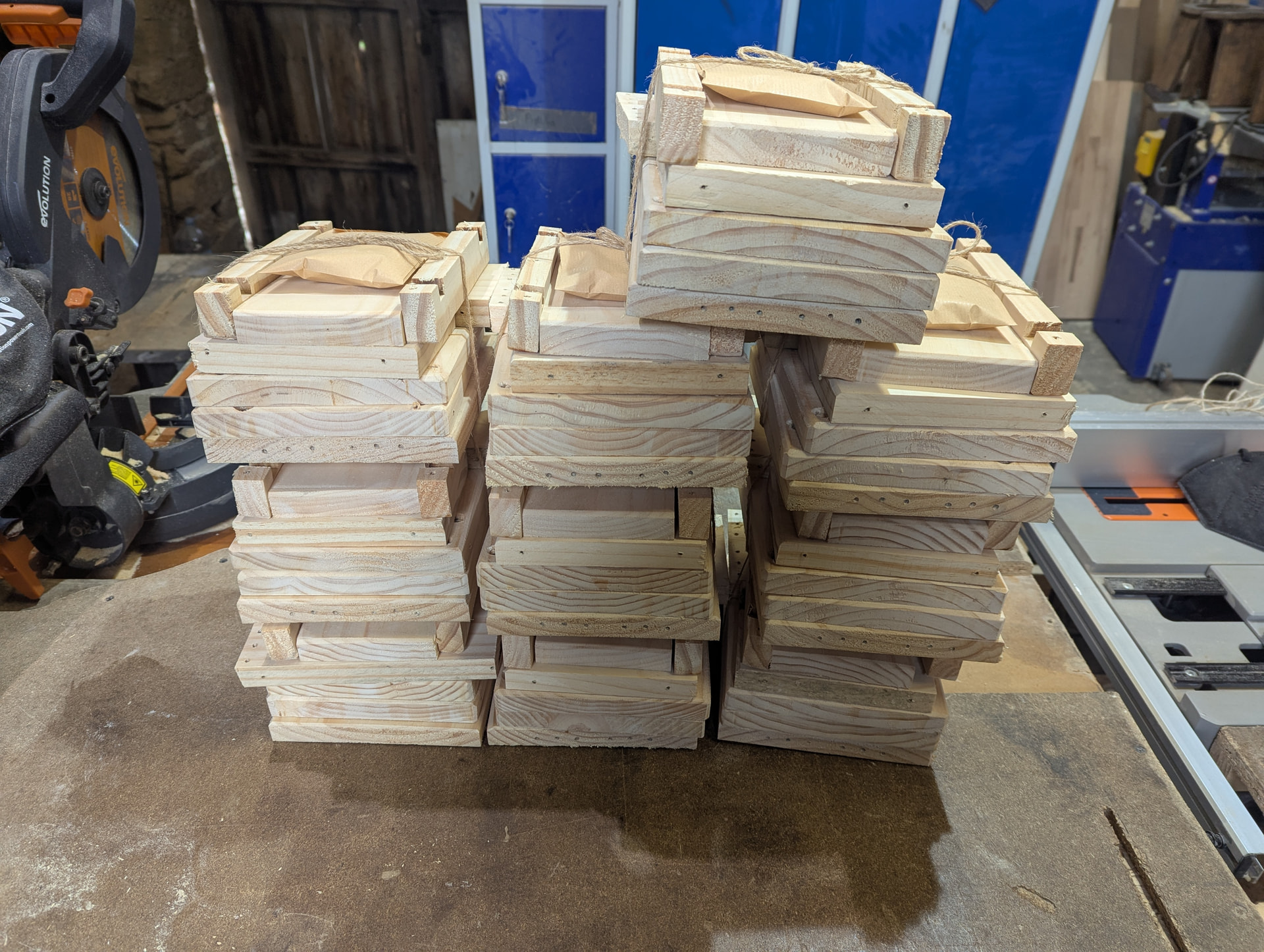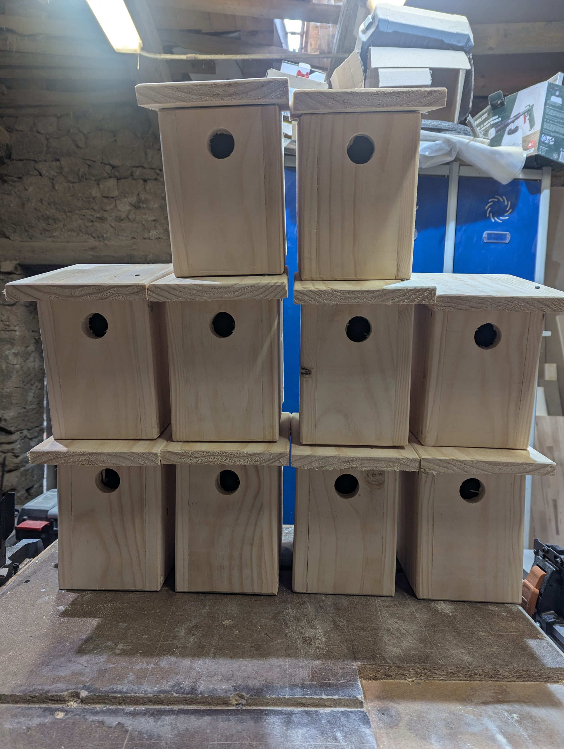 A mi hoy me tocó juntar mis dos trabajos, hacía mucho que no hacía cajas nido. Estas van para una actividad en Doñana. Primero montadas y luego ya empaquetadas para hacer el taller